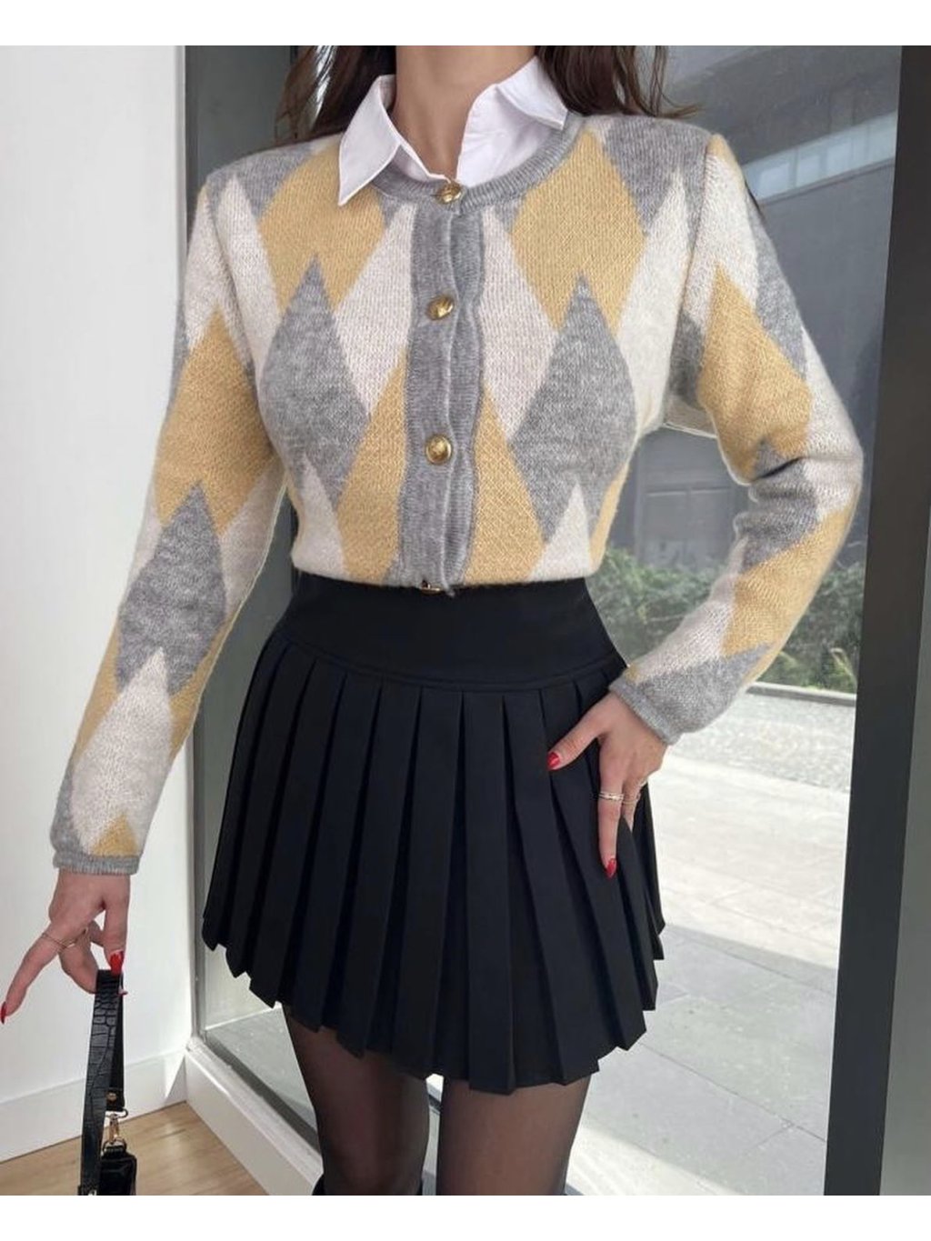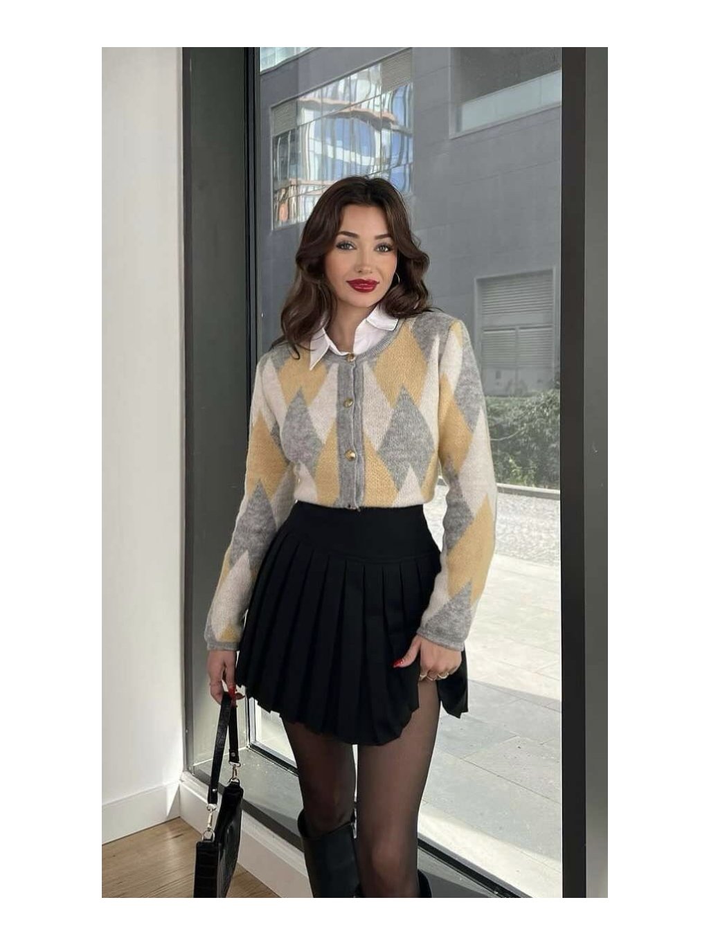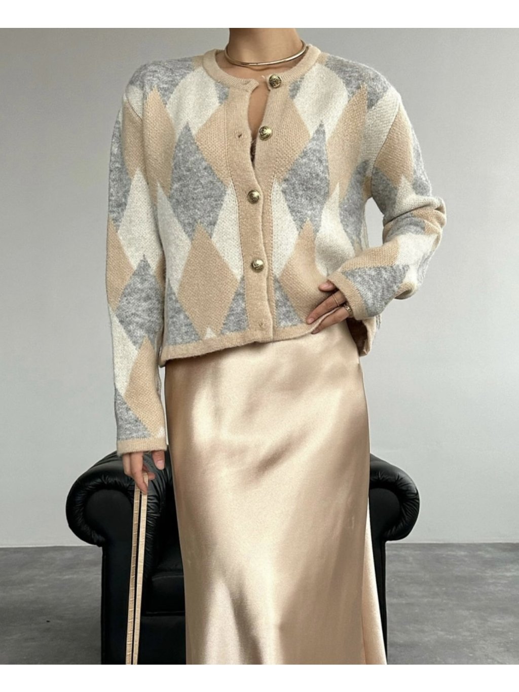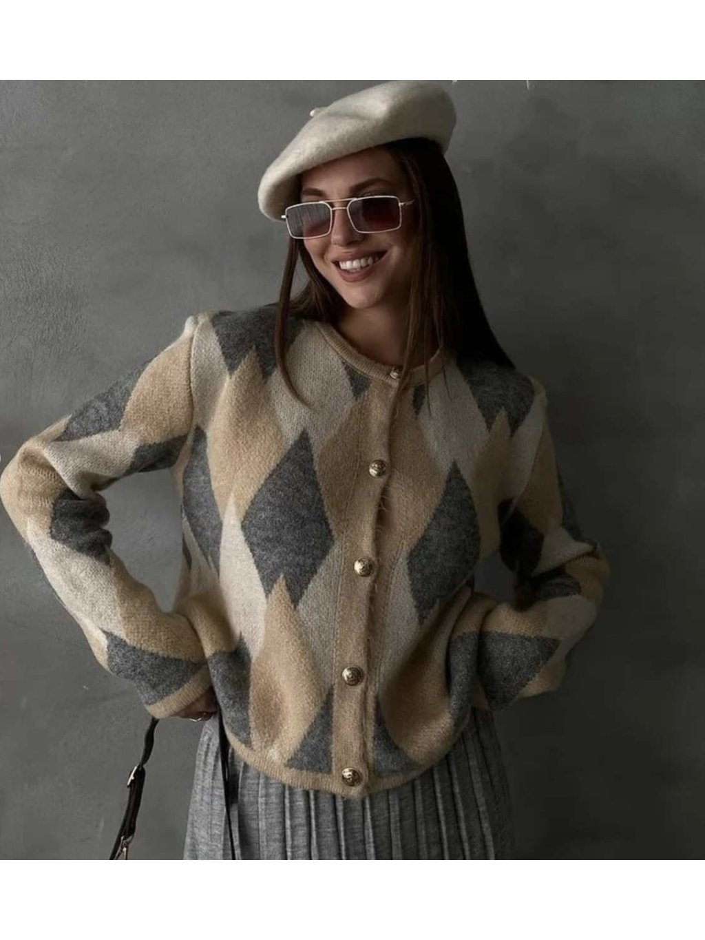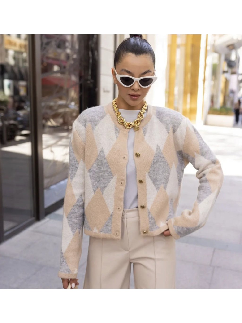 Cardigan s výrazným káro vzorem, stříbrné velké knoflíky. Materiál je hutný, drží tvar.