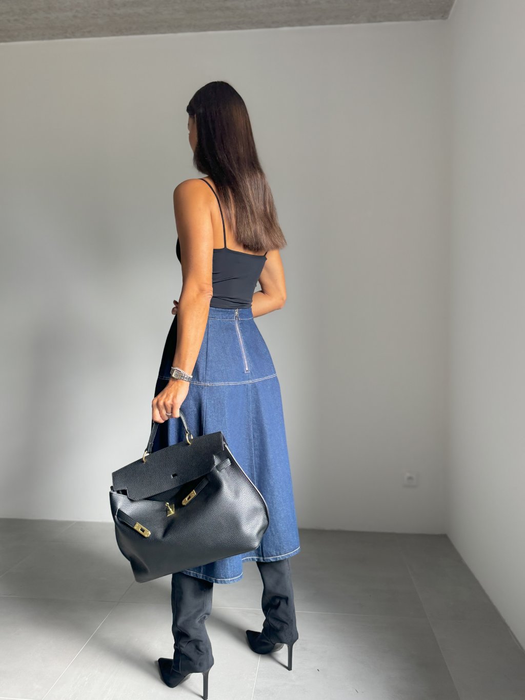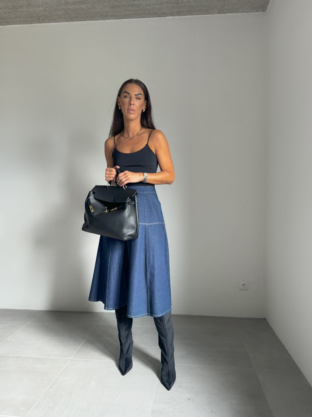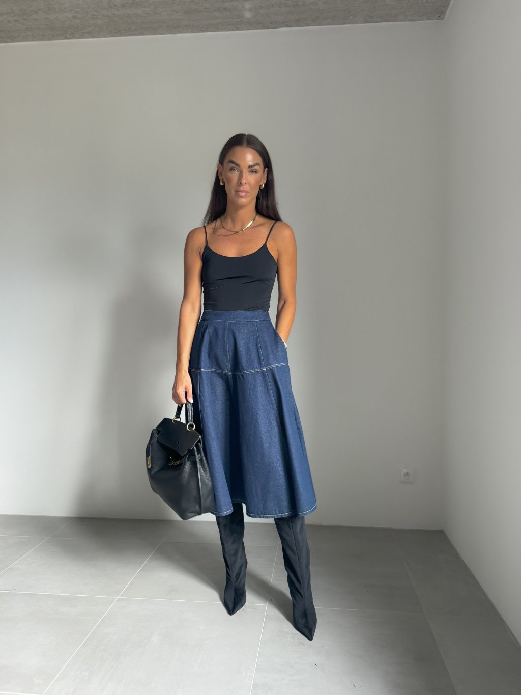 Denim kolová midi sukně, zapínání na kovový zip v zadní části, vysoký pas, boční kapsy.