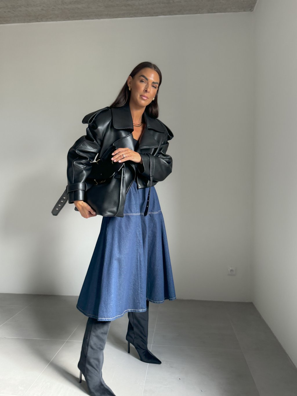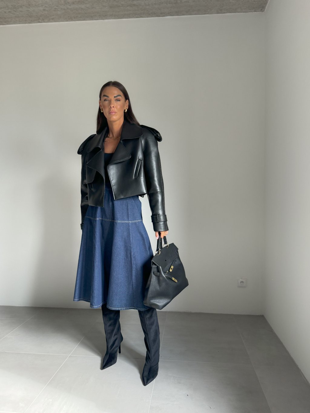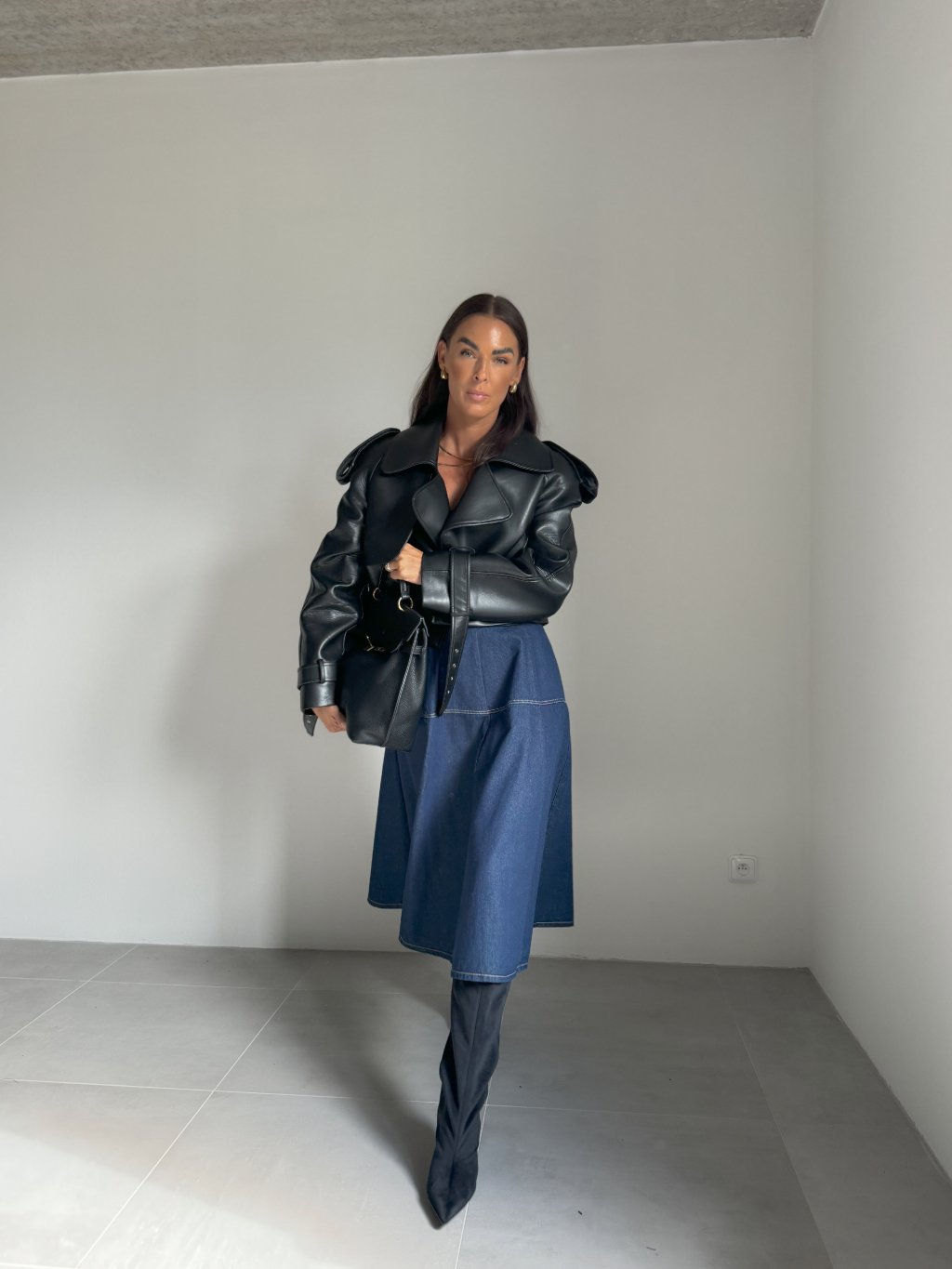 Denim kolová midi sukně, zapínání na kovový zip v zadní části, vysoký pas, boční kapsy.