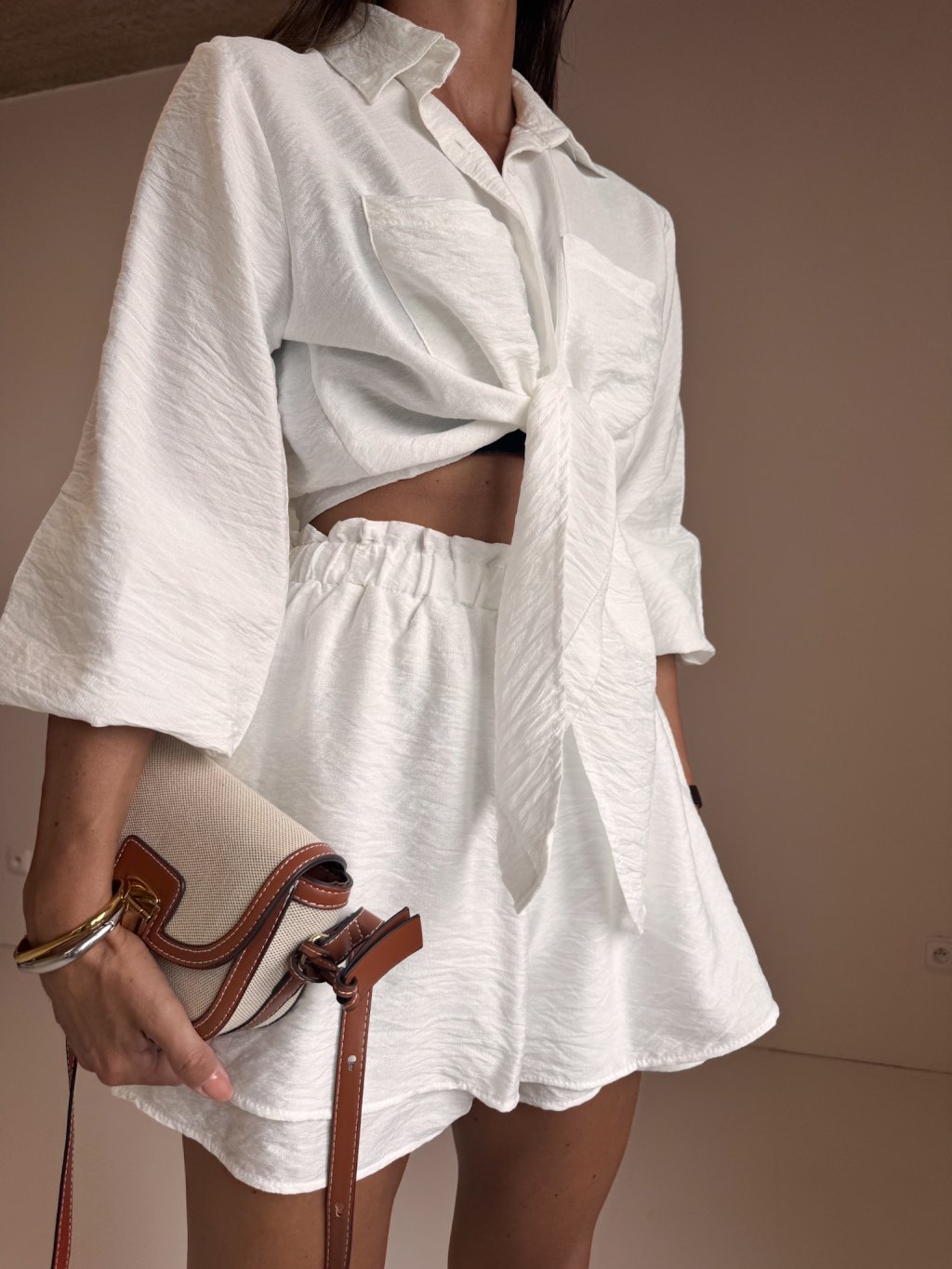 Letní komplet košile a šortek. Košile volnějšího střihu, kratší délky, vpředu cípy na zavazování, na prsou kapsy, rukávy zakončeny gumičkou.