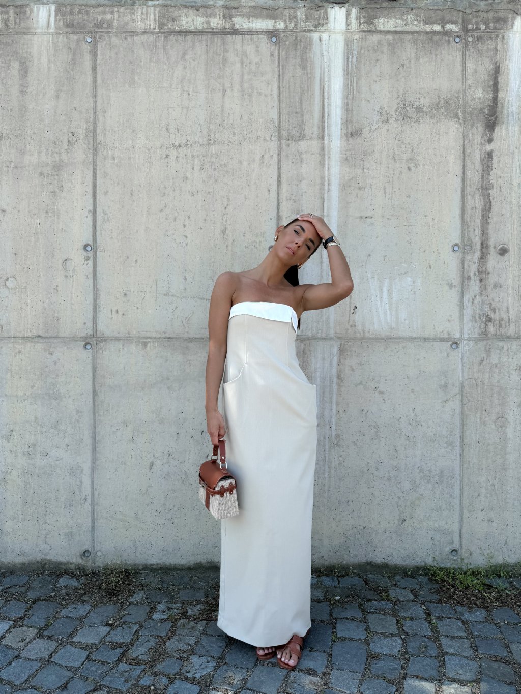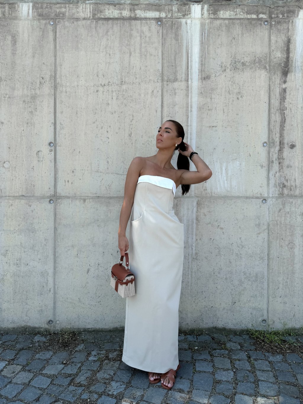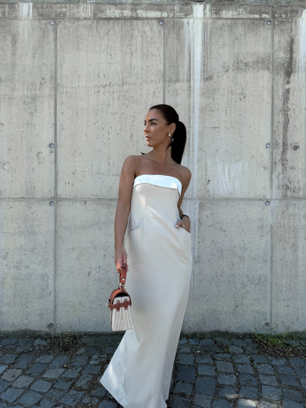 Korzetové maxi šaty, vrchní část zpevněna, mírně vypasována. Boční kapsy, vzadu rozparek, zapínání na zip na zádech. Součástí je podšívka.
