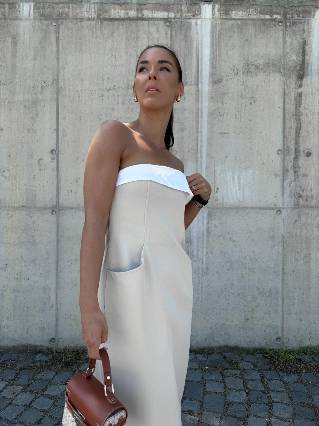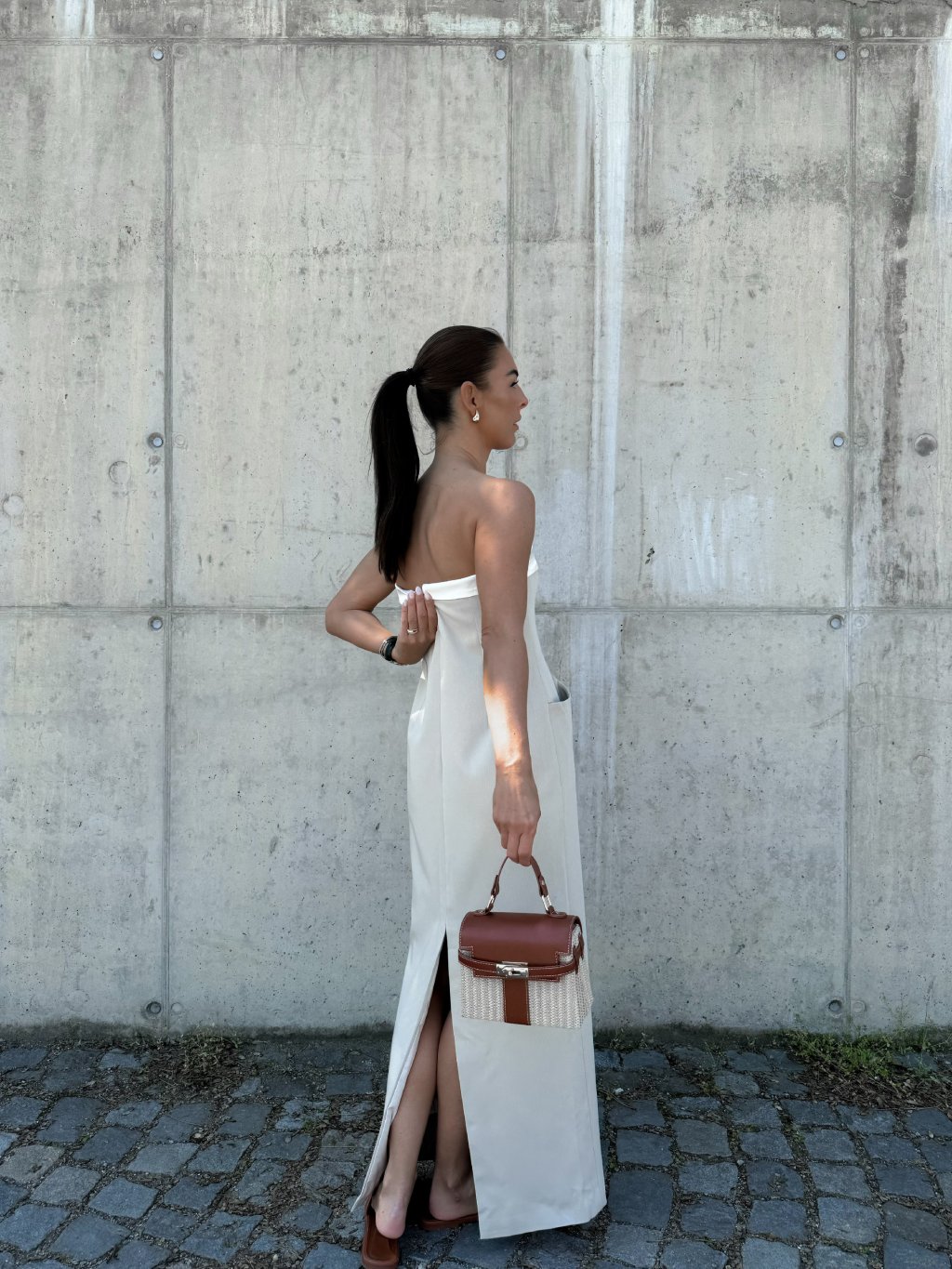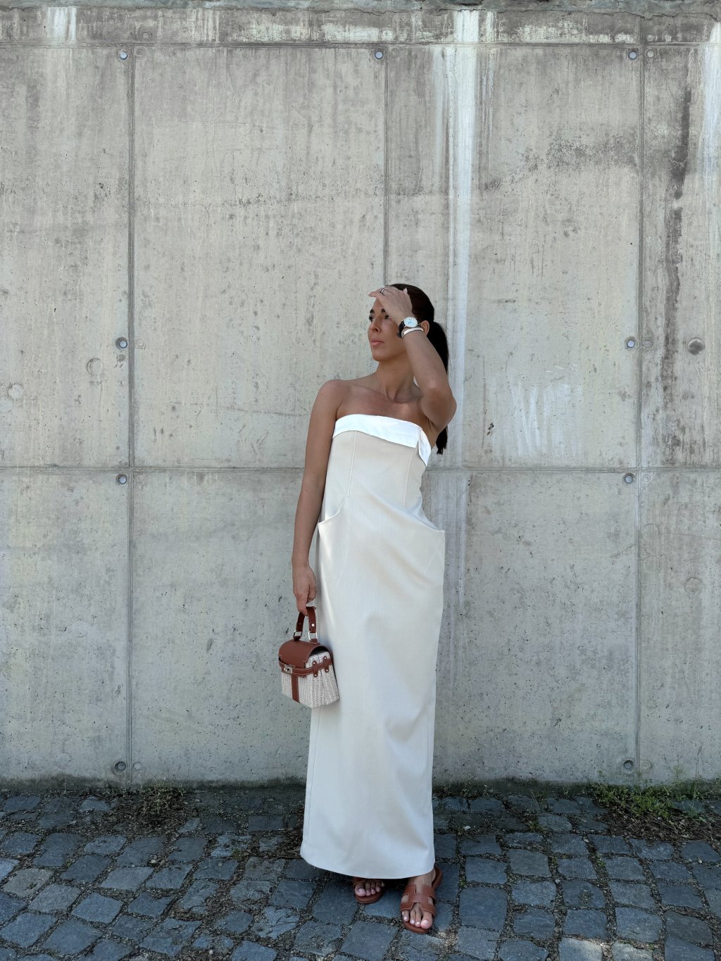 Korzetové maxi šaty, vrchní část zpevněna, mírně vypasována. Boční kapsy, vzadu rozparek, zapínání na zip na zádech. Součástí je podšívka.