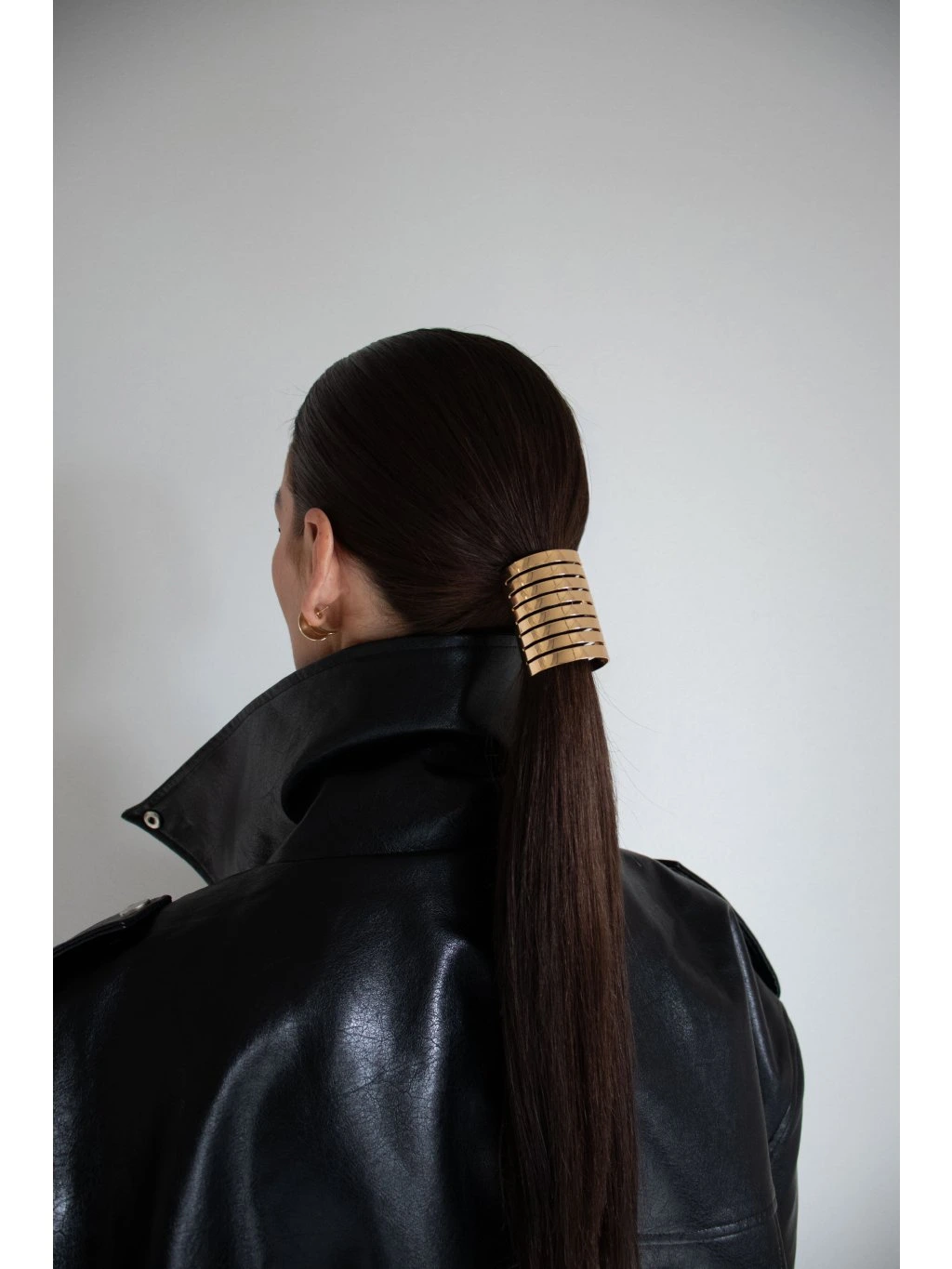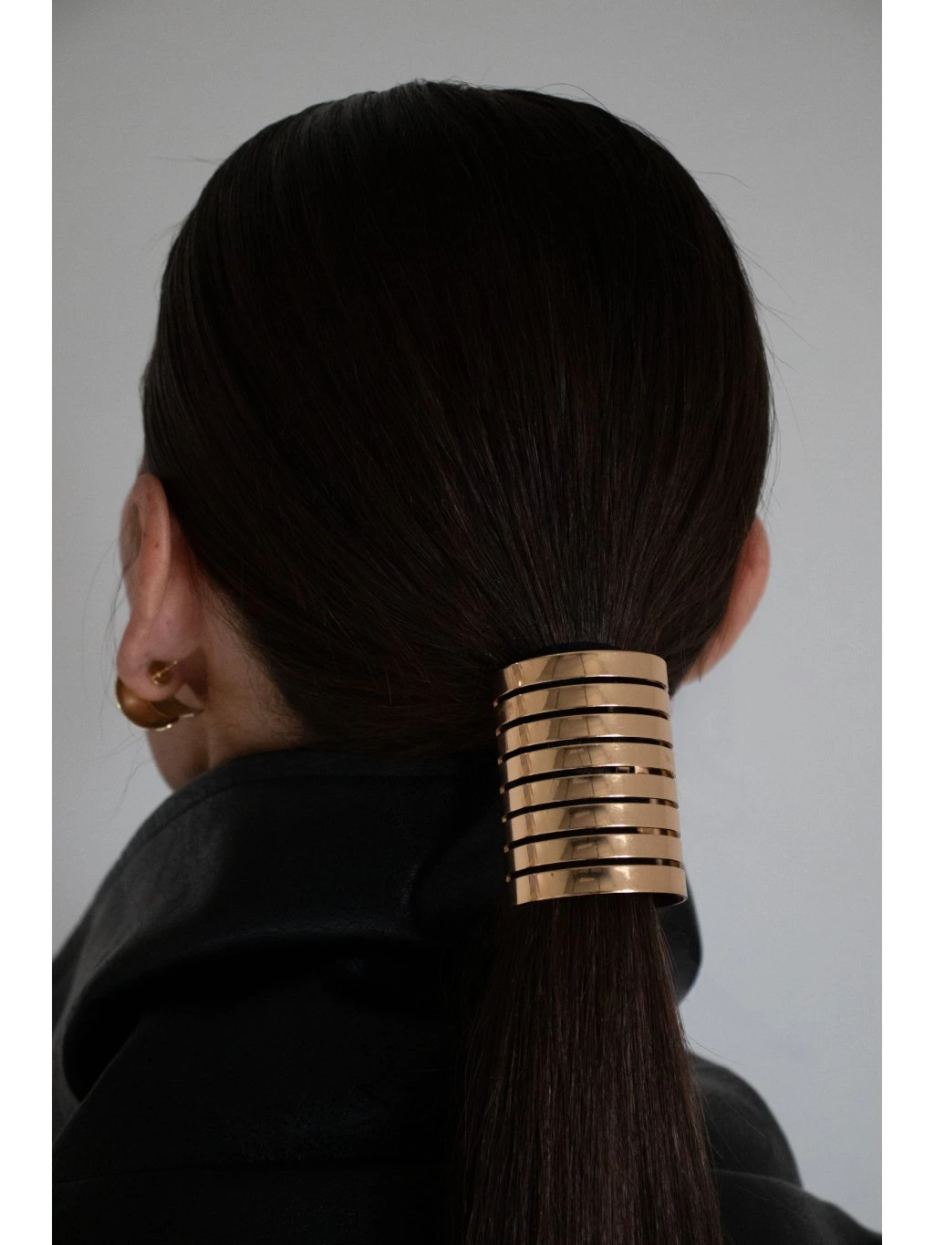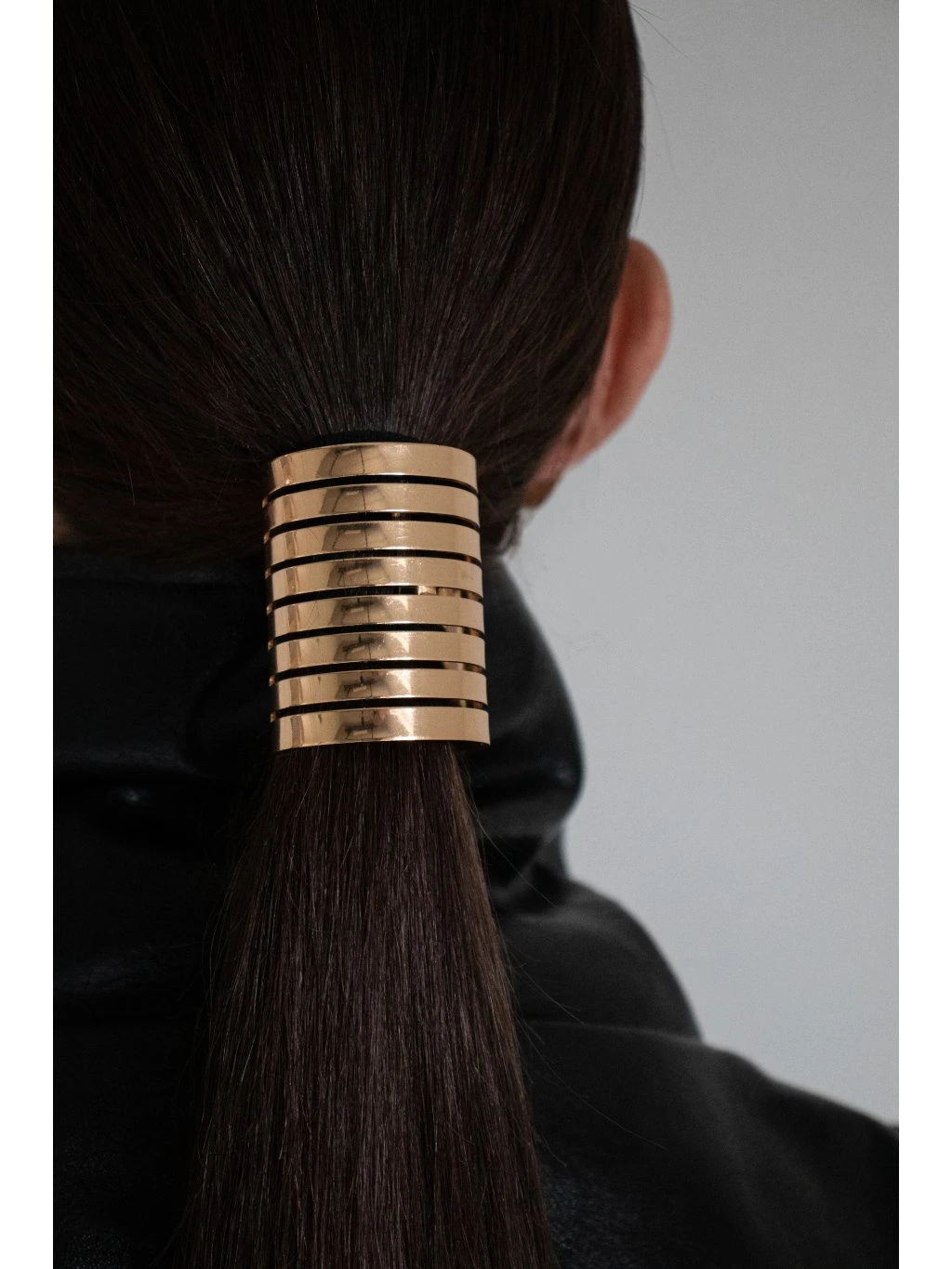 Kovová ozdoba do vlasů - na cop v podobě otevřeného válečku s lamelami. Uprostřed je háček s černou gumičkou.