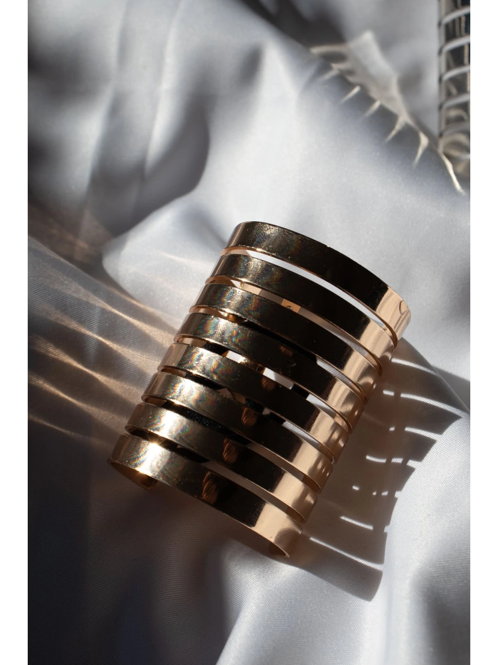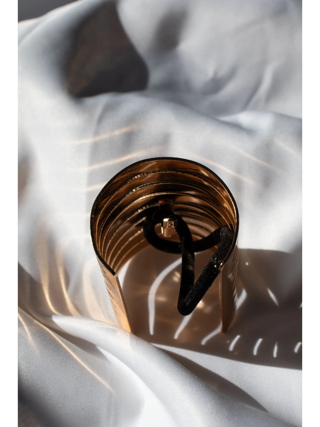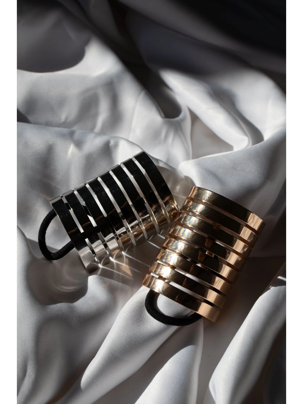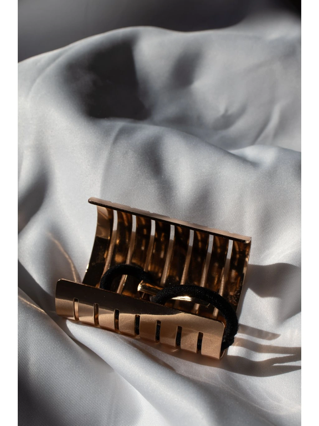 Kovová ozdoba do vlasů - na cop v podobě otevřeného válečku s lamelami. Uprostřed je háček s černou gumičkou.