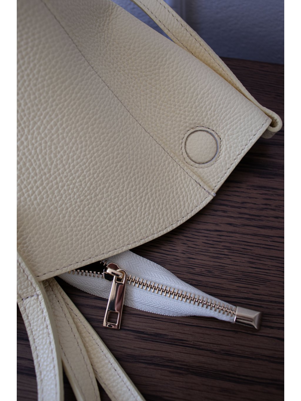 Uvnitř menší kožená taštička o rozměrech 17x22 cm se zapínáním na zip.
