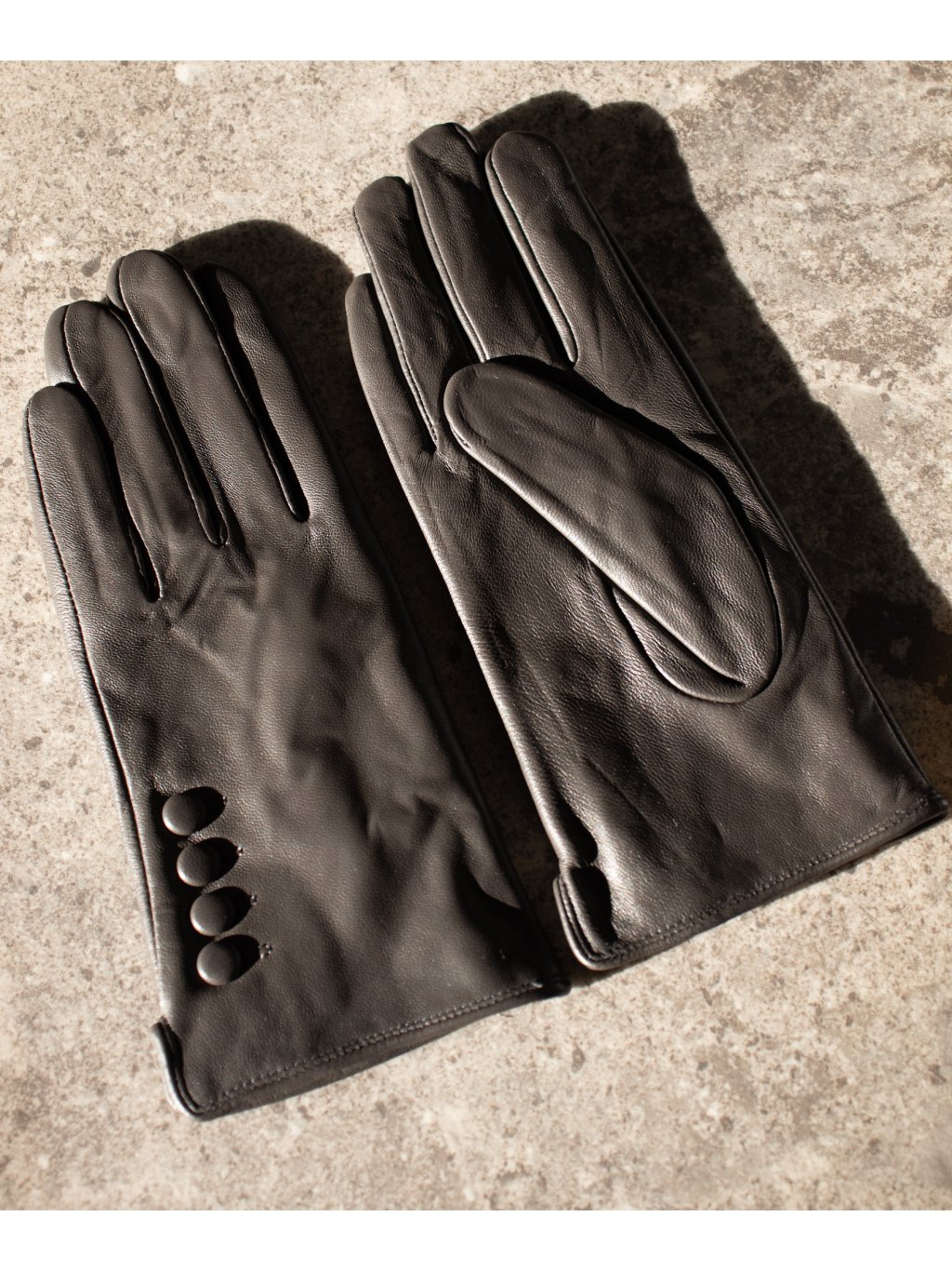 Kožené rukavice, uvnitř jemný kožíšek, ozdobné knoflíčky, délka nad zápěstí.