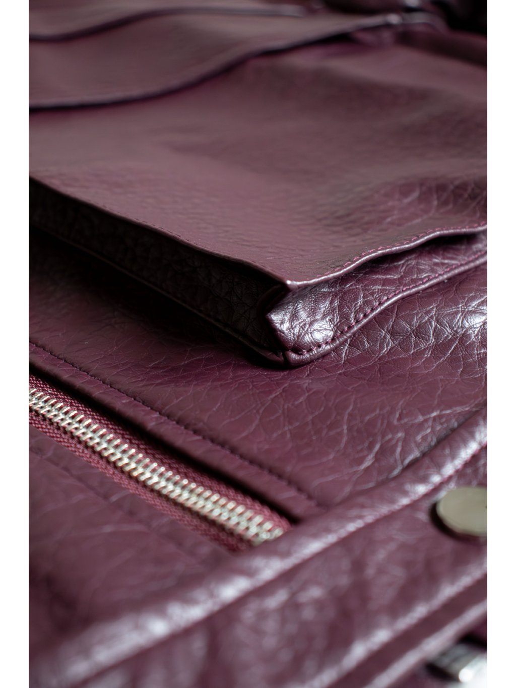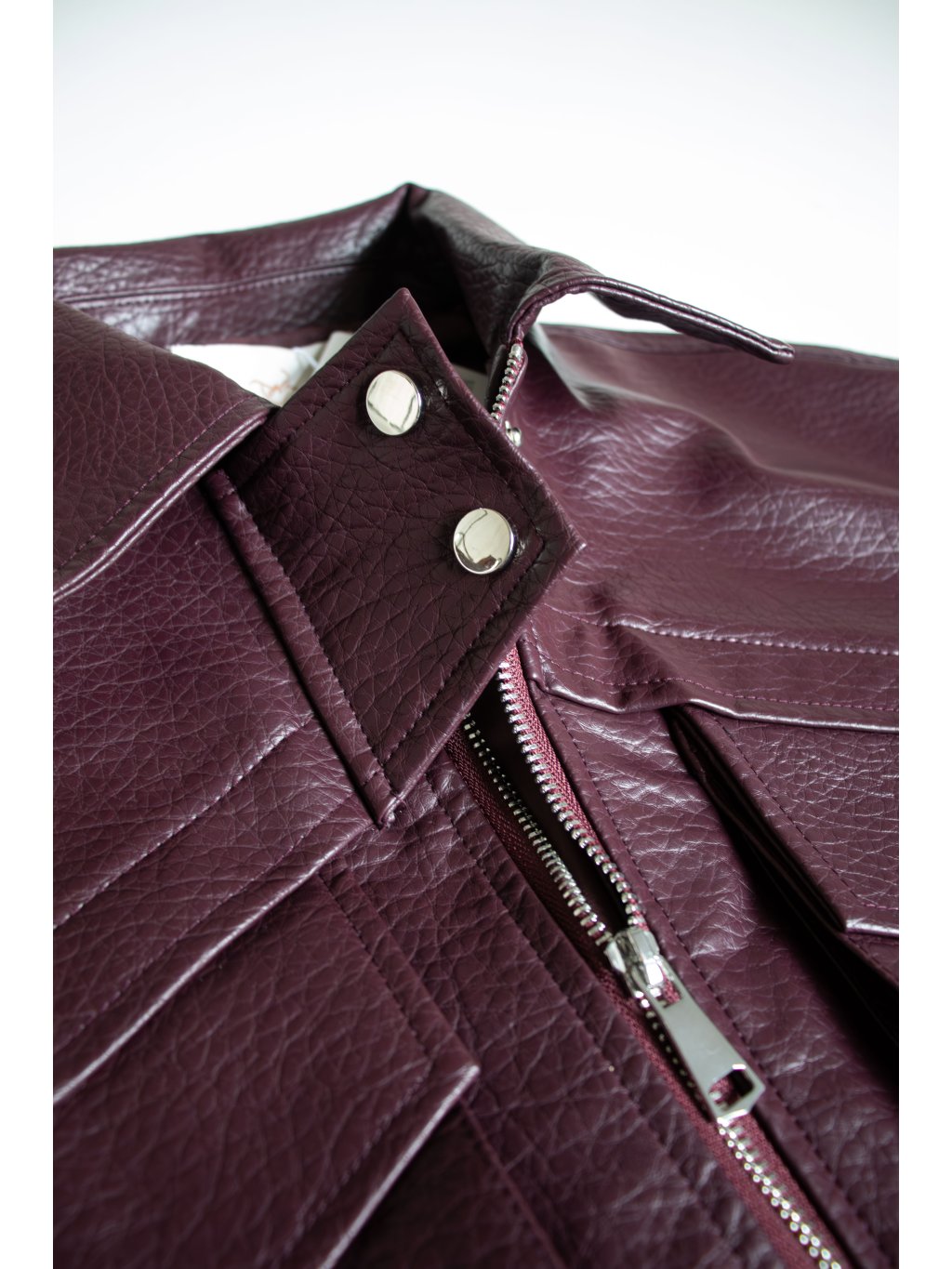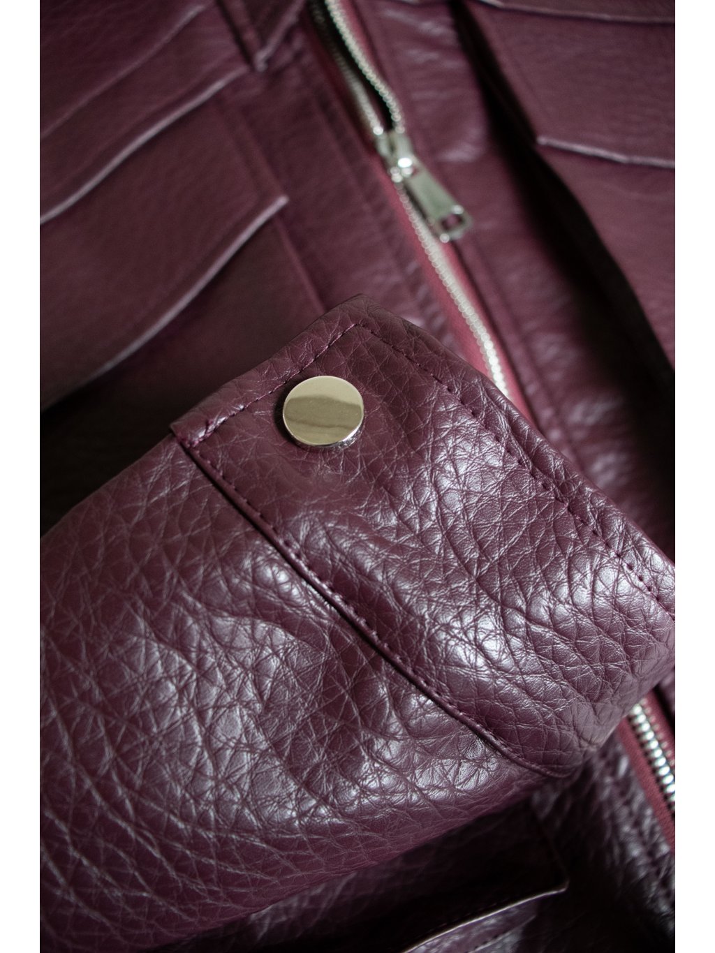 Bomber bunda, hrubší strukturovaná koženka, drží tvar, spadený rukáv, dvě velké přední kapsy s klopami, zapínání na zip a pásky se cvoky, pas do gumy, podšívka, zip a cvoky jsou ve stříbrné barvě.