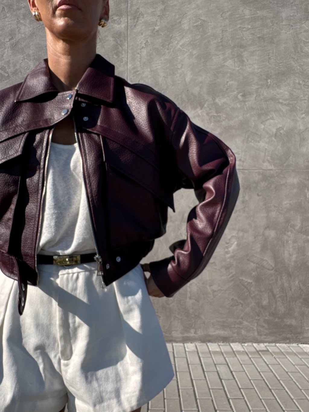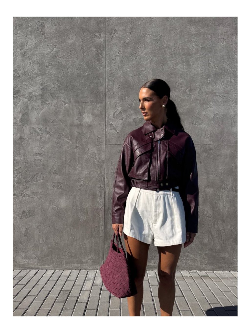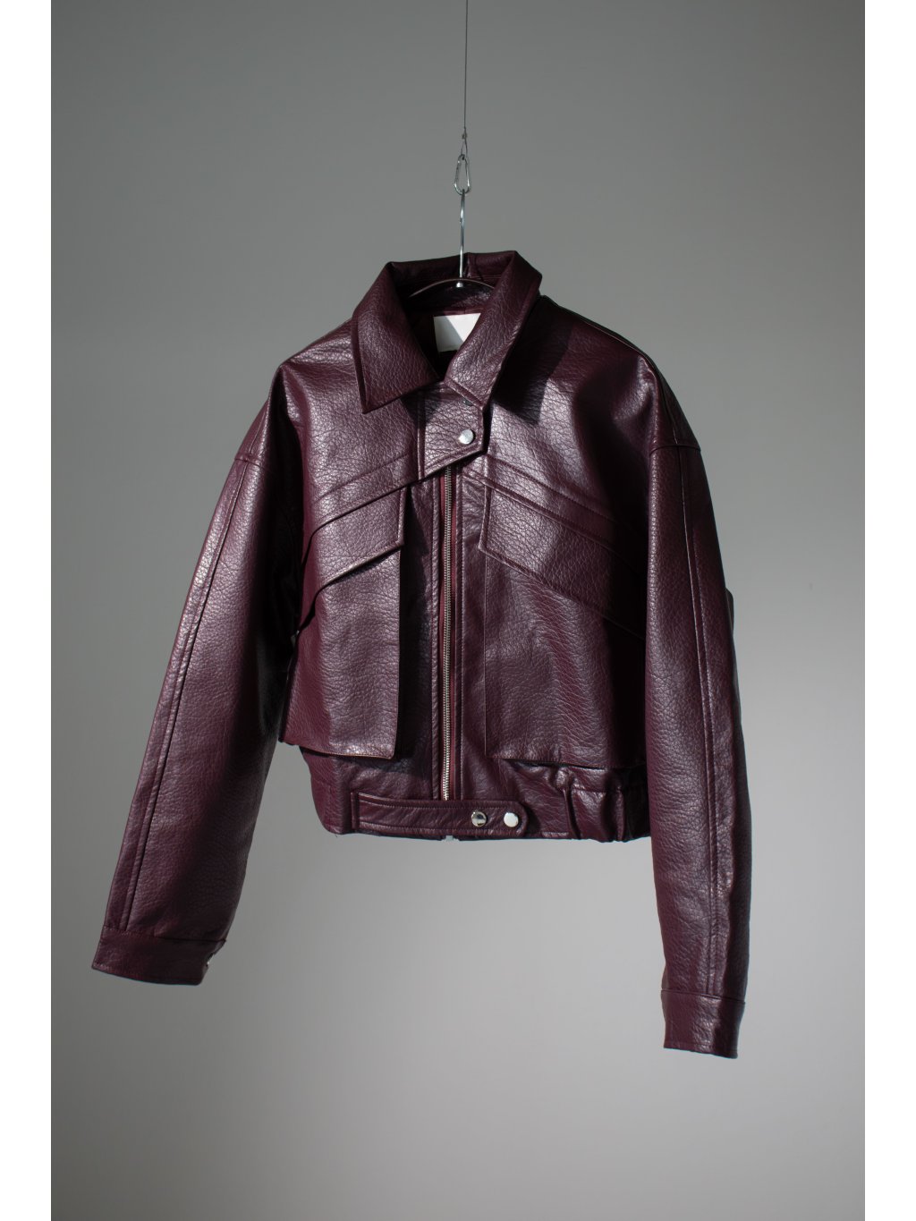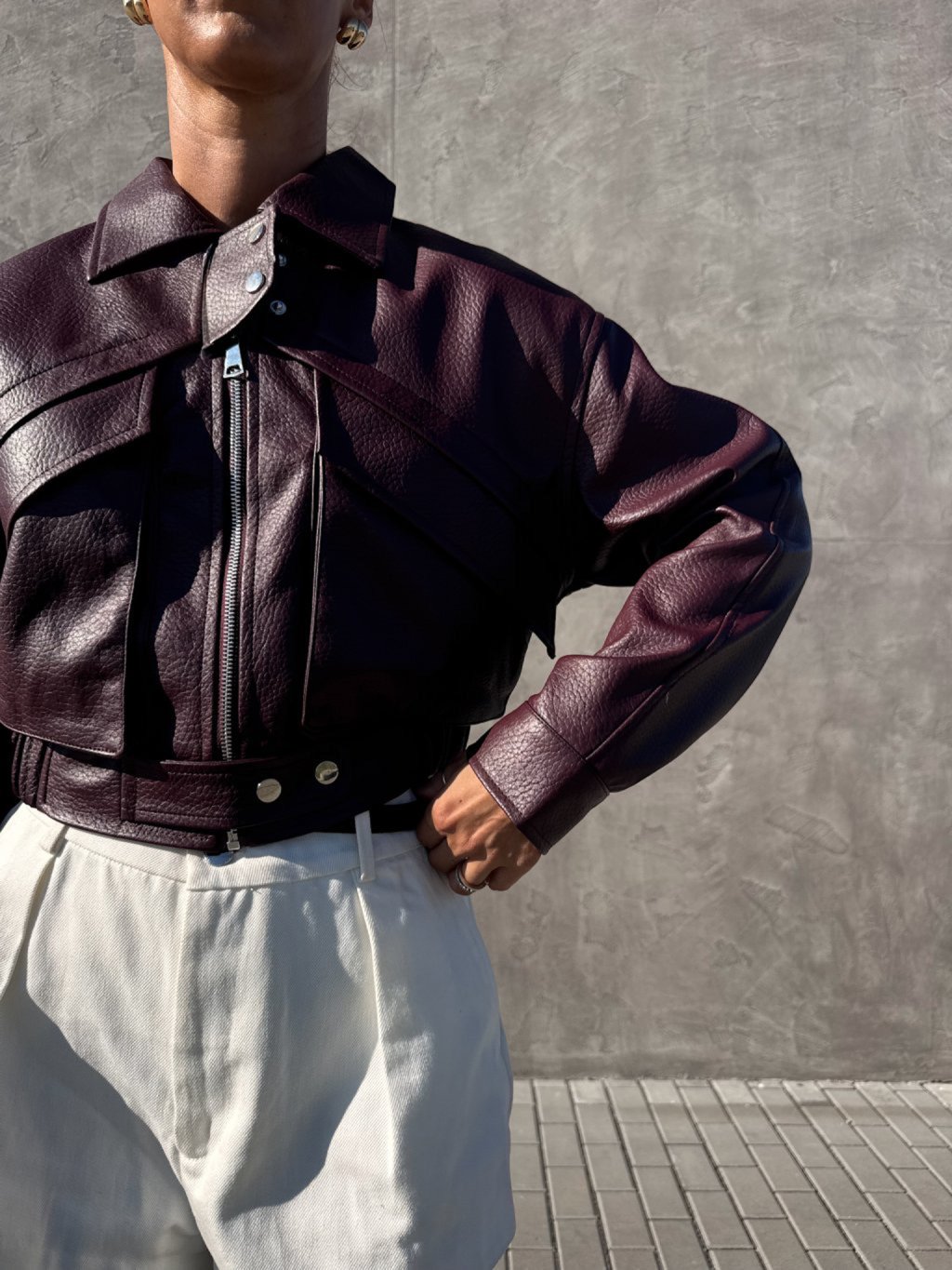 Bomber bunda, hrubší strukturovaná koženka, drží tvar, spadený rukáv, dvě velké přední kapsy s klopami, zapínání na zip a pásky se cvoky, pas do gumy, podšívka, zip a cvoky jsou ve stříbrné barvě.
