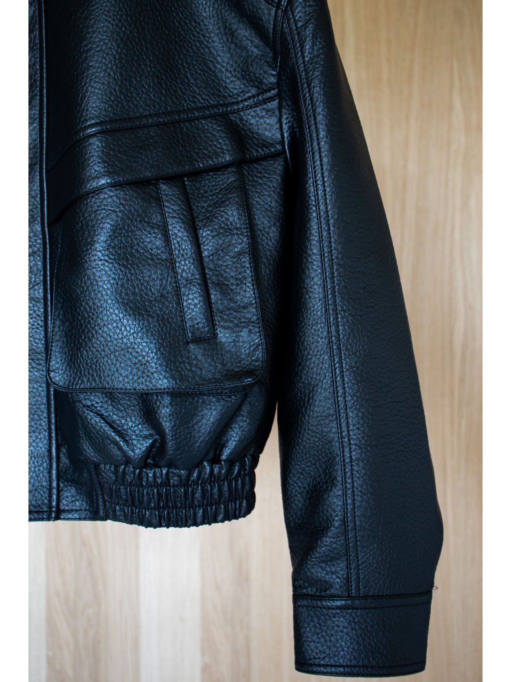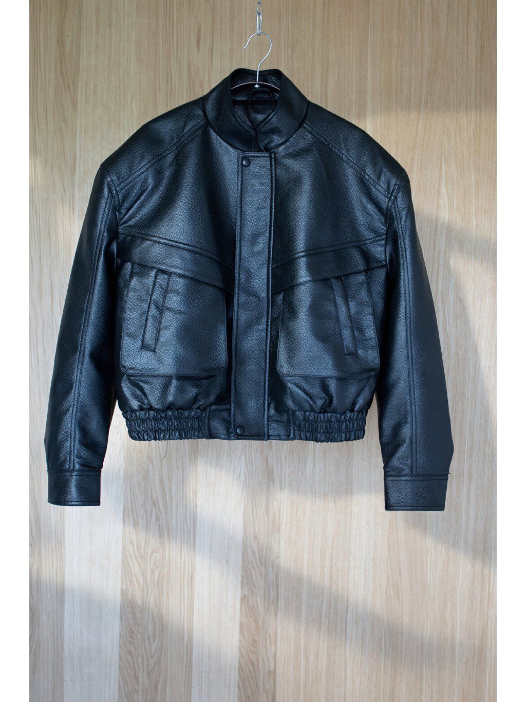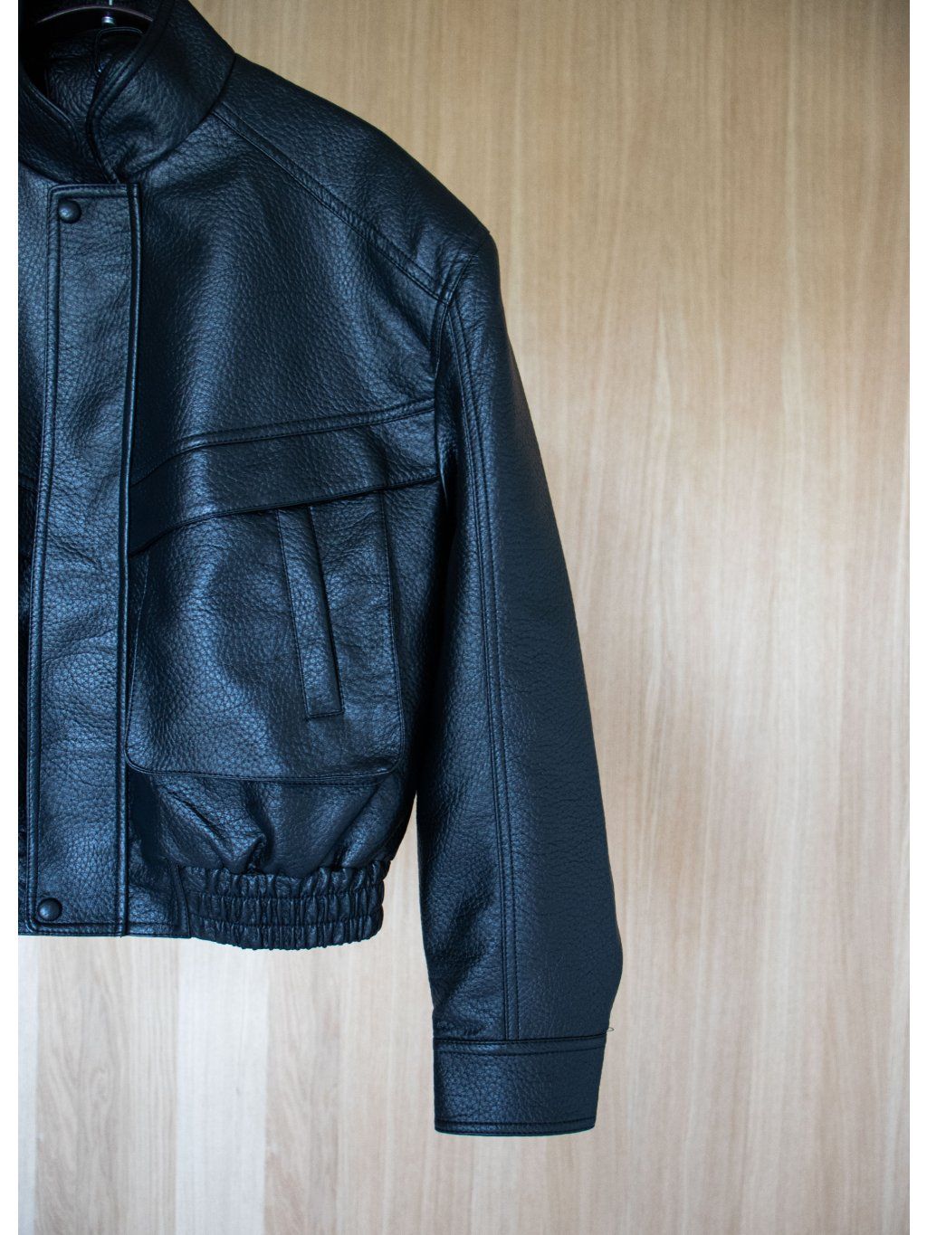 Koženková bunda s výraznými ramenními vycpávkami, stojáček, zapínání na zip ve stříbrné barvě a klopu ve cvoky. Přední kapsy - s "vystupujícím efektem", dlouhý rukáv ukončený manžetou se cvočkem, podšívka. Spodní lem bundy je stažen do gumy.