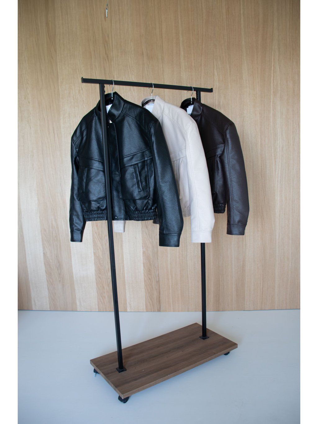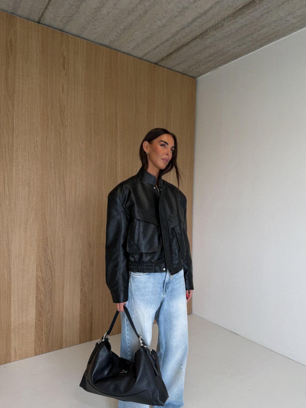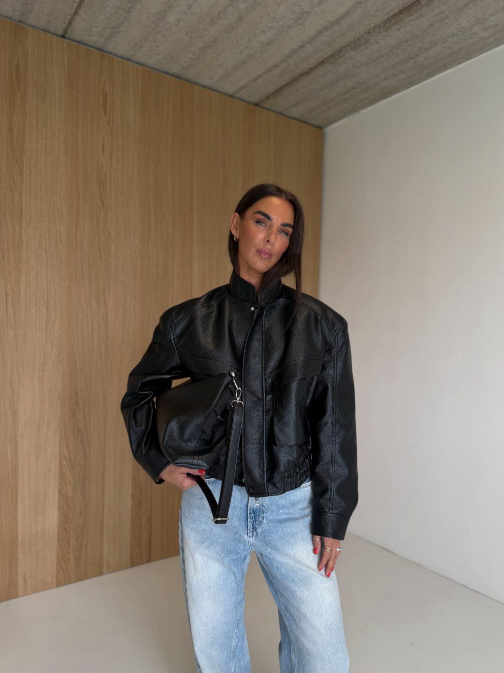 Koženková bunda s výraznými ramenními vycpávkami, stojáček, zapínání na zip ve stříbrné barvě a klopu ve cvoky. Přední kapsy - s "vystupujícím efektem", dlouhý rukáv ukončený manžetou se cvočkem, podšívka. Spodní lem bundy je stažen do gumy.