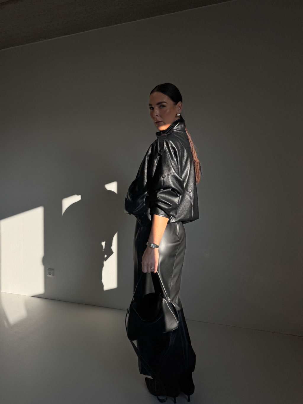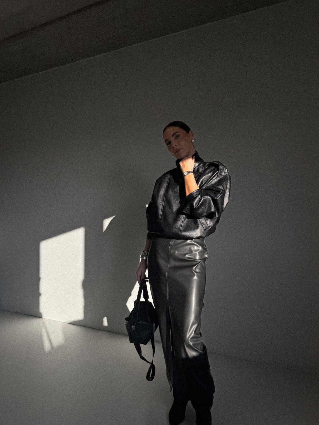 Koženková sukně v midi délce, rovný střih, uvnitř hebký flís, vzadu zapínání na zip, v pase poutka, vpředu rozparek.