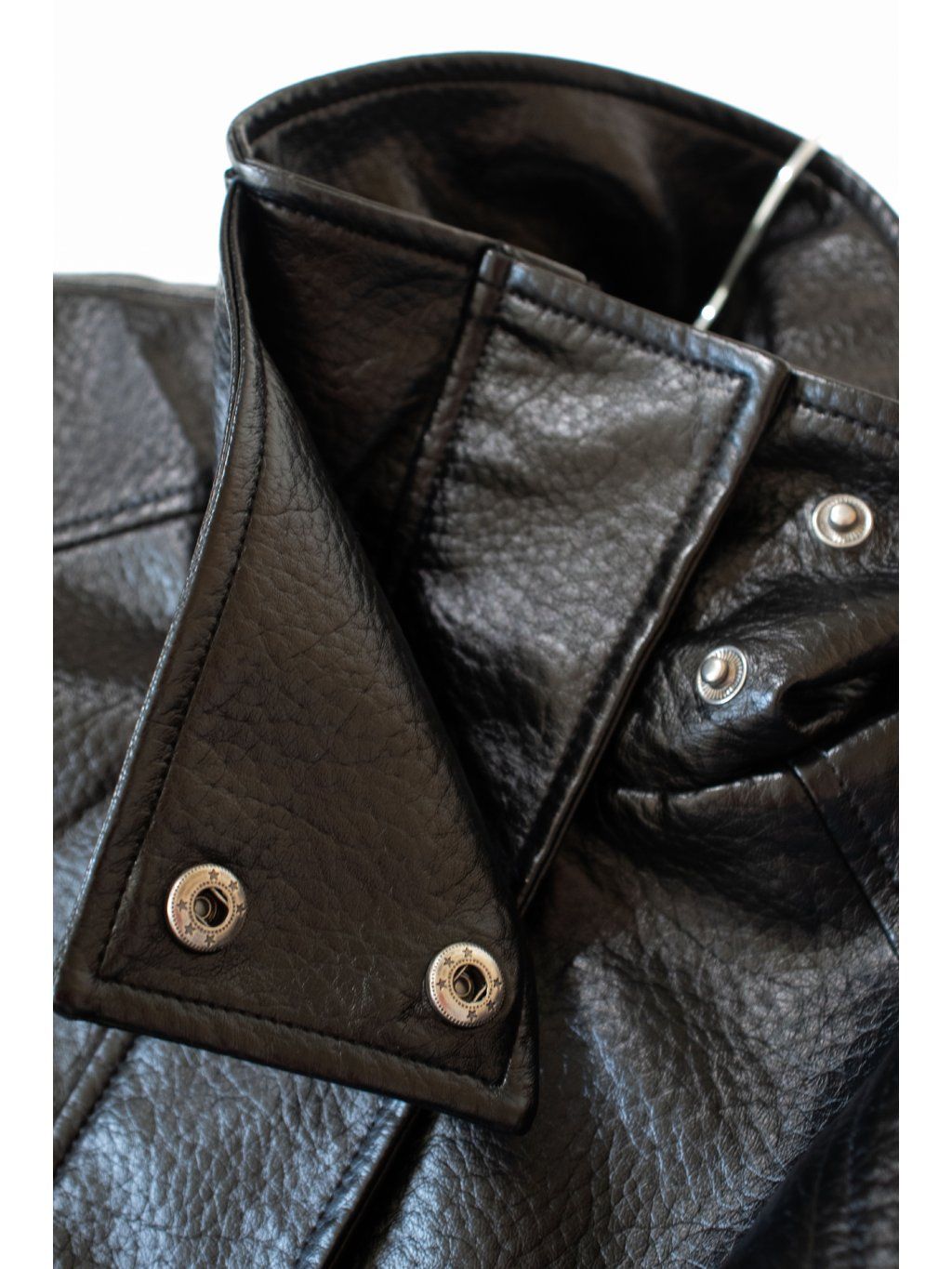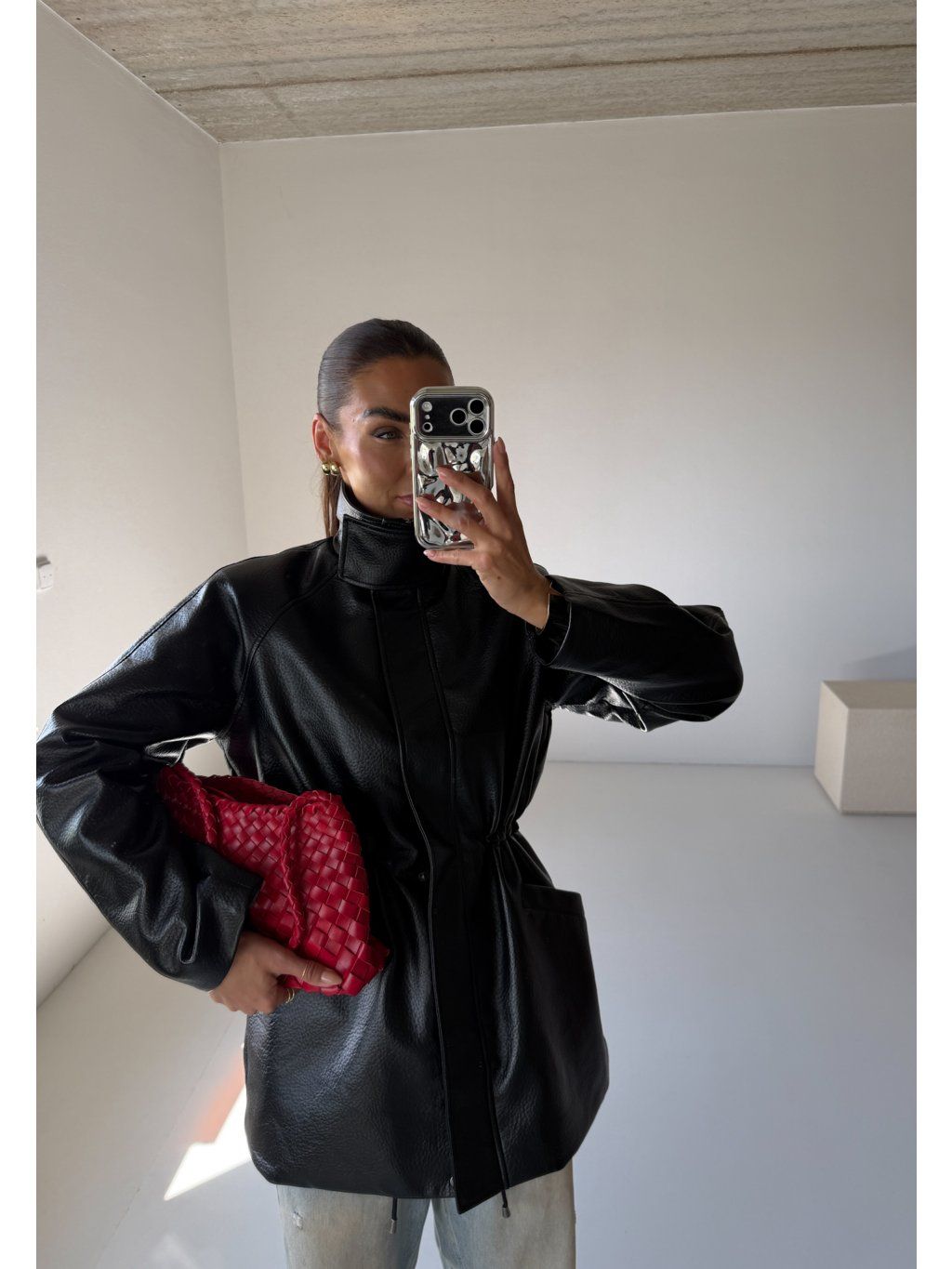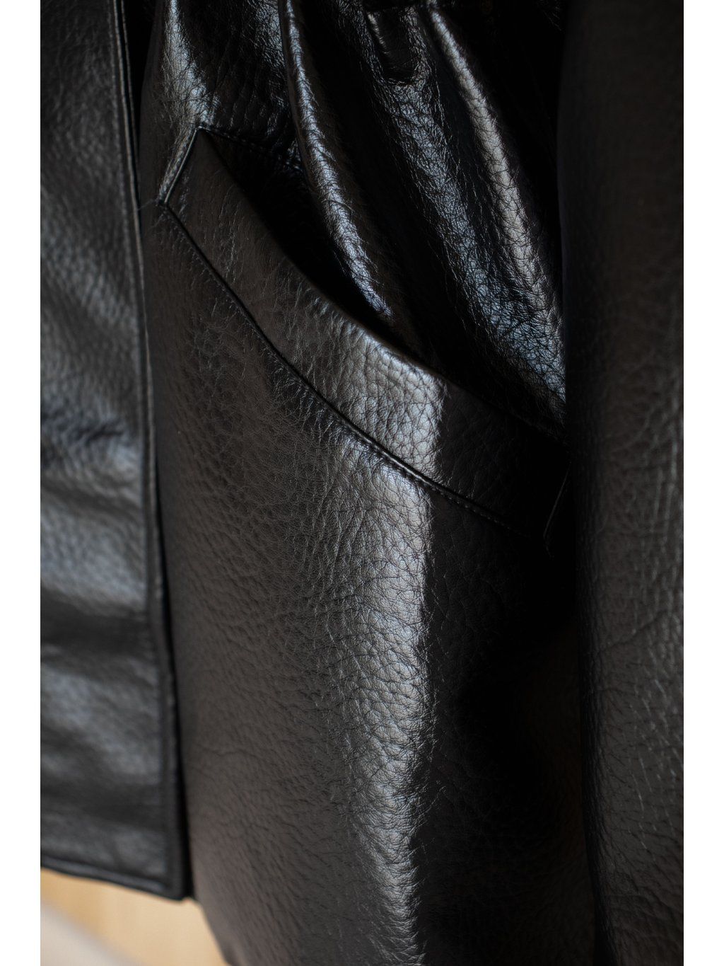Koženková bunda-parka, rovný střih, prodloužená délka - do půli stehen, přední kapsy, límeček do stojáčku se cvočky. Zapínání na zip ve stříbrné barvě a klopu se cvoky, podšívka. Materiál je měkký, příjemný na dotek.