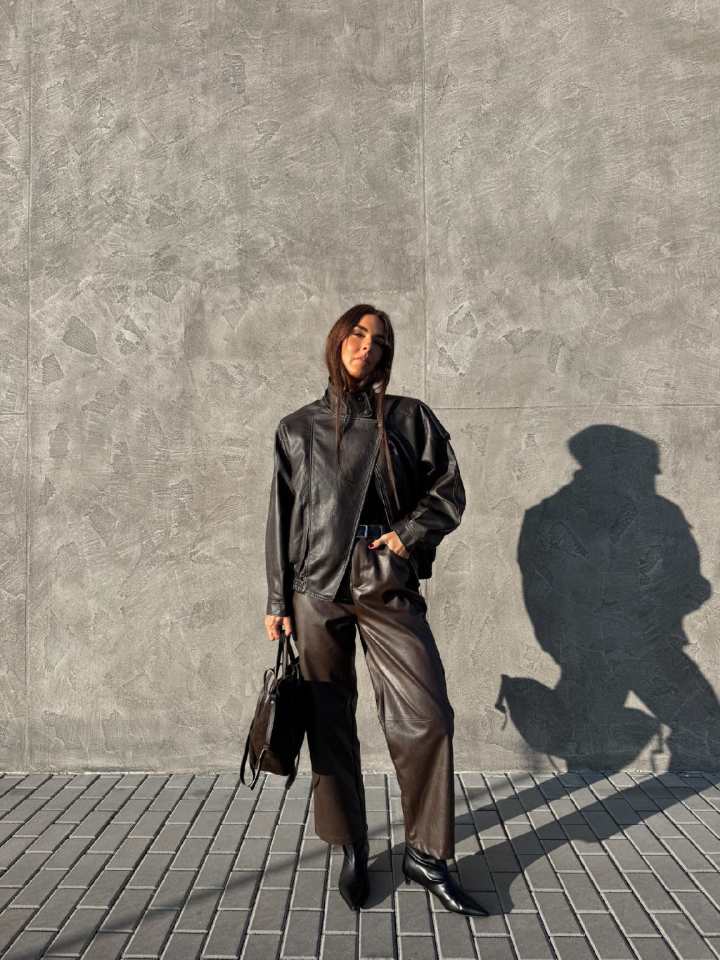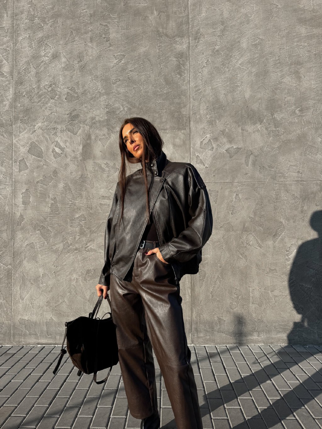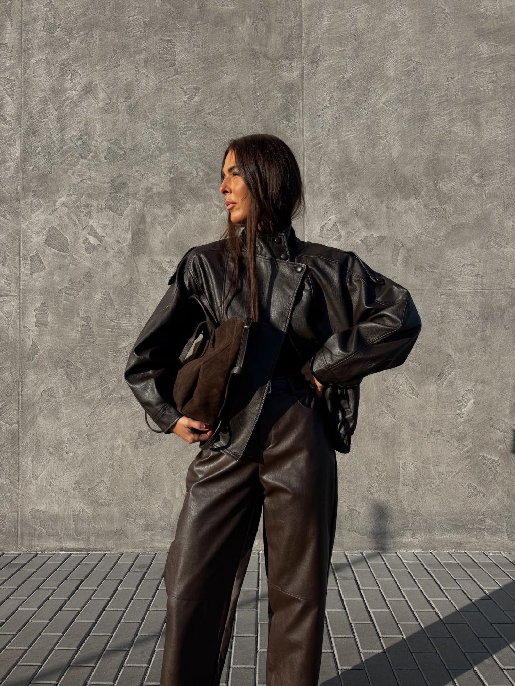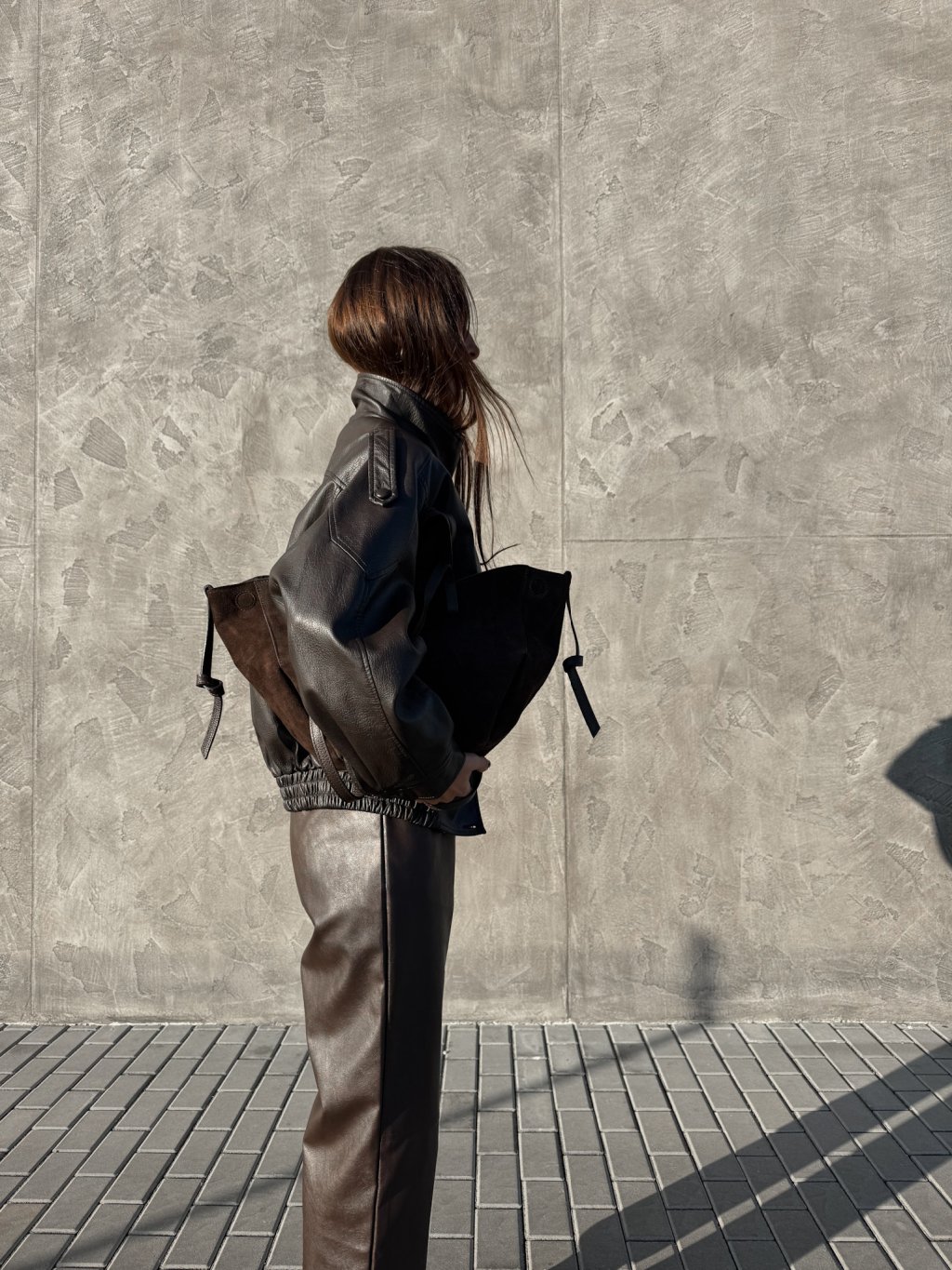 Koženkový bomber, volný střih, výraznější límec zapínající se na dva knoflíky, ramenní výložky, boční kapsy, zapínání na zip ve stříbrné barvě a klopu s knoflíky, spodní lem je do gumy, podšívka.