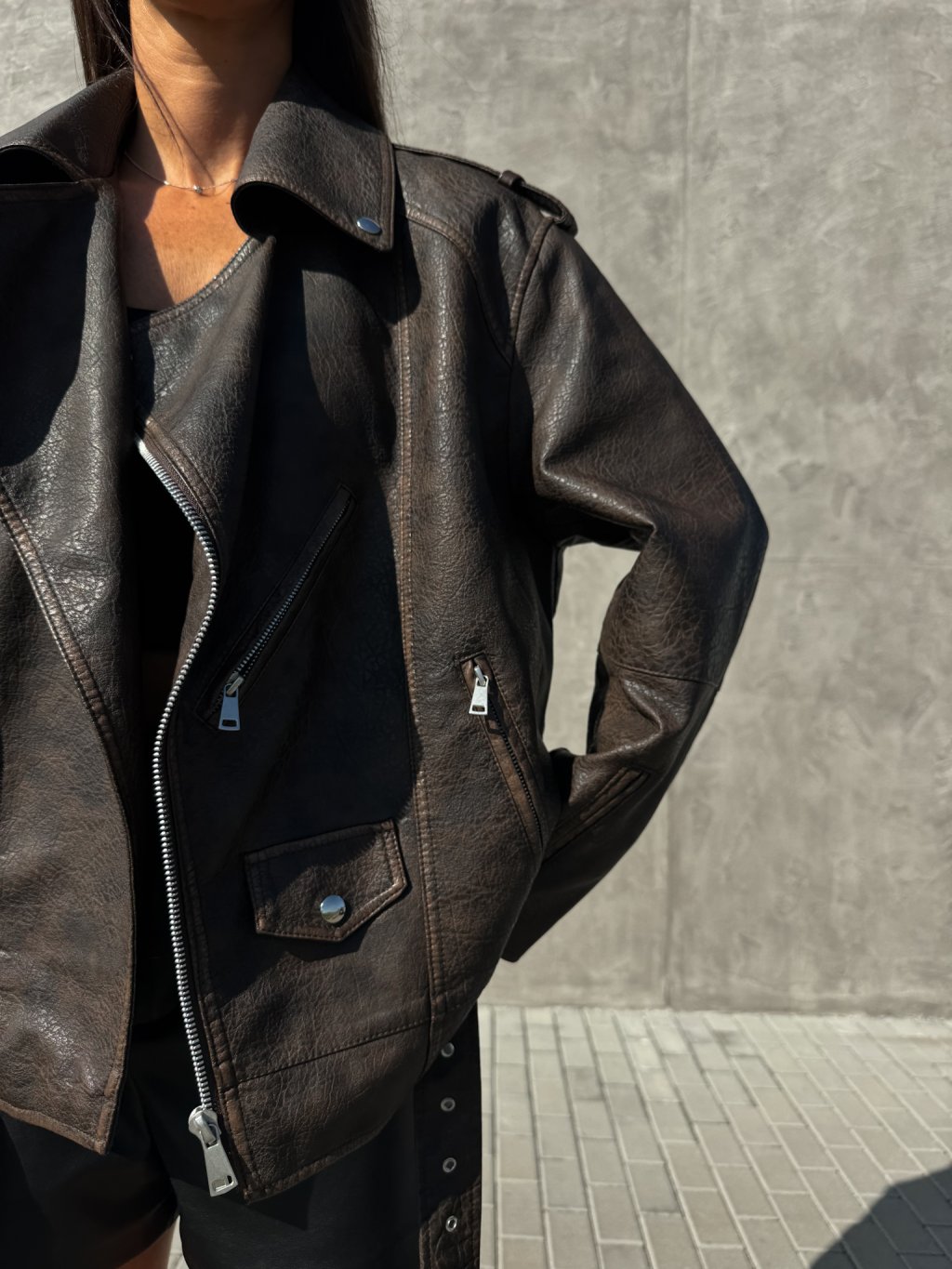 Koženkový křivák, volný-oversized střih, zapínání na zip, výrazný límec, vpředu dvě klasické kapsy na zip, dále šikmá kapsa na zip a detail v podobě