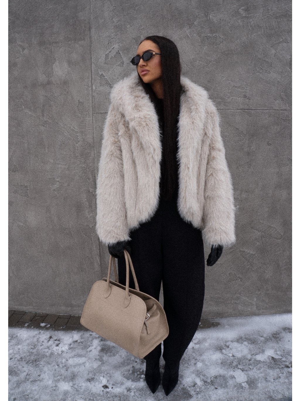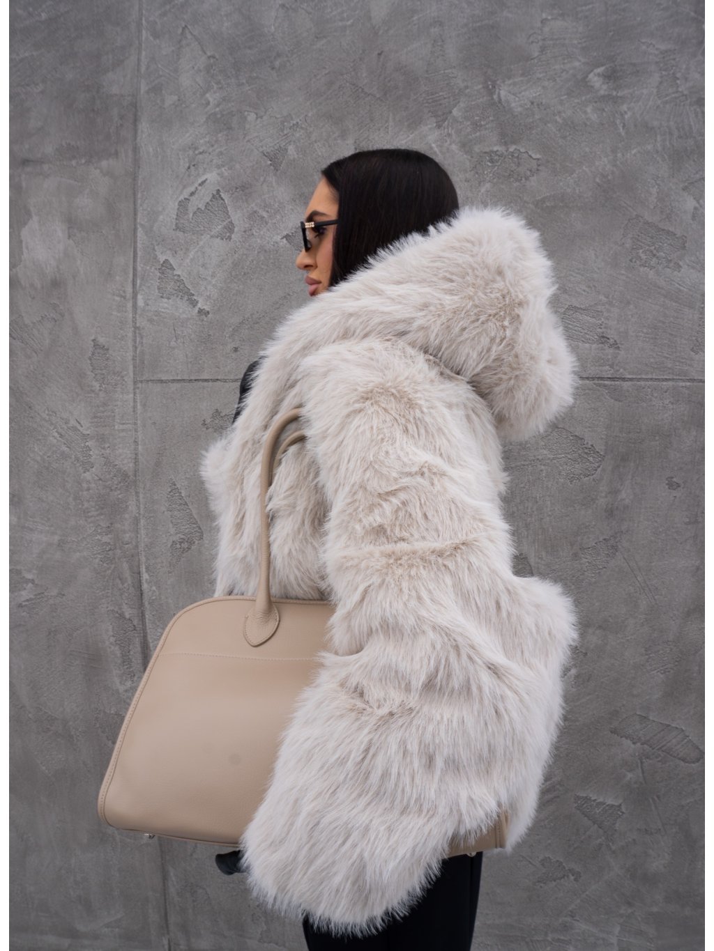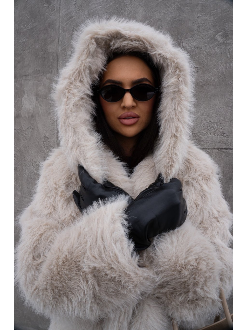 Kožíšek s dlouhým chlupem a velkou kapucí. Přední délka do pasu, vzadu pod zadeček, zapínání na jeden háček. Boční kapsy, podšívka.