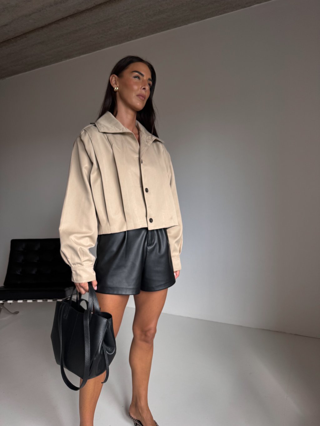Krátká bunda, v přední i zadní části sklady, ramenní výložky, volný, širší střih.