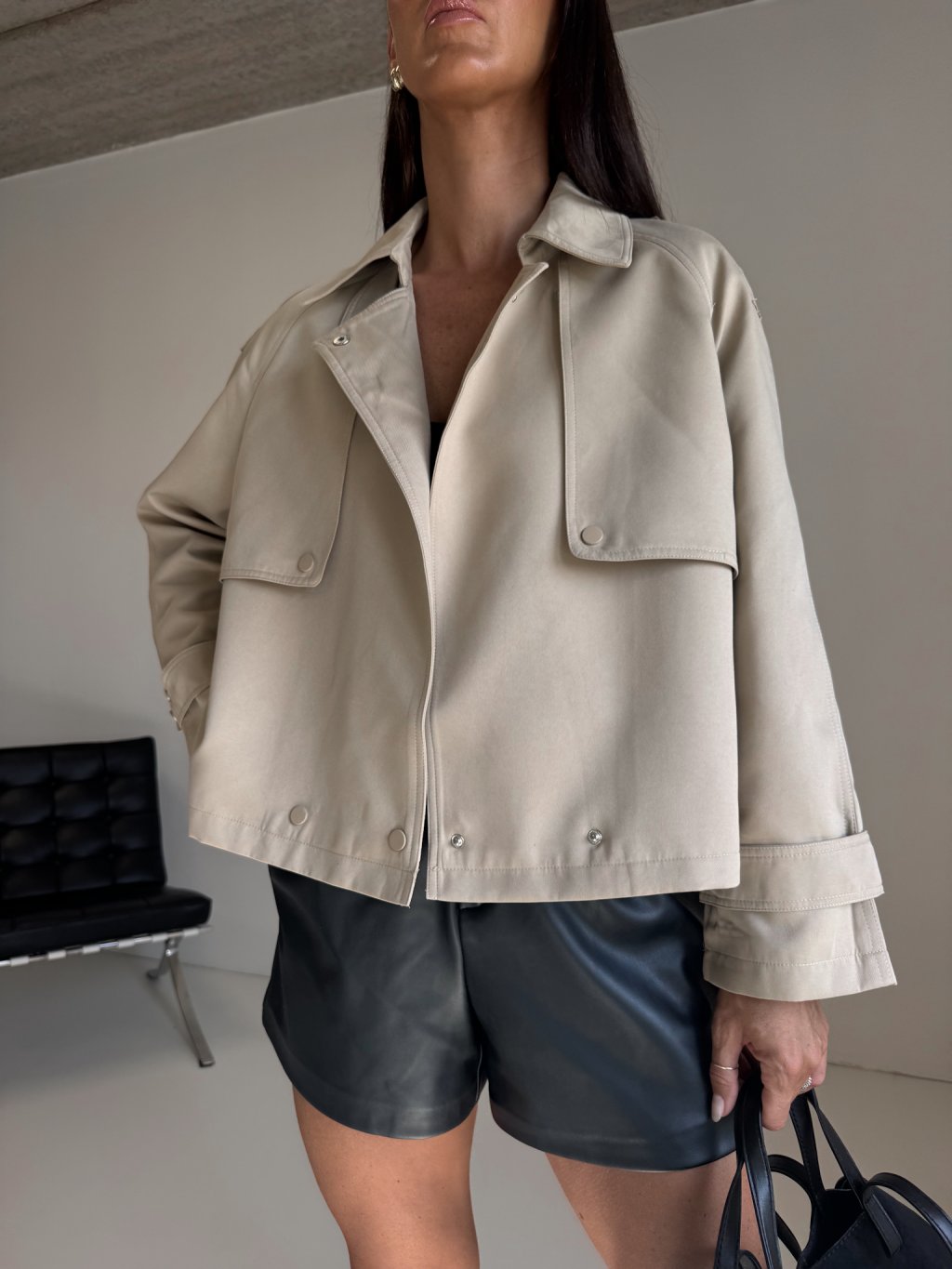 Krátký, rovně střižený trench coat, zapínání na cvoky v barvě materiálu, vpředu i vzadu ochranný štít, podšívka.