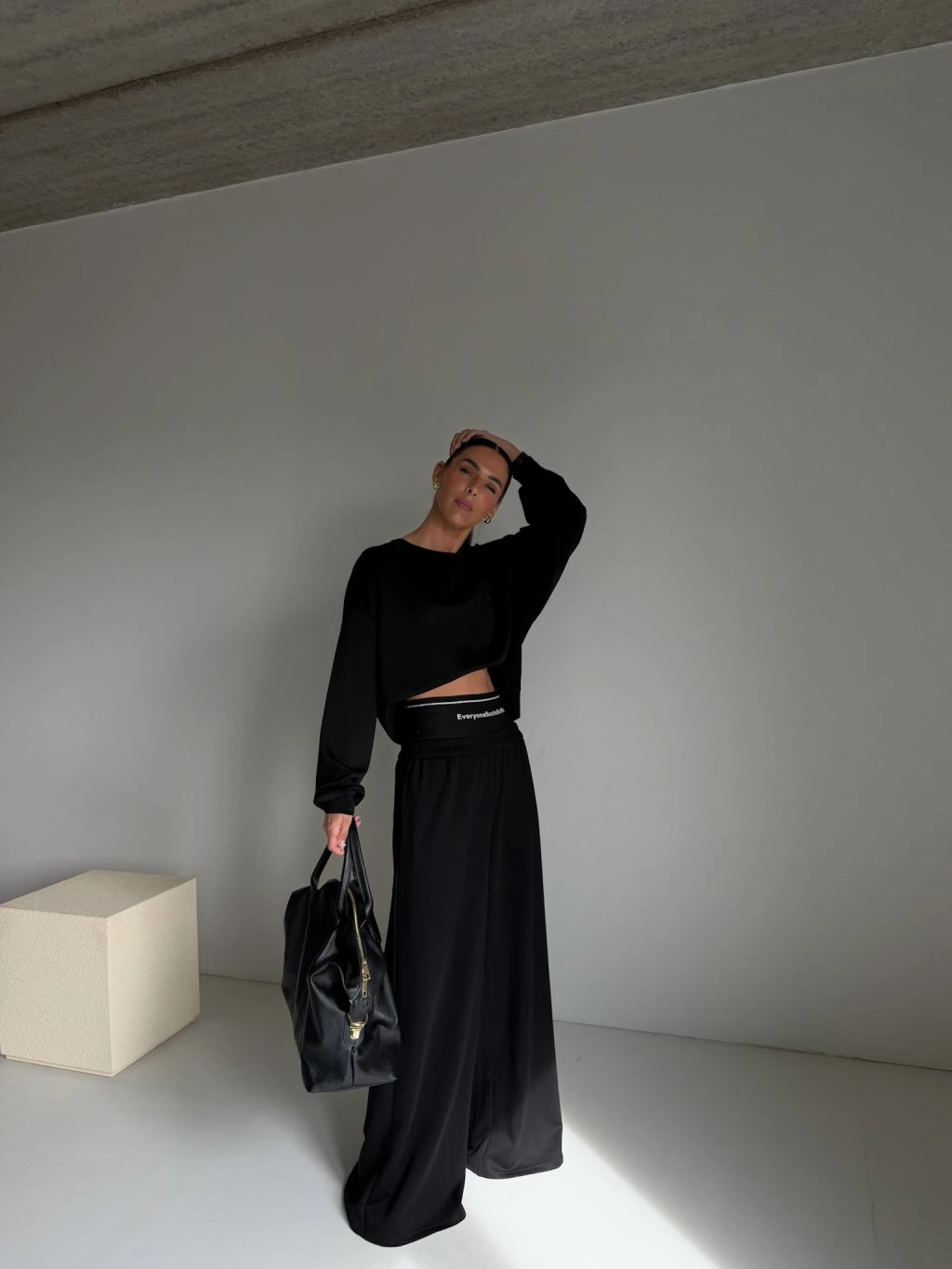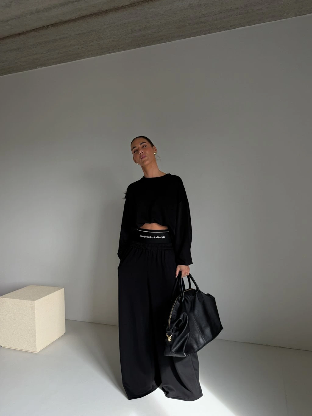 Kalhoty se širokými nohavicemi, v pase na gumu, boční kapsy.