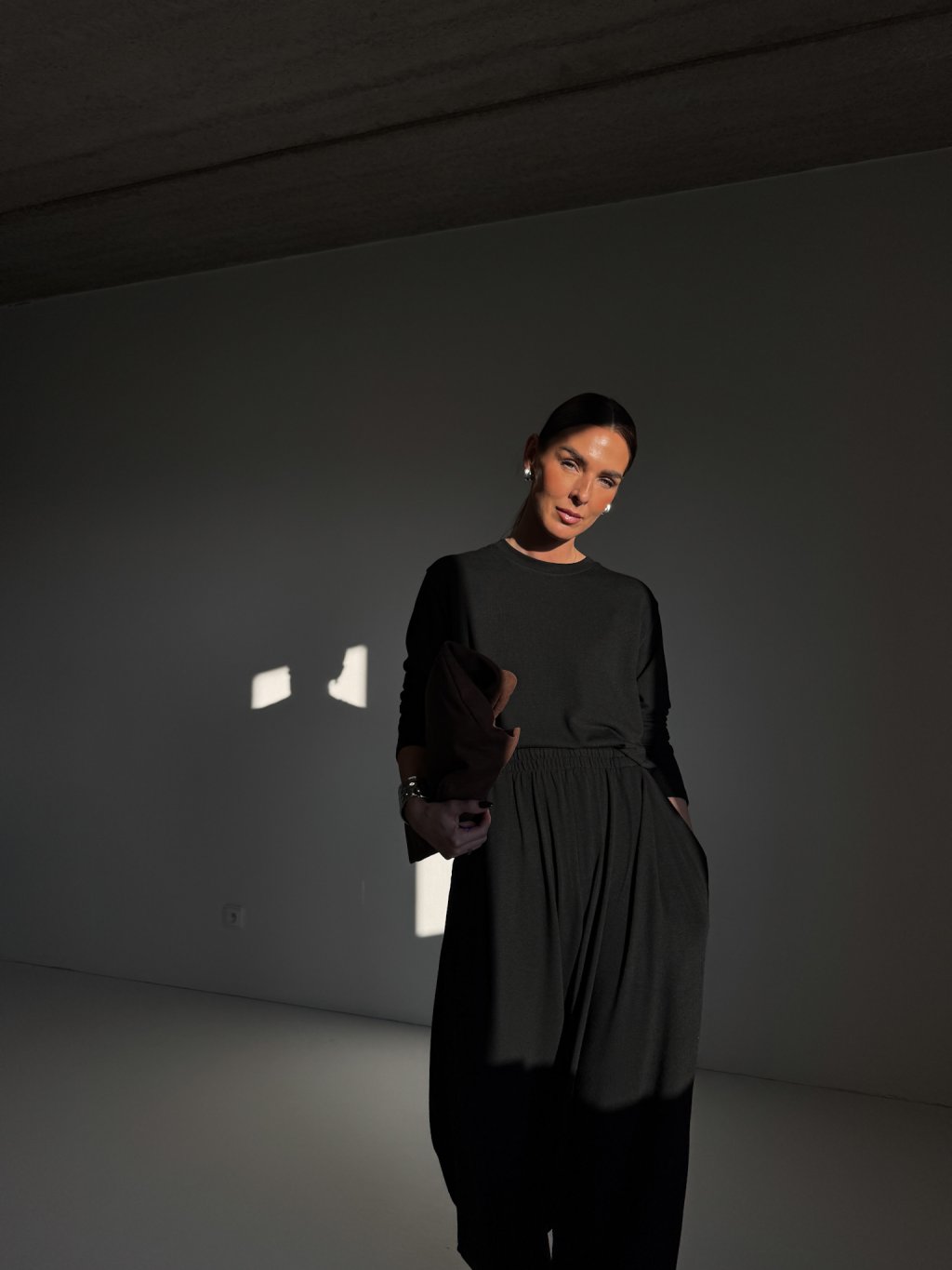 Kalhoty v pase na širší gumu se stahovacími šňůrkami, široké nohavice, boční kapsy. Tričko volného střihu, dlouhý rukáv, kulatý výstřih. Materiál je lehký a příjemně hebký.