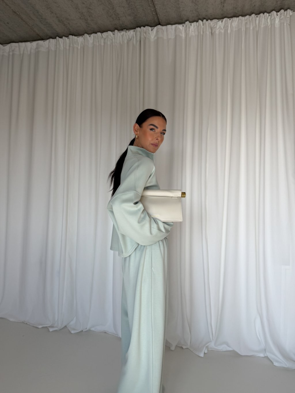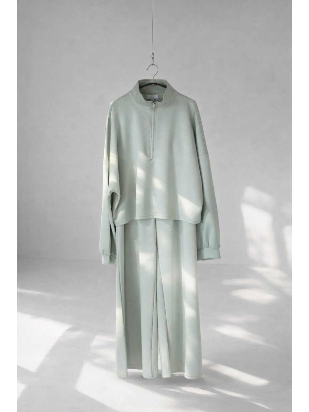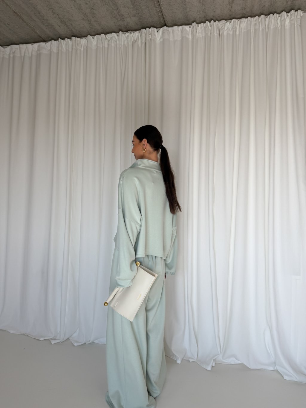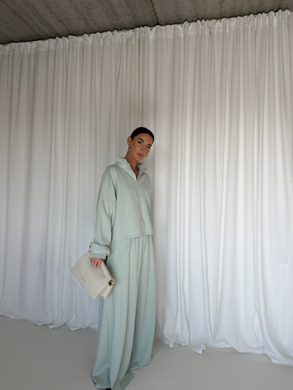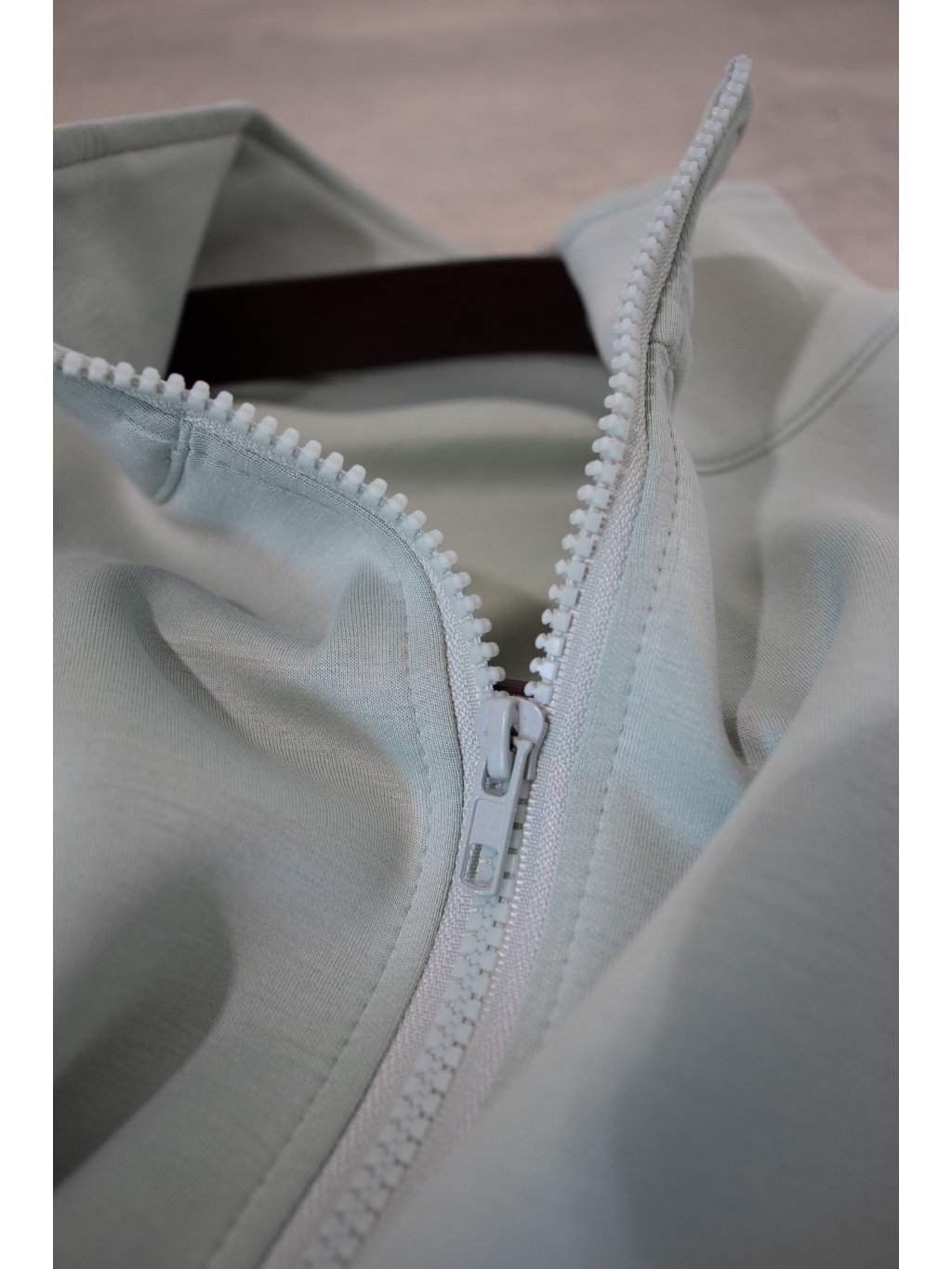 Halenka volného netopýřího střihu, cropped délka -do pasu, dlouhé rukávy ukončené pružným patentem, límeček do stojáčku, který se zapíná na zip v mint barvě. Materiál je velmi příjemný.