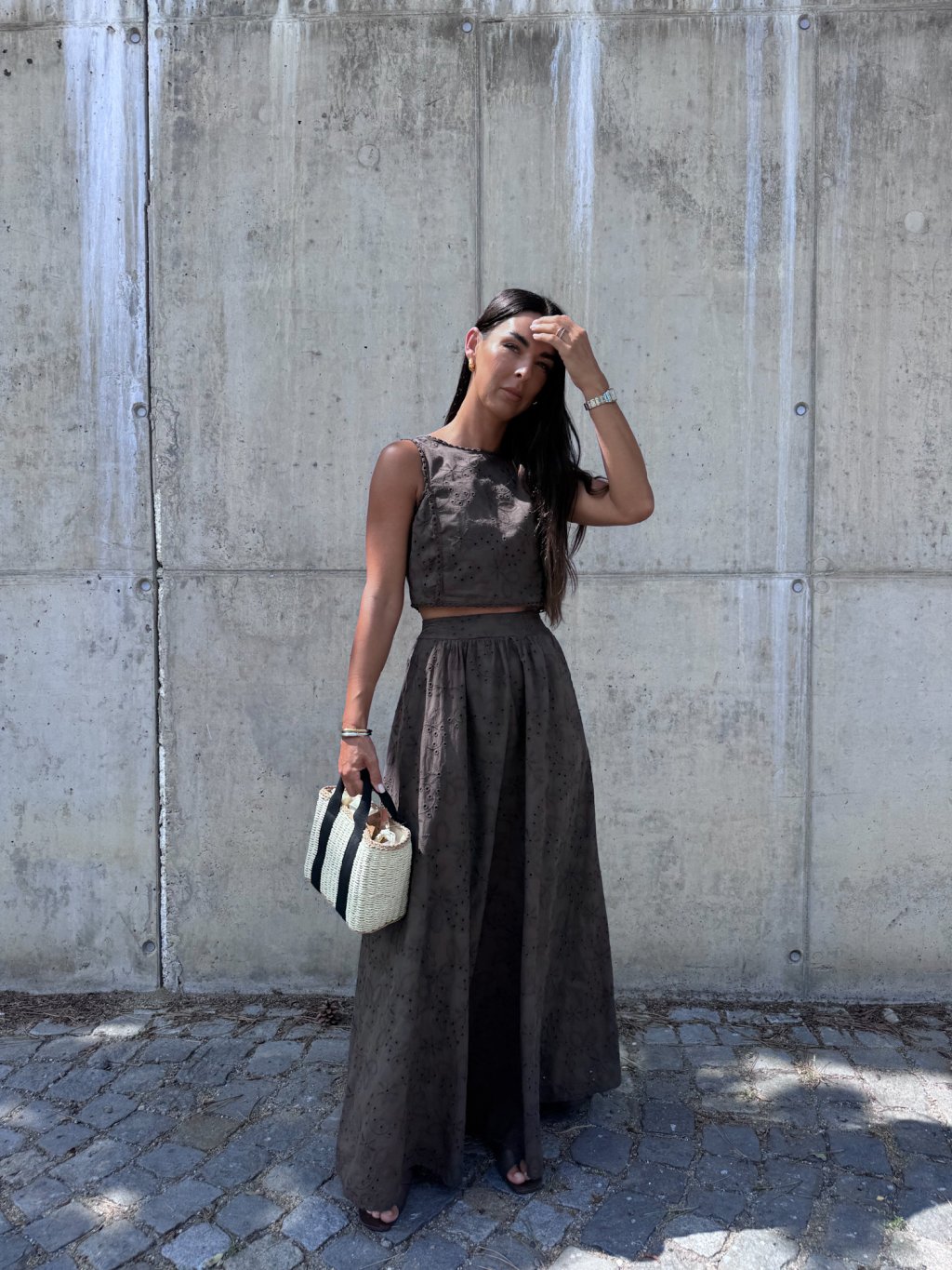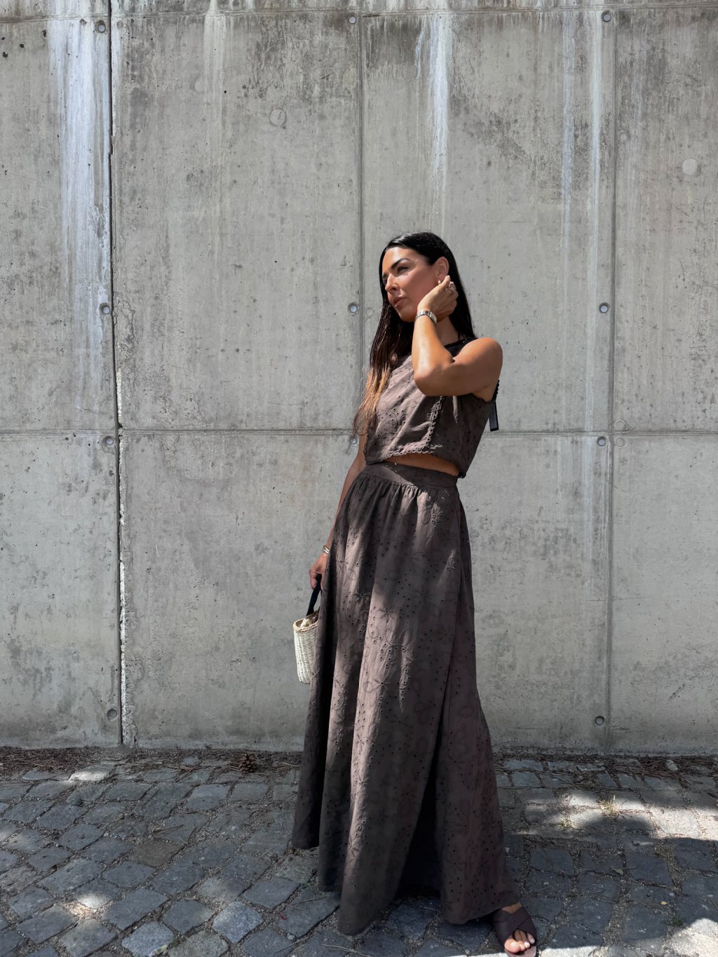 Madeira komplet maxi sukně - v zadní části pasu pružná guma, krátká spodnička, boční kapsy. Top - zapínání vzadu na zip.