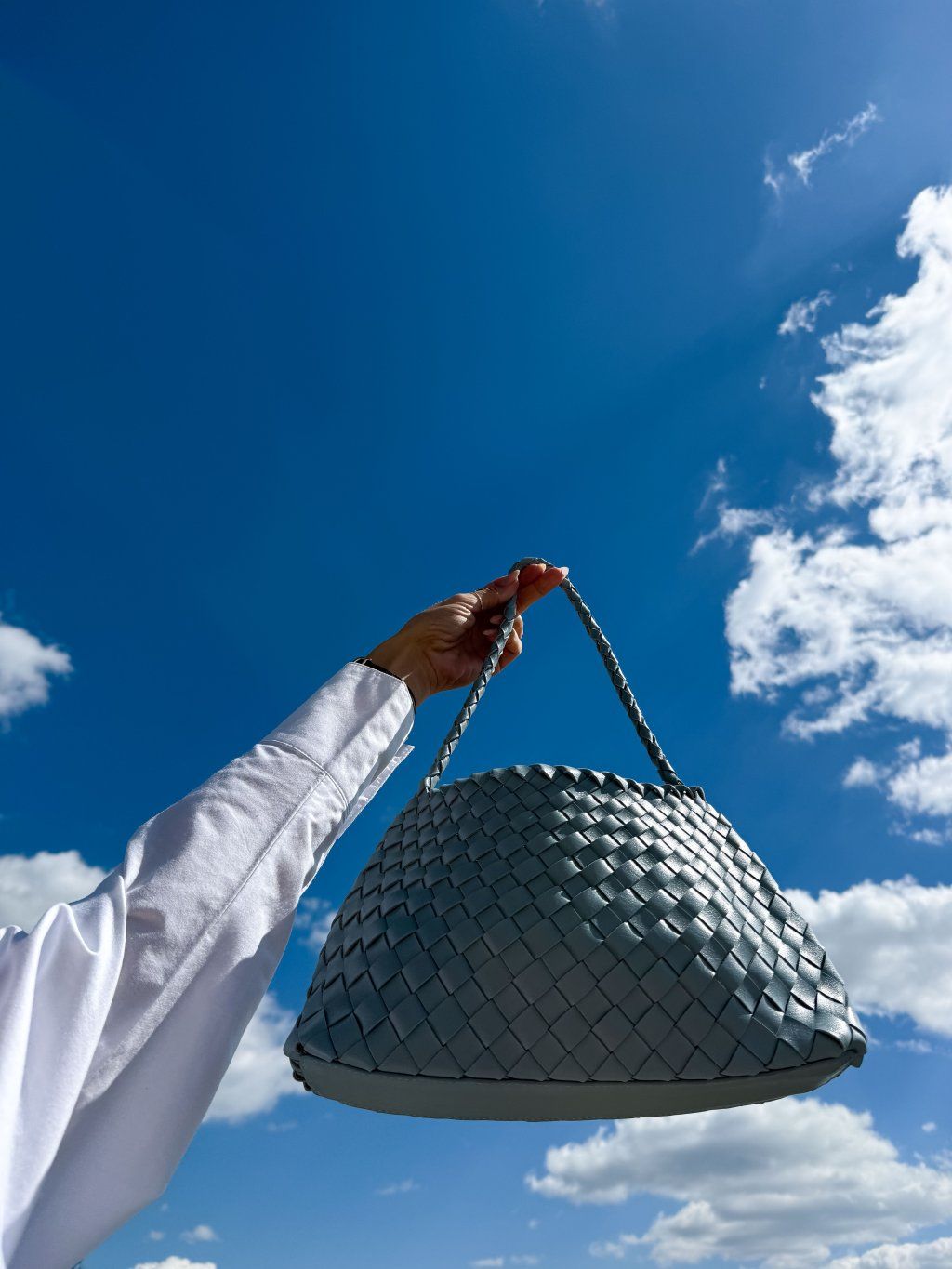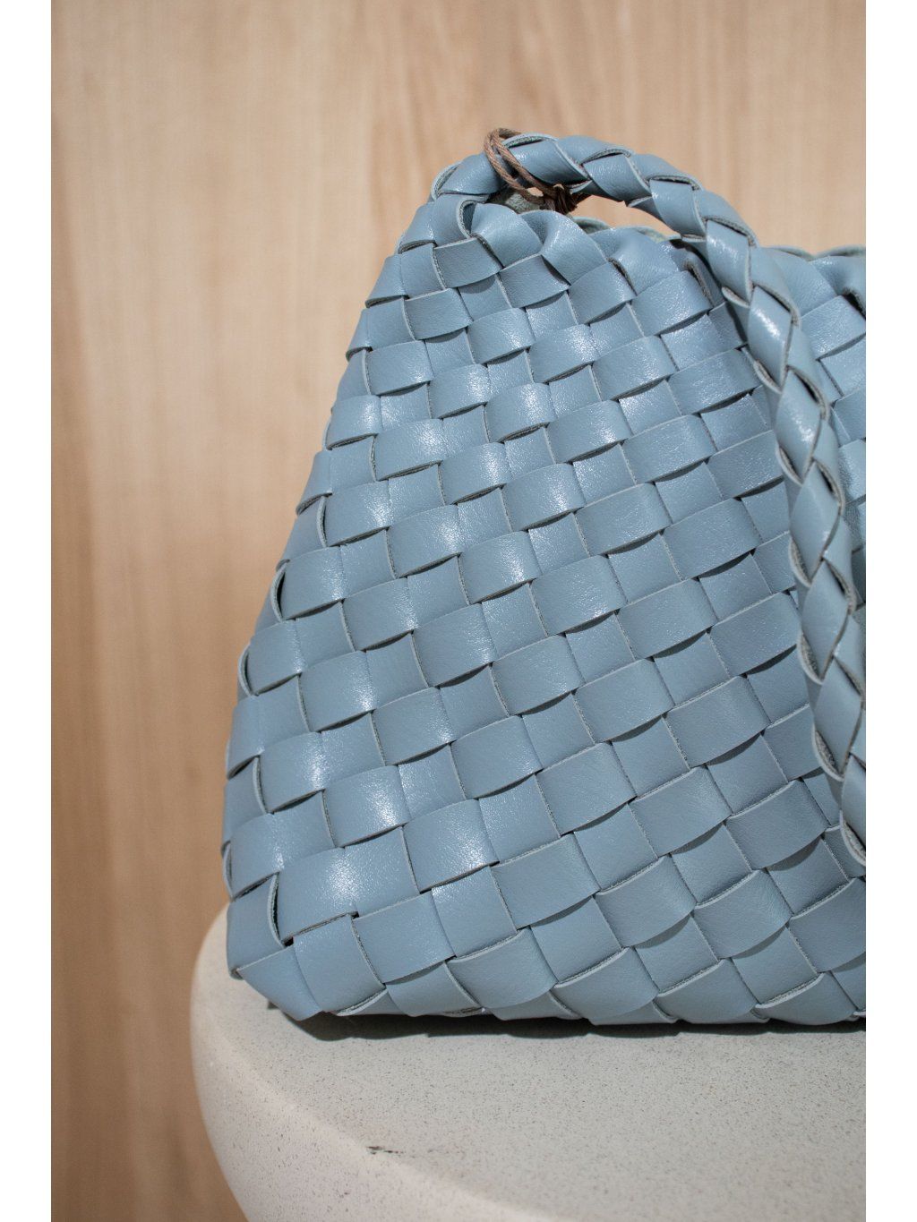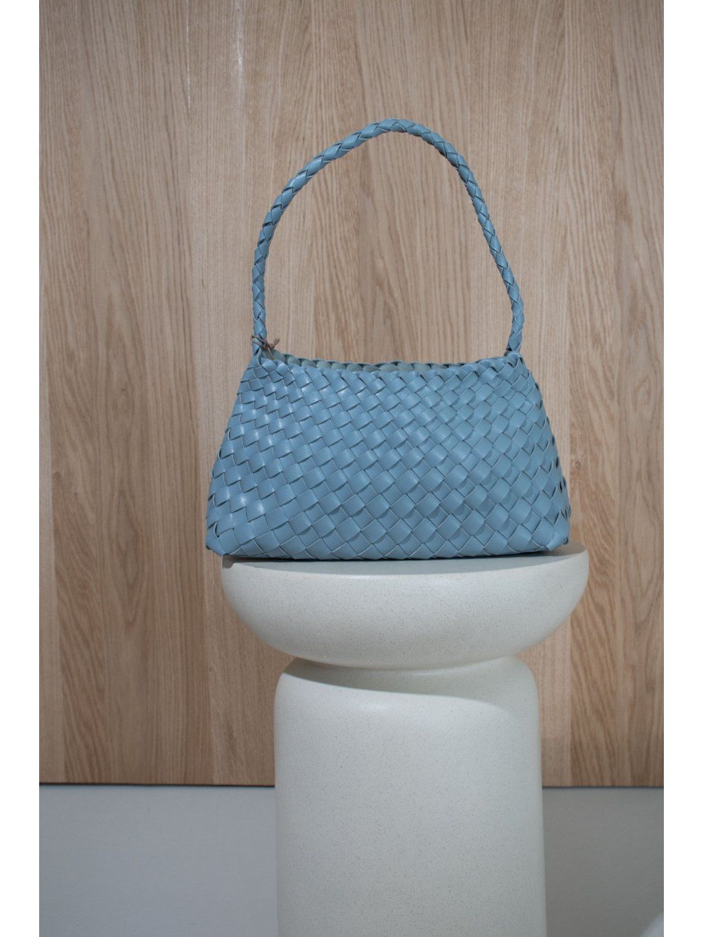 Malá proplétaná kabelka, jedno ucho, uvnitř je látkový vak/pytlík se šňůrkami na stažení, pevné dno. Materiál - kůže.