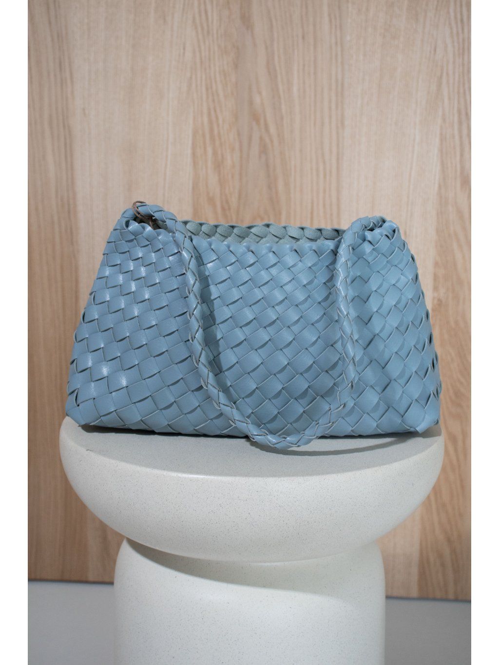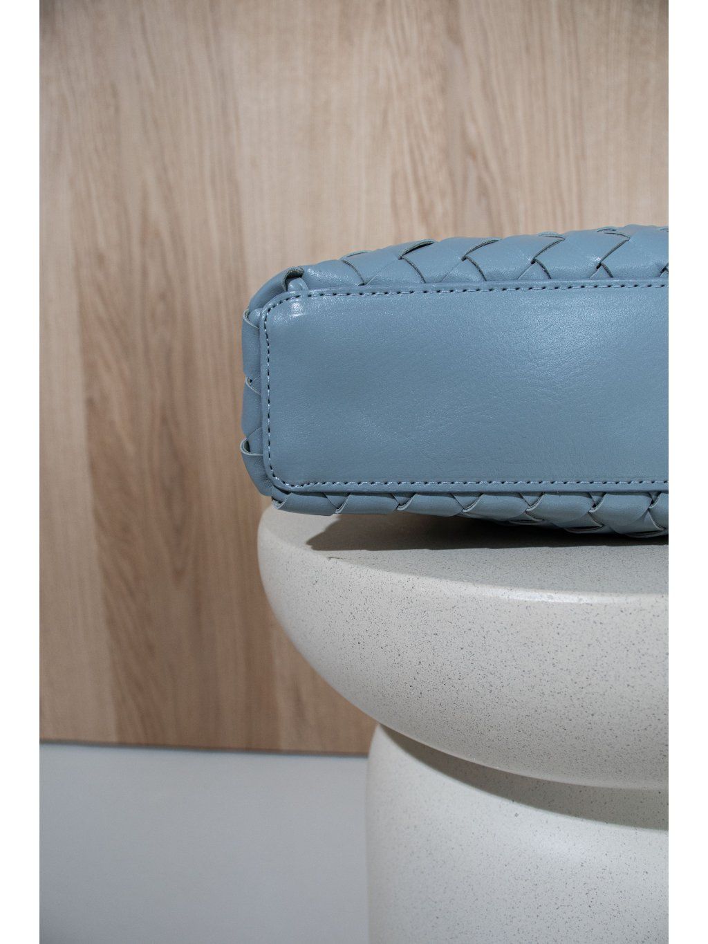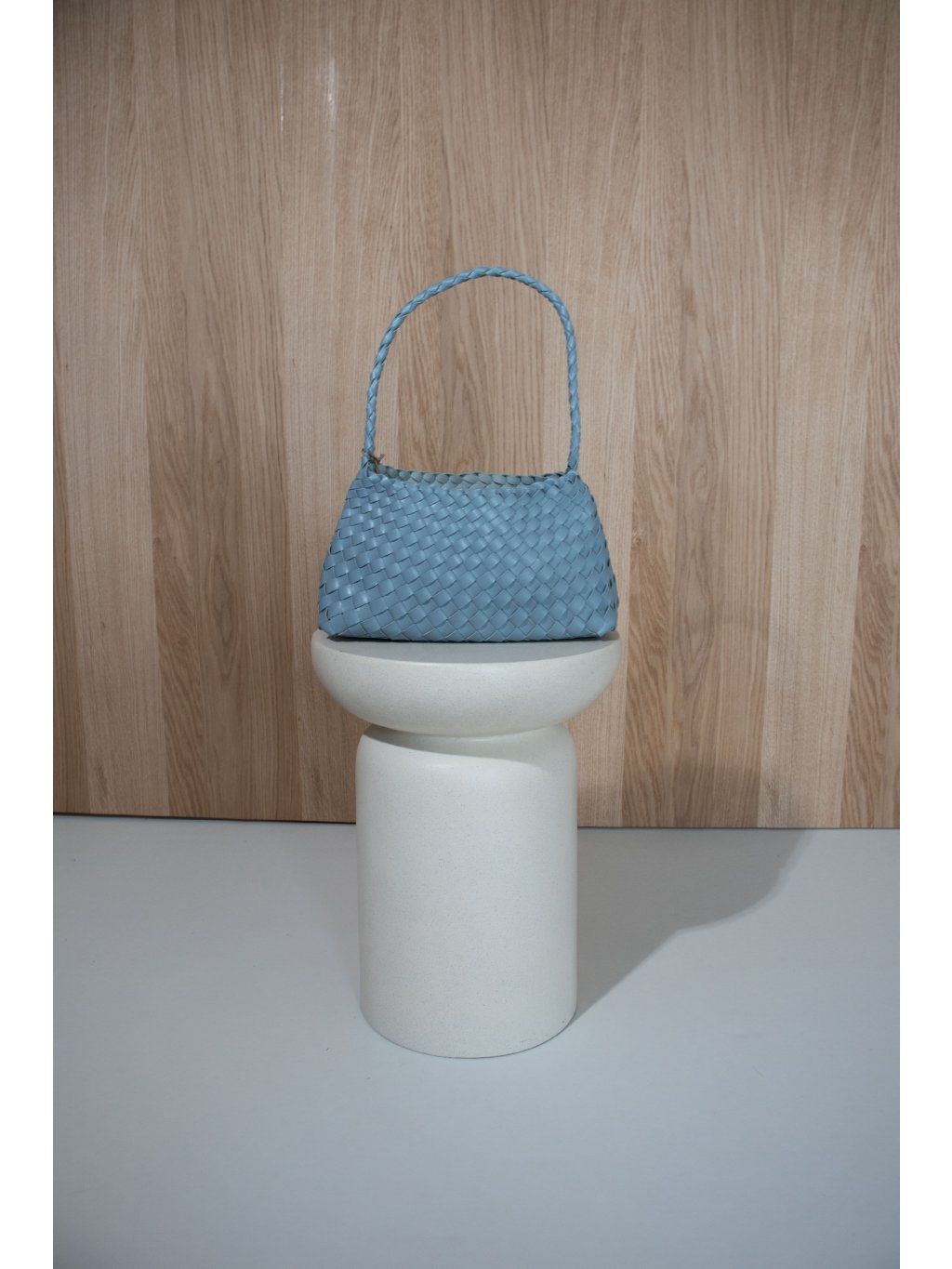 Malá proplétaná kabelka, jedno ucho, uvnitř je látkový vak/pytlík se šňůrkami na stažení, pevné dno. Materiál - kůže.