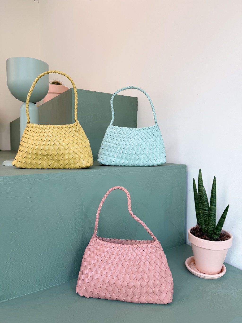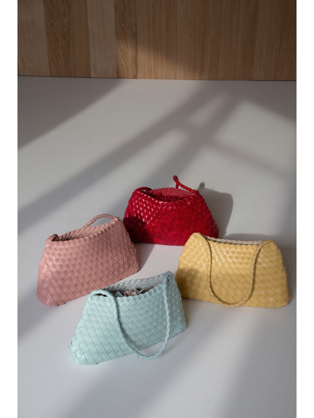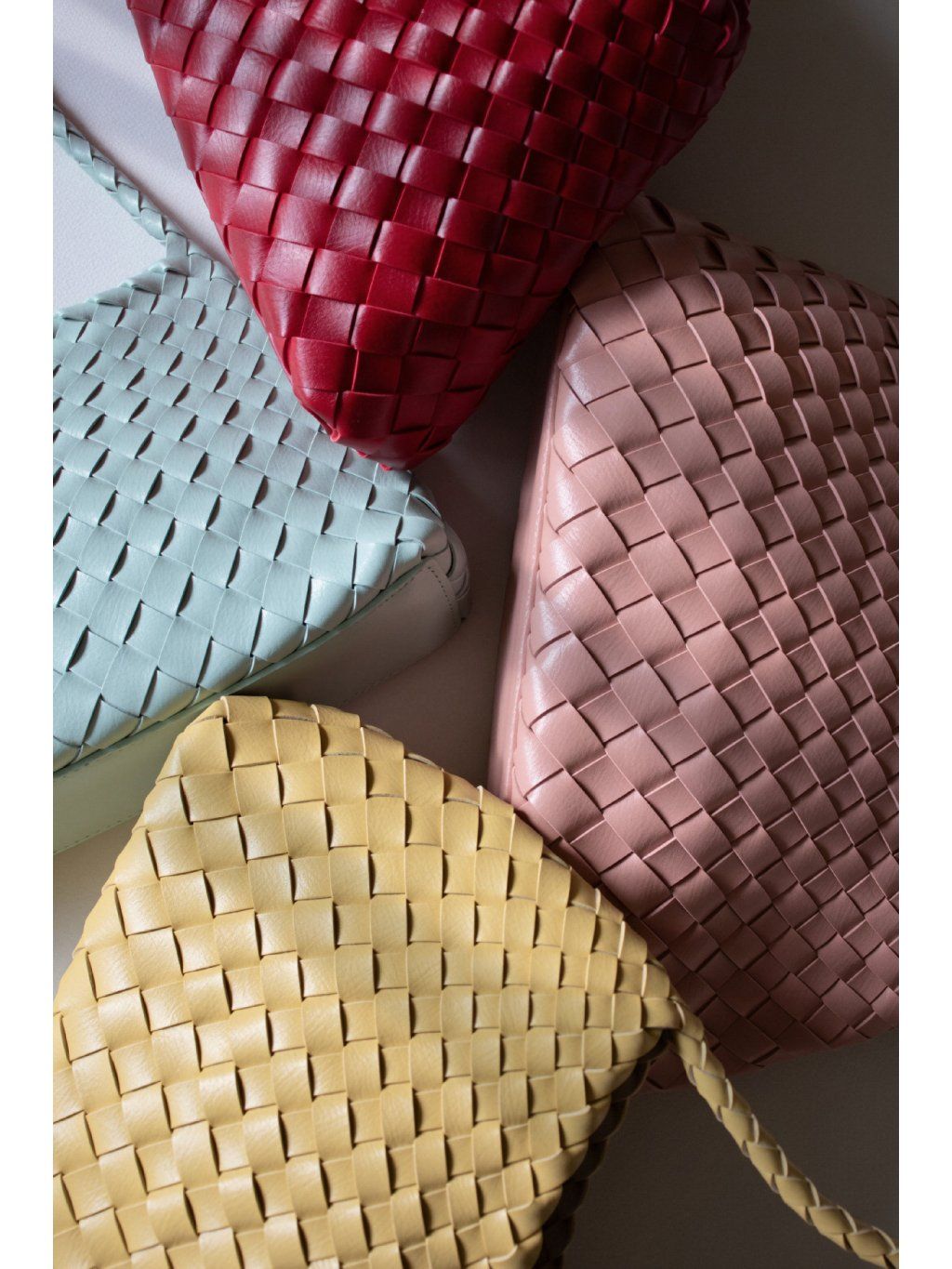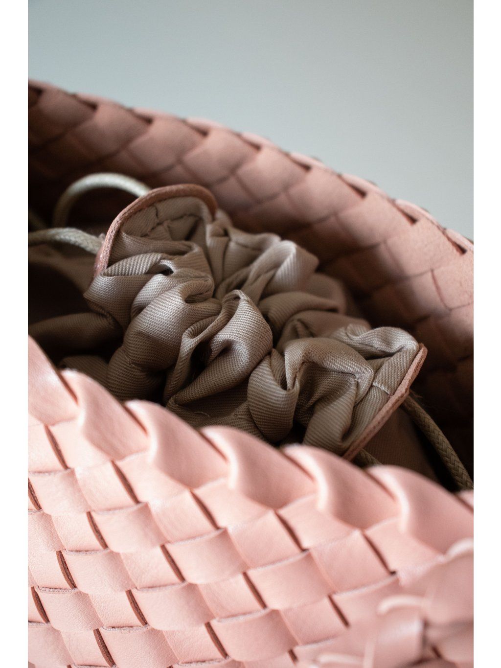 Malá proplétaná kabelka, jedno ucho, uvnitř je látkový vak/pytlík se šňůrkami na stažení, pevné dno. Materiál - kůže.