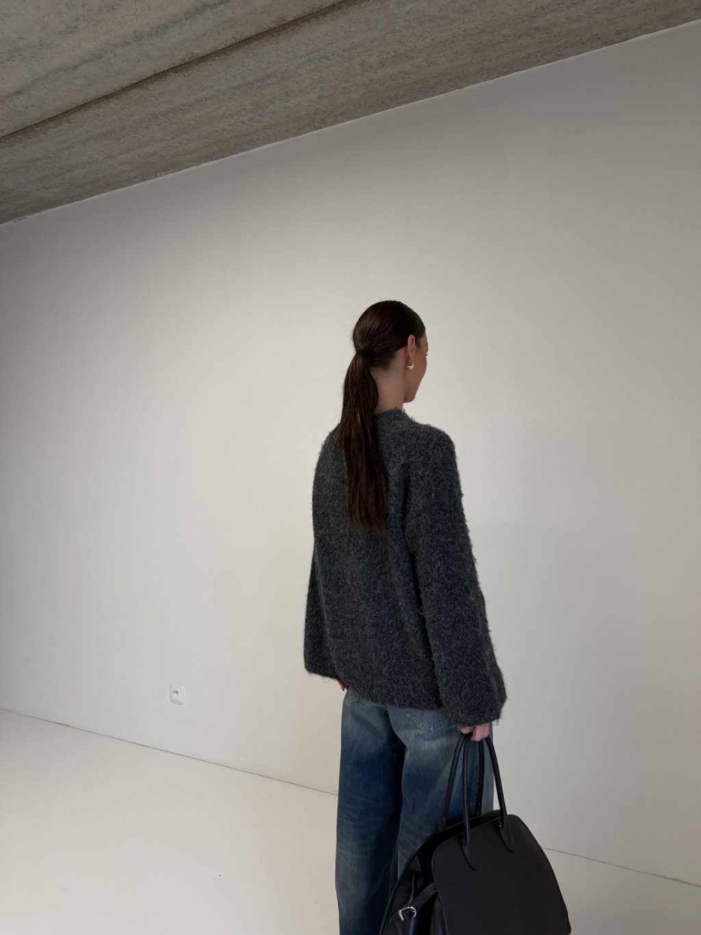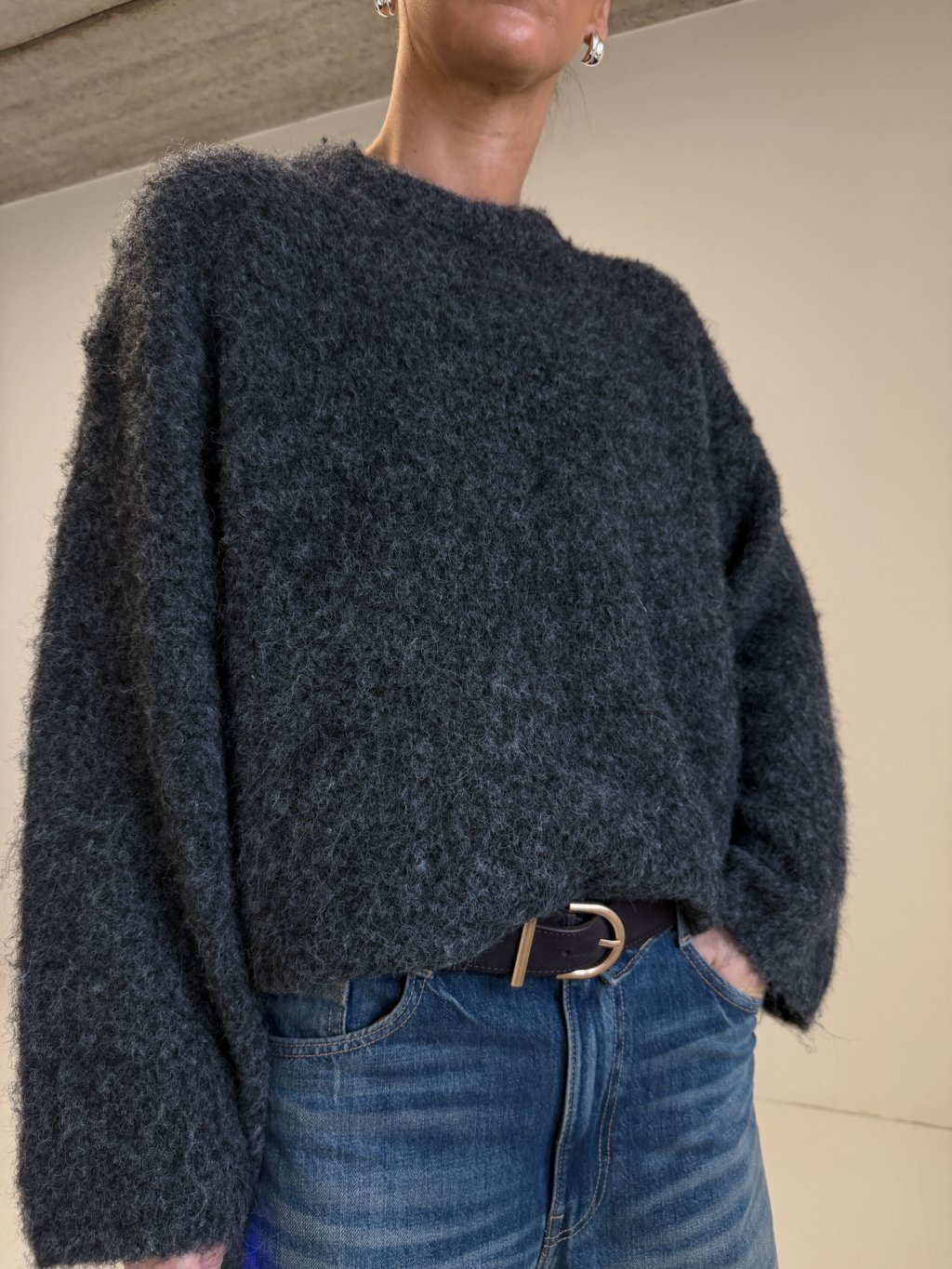 Měkký svetr volného střihu, prodloužená délka, širší rukáv, kulatý výstřih.