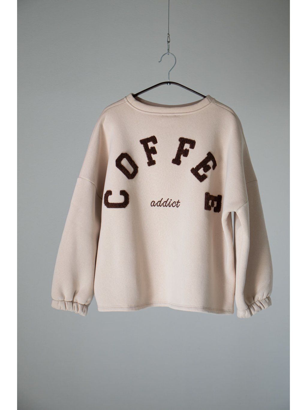Mikina s dlouhým rukávem ukončeným do gumičky, oversized střih, mírně kulatý výstřih, na zádech vyšitý hnědý nápis " COFFEE addict" . Mikina se však dá nosit i obráceně tedy s nápisem vpředu.