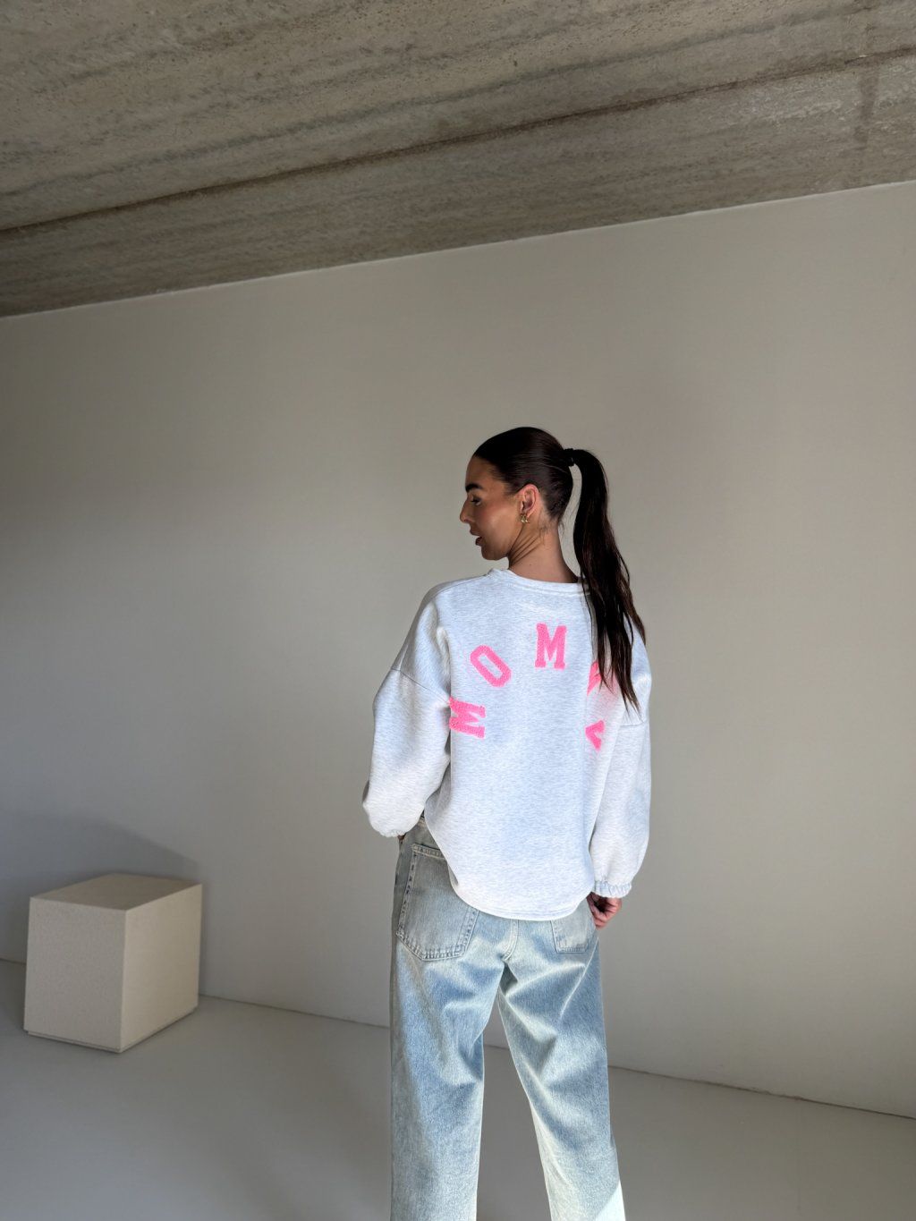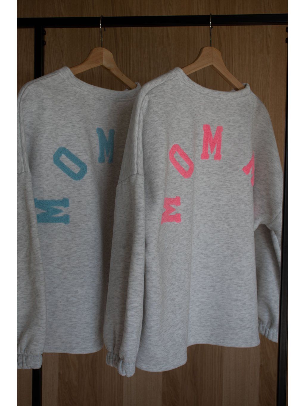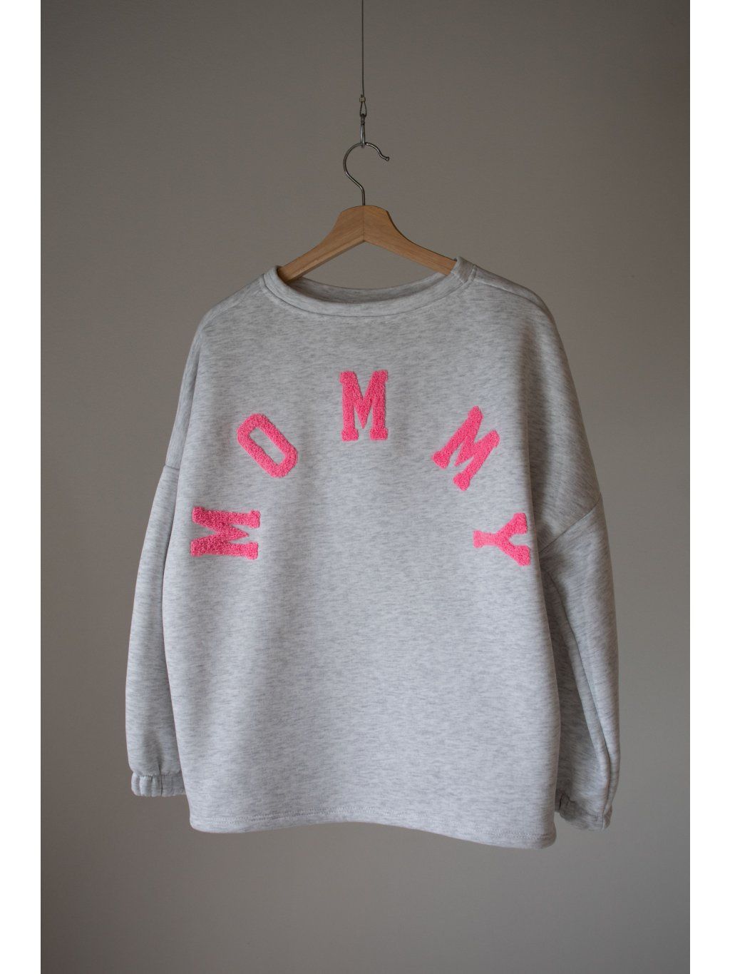 Mikina s dlouhým rukávem ukončeným do gumičky, oversized střih, mírně kulatý výstřih, na zádech vyšitý nápis " MOMMY " . Mikina se však dá nosit i obráceně tedy s nápisem vpředu.