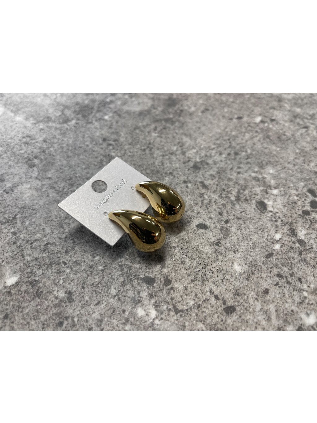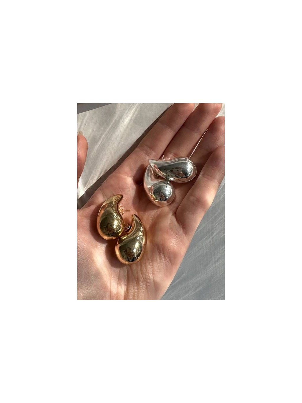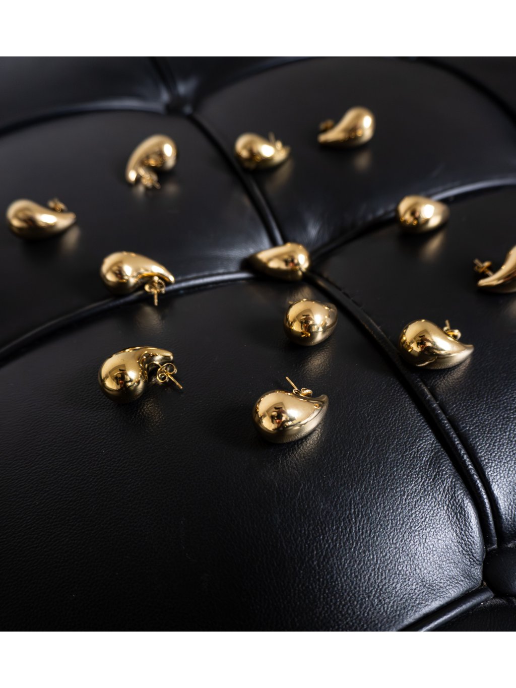 Výrazné zlaté náušnice ve tvaru kapky.