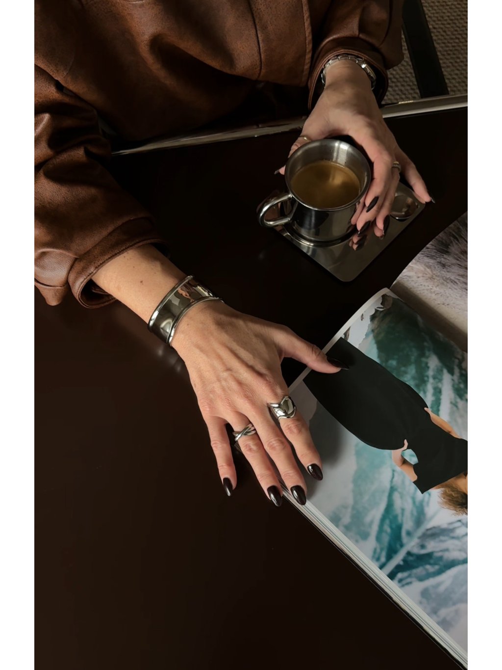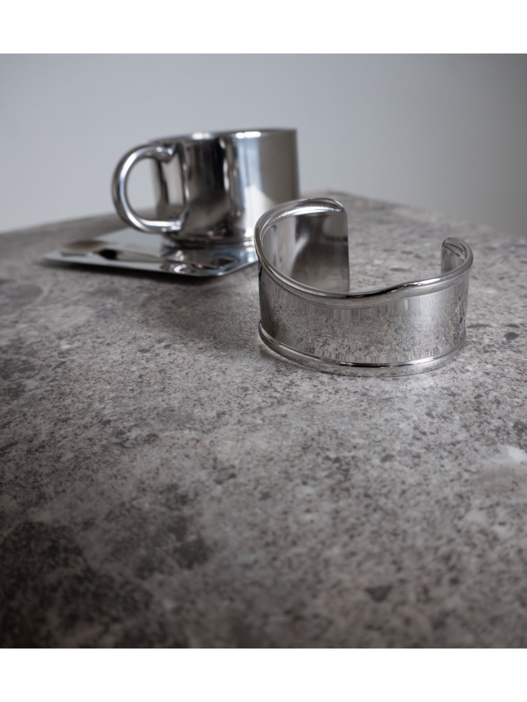 Kovový náramek se zvýrazněnými okraji, otevřený, organický tvar.