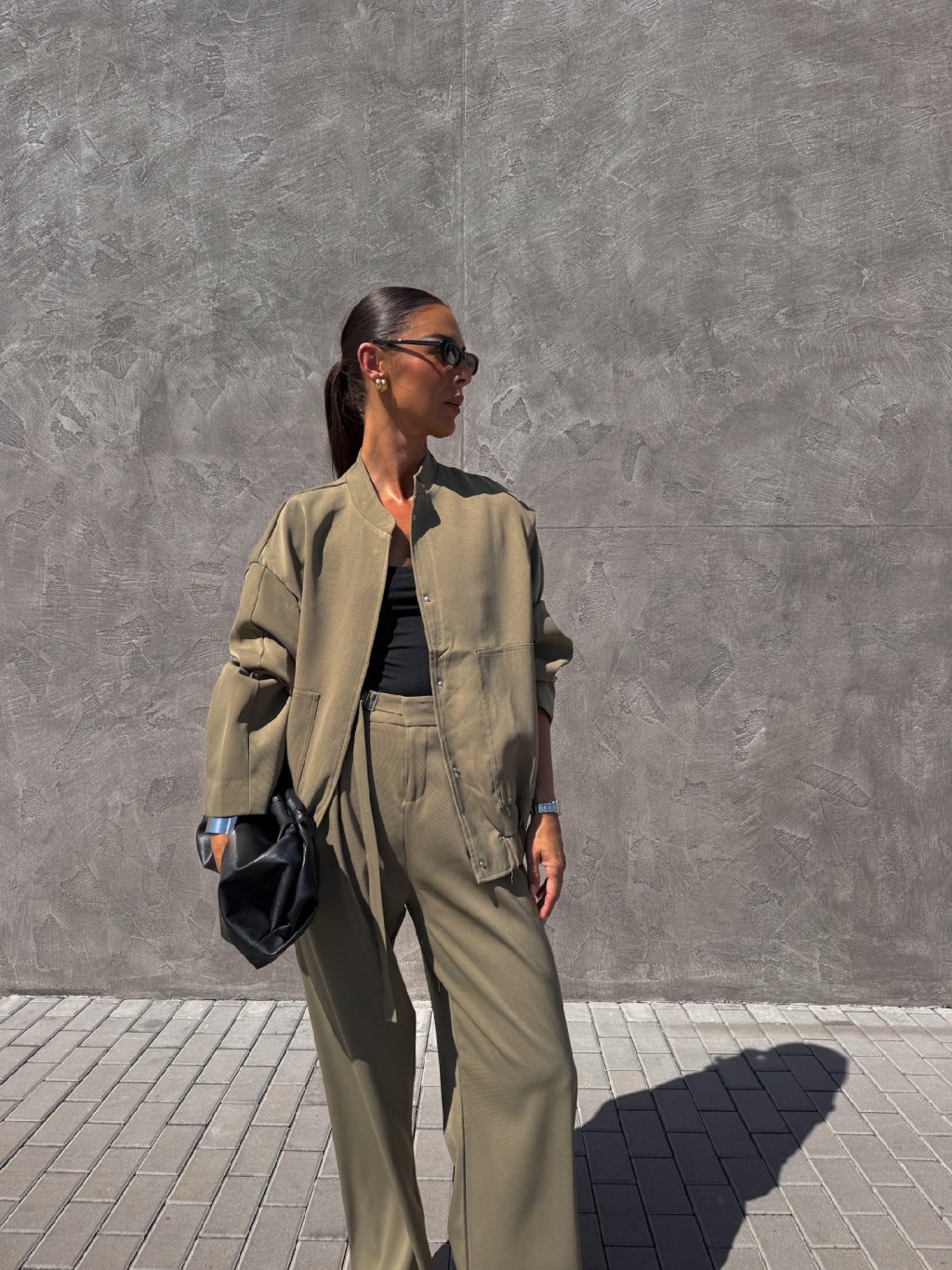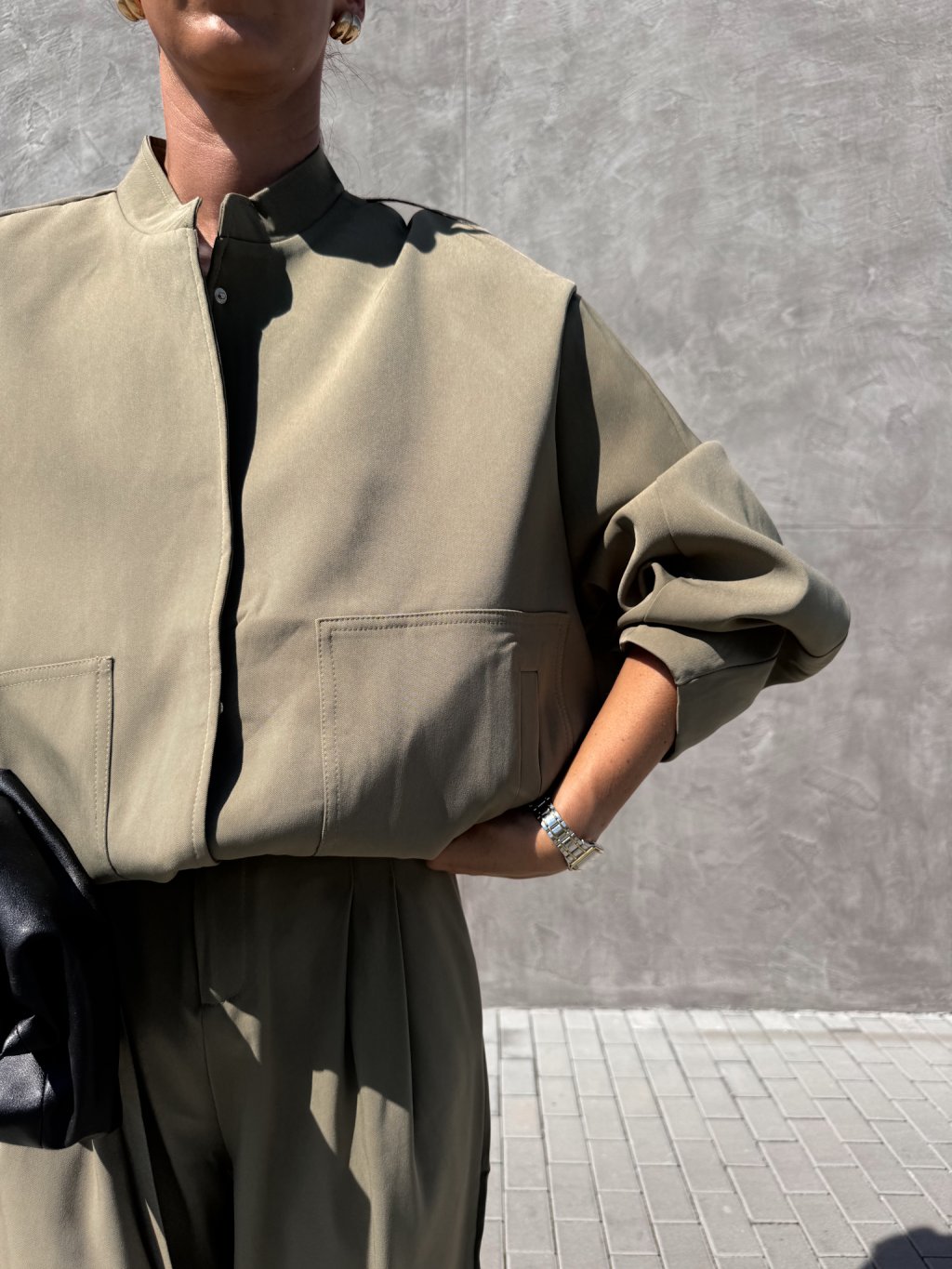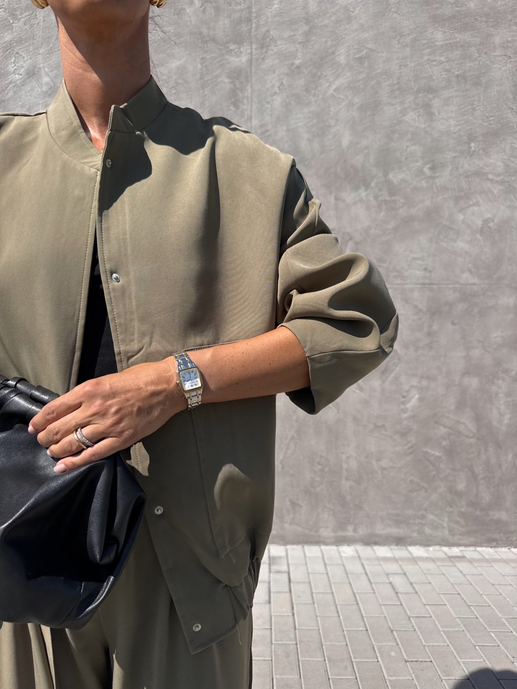 Oversized bomber, prodloužená délka, na bocích kapsy, zapínání na cvoky.