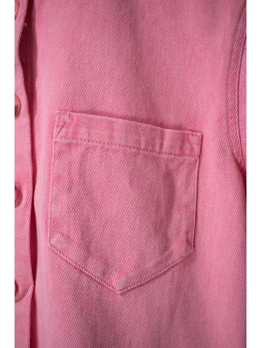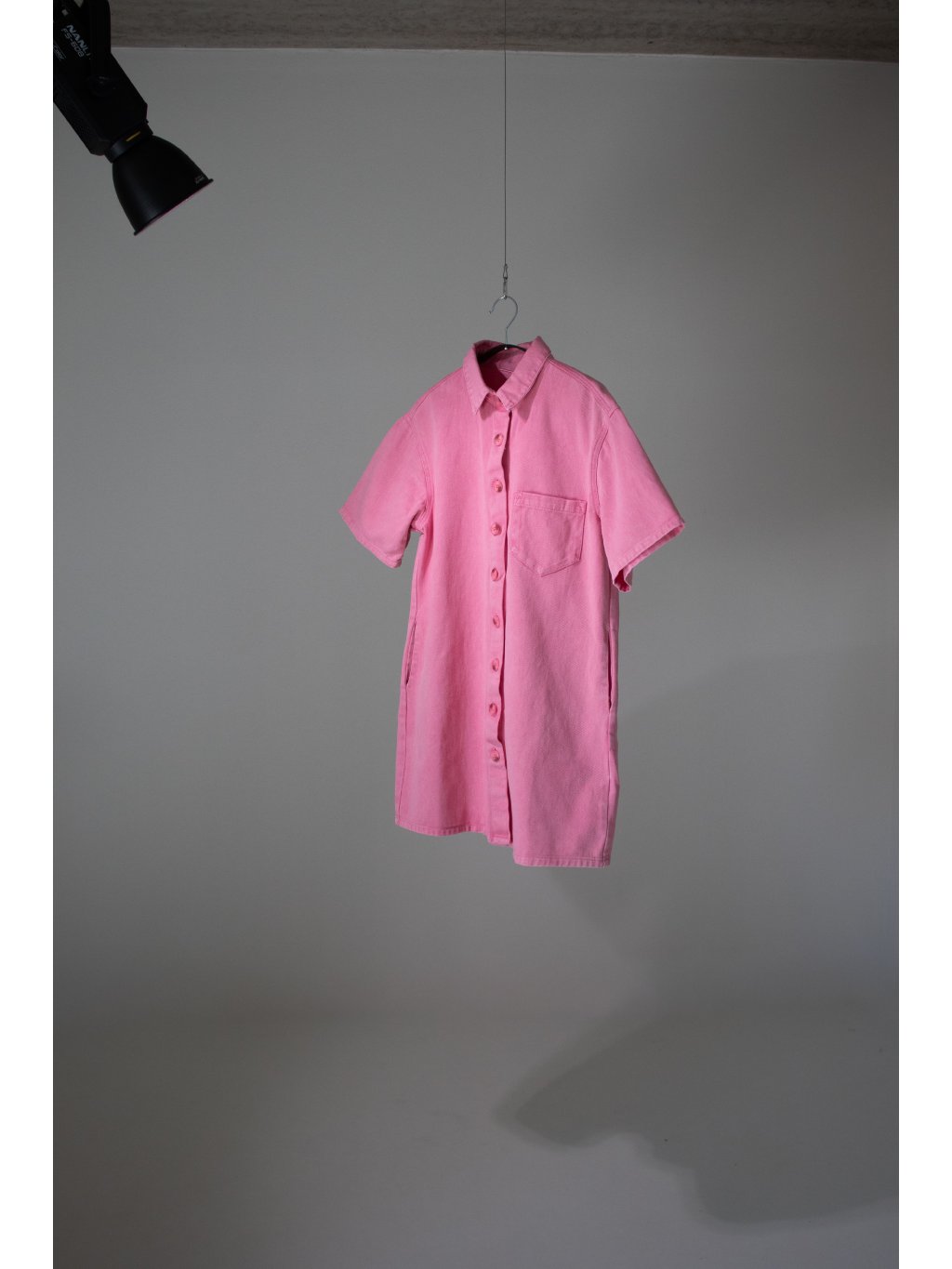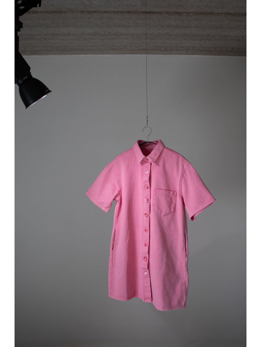 Denim šaty oversized střihu, volný krátký rukáv, celopropínací na růžový žíhaný knoflík, límeček, na levé straně jedna náprsní kapsička, boční kapsy.