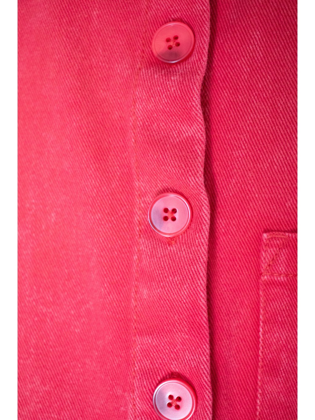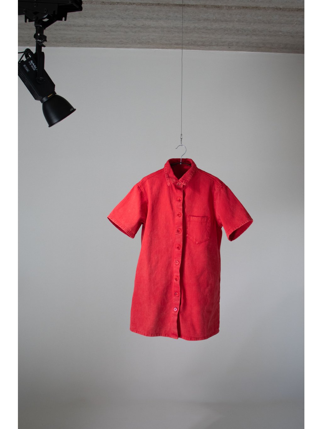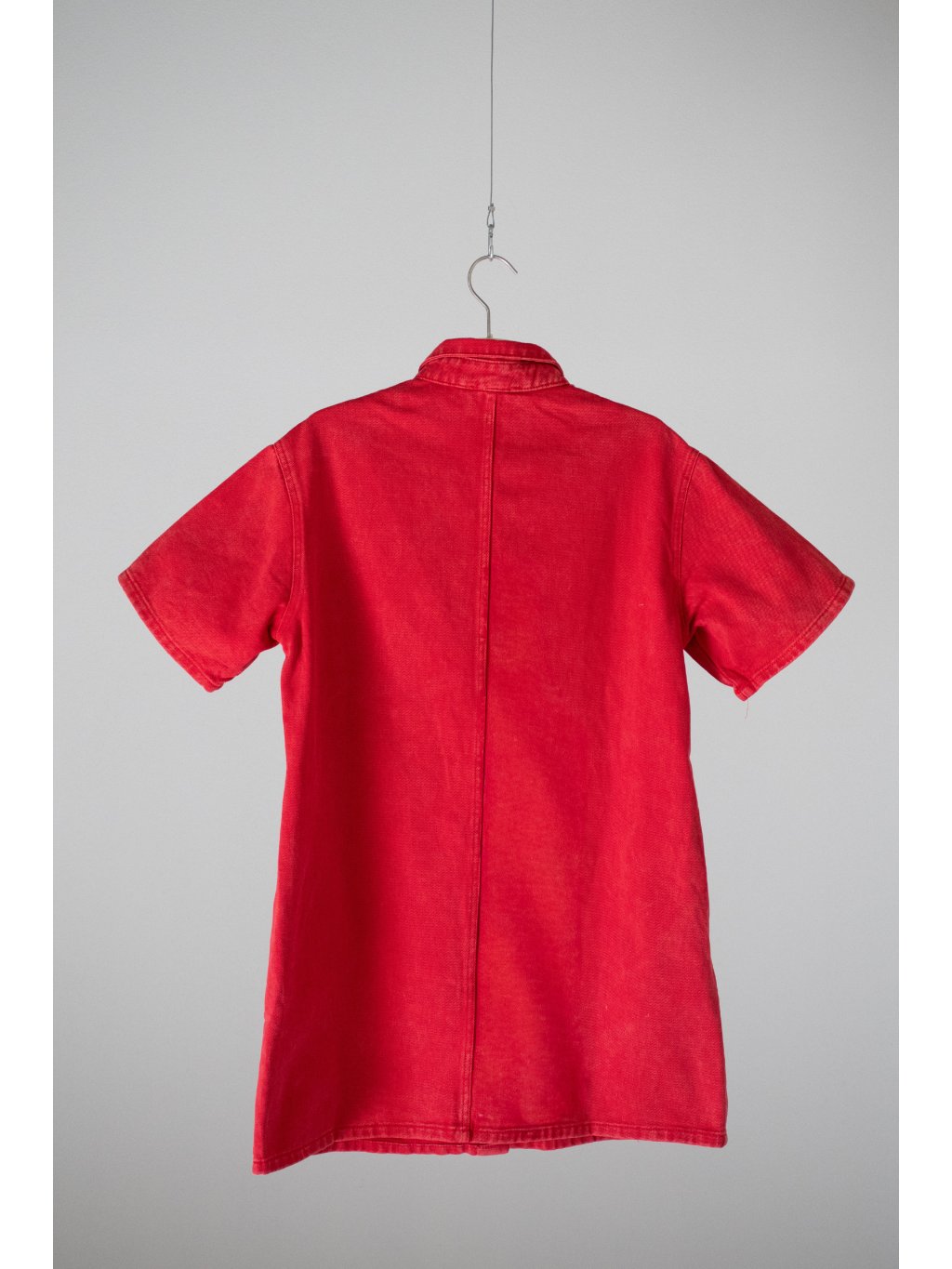 Denim šaty oversized střihu, volný krátký rukáv, celopropínací na červený žíhaný knoflík, límeček, na levé straně jedna náprsní kapsička, boční kapsy.