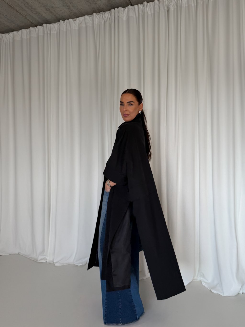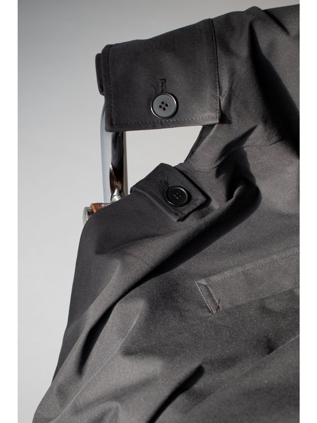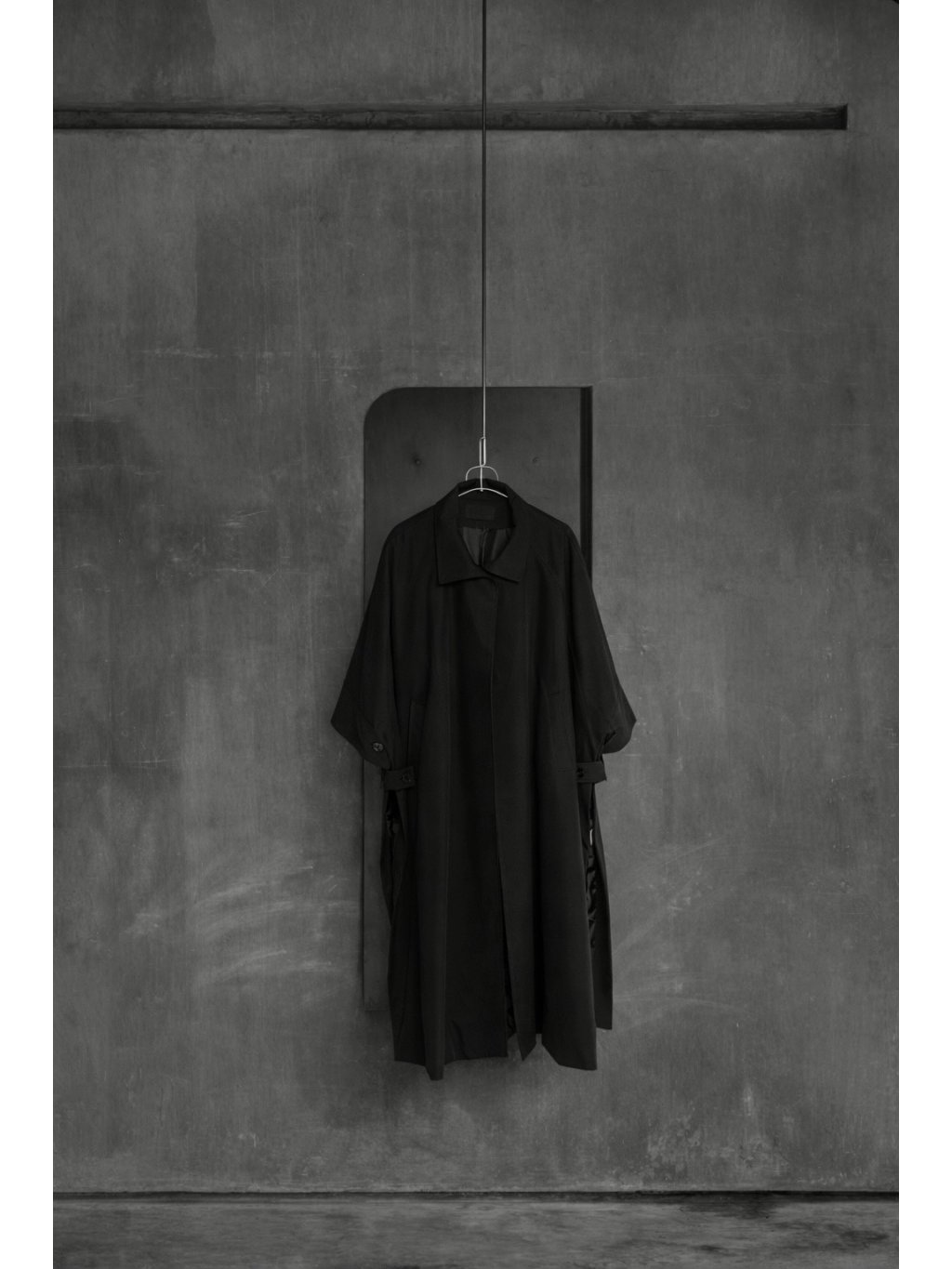 Oversized dlouhý trench coat se 3/4 rukávy, zapínání na knoflík u krku. Na bocích po celé délce rozparek, pod rukávem klopa s knoflíkem. Má podšívku a přední kapsy.