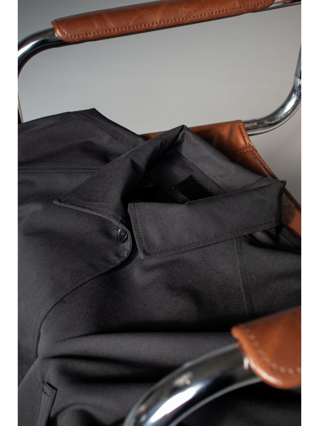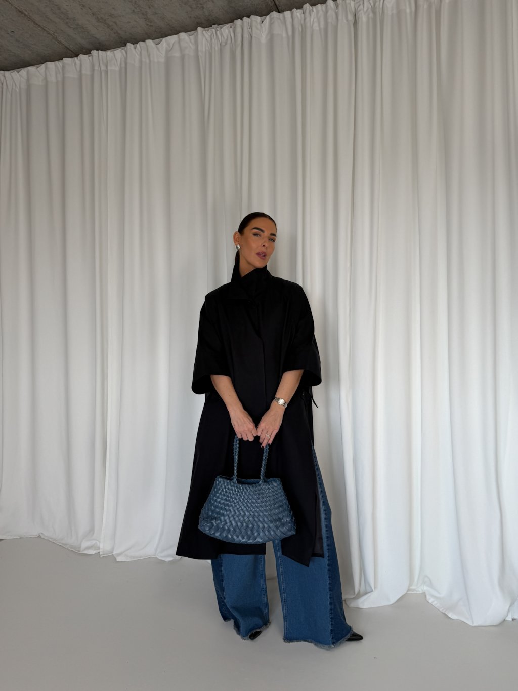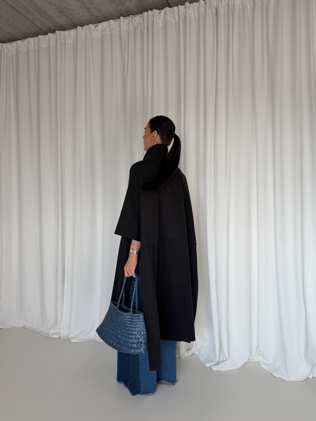 Oversized dlouhý trench coat se 3/4 rukávy, zapínání na knoflík u krku. Na bocích po celé délce rozparek, pod rukávem klopa s knoflíkem. Má podšívku a přední kapsy.