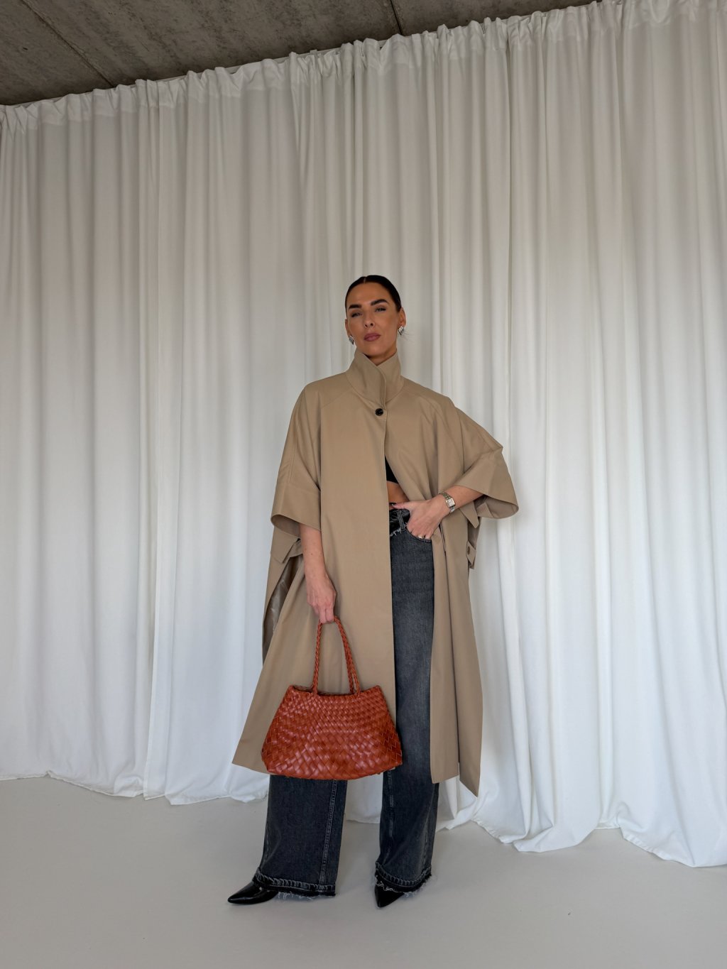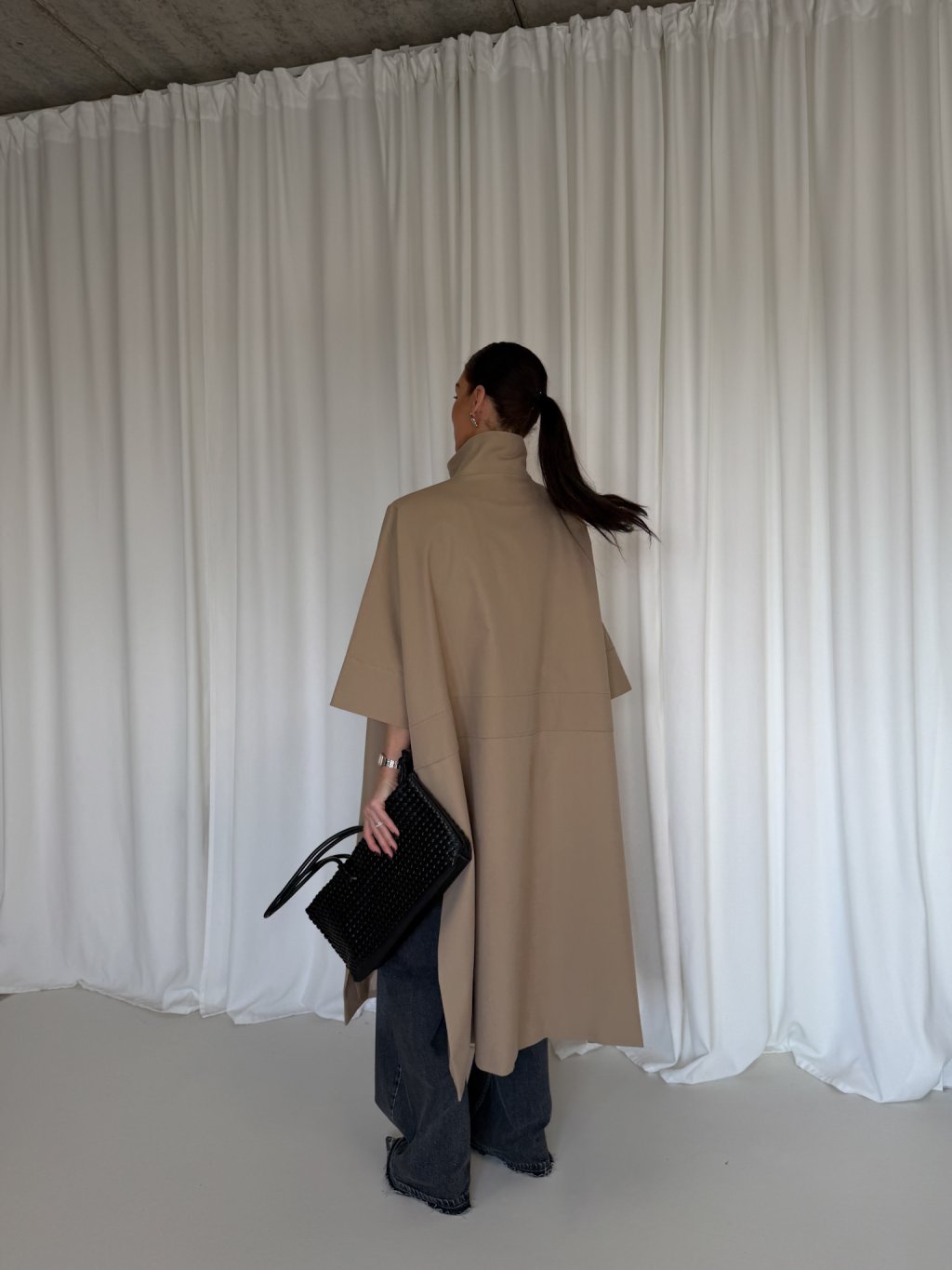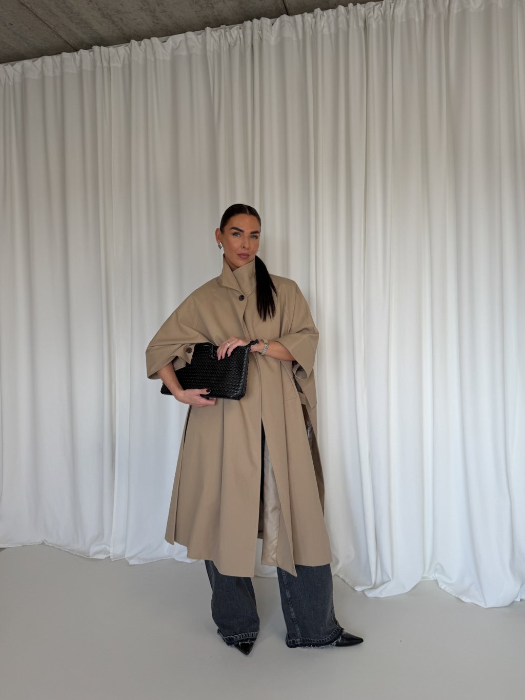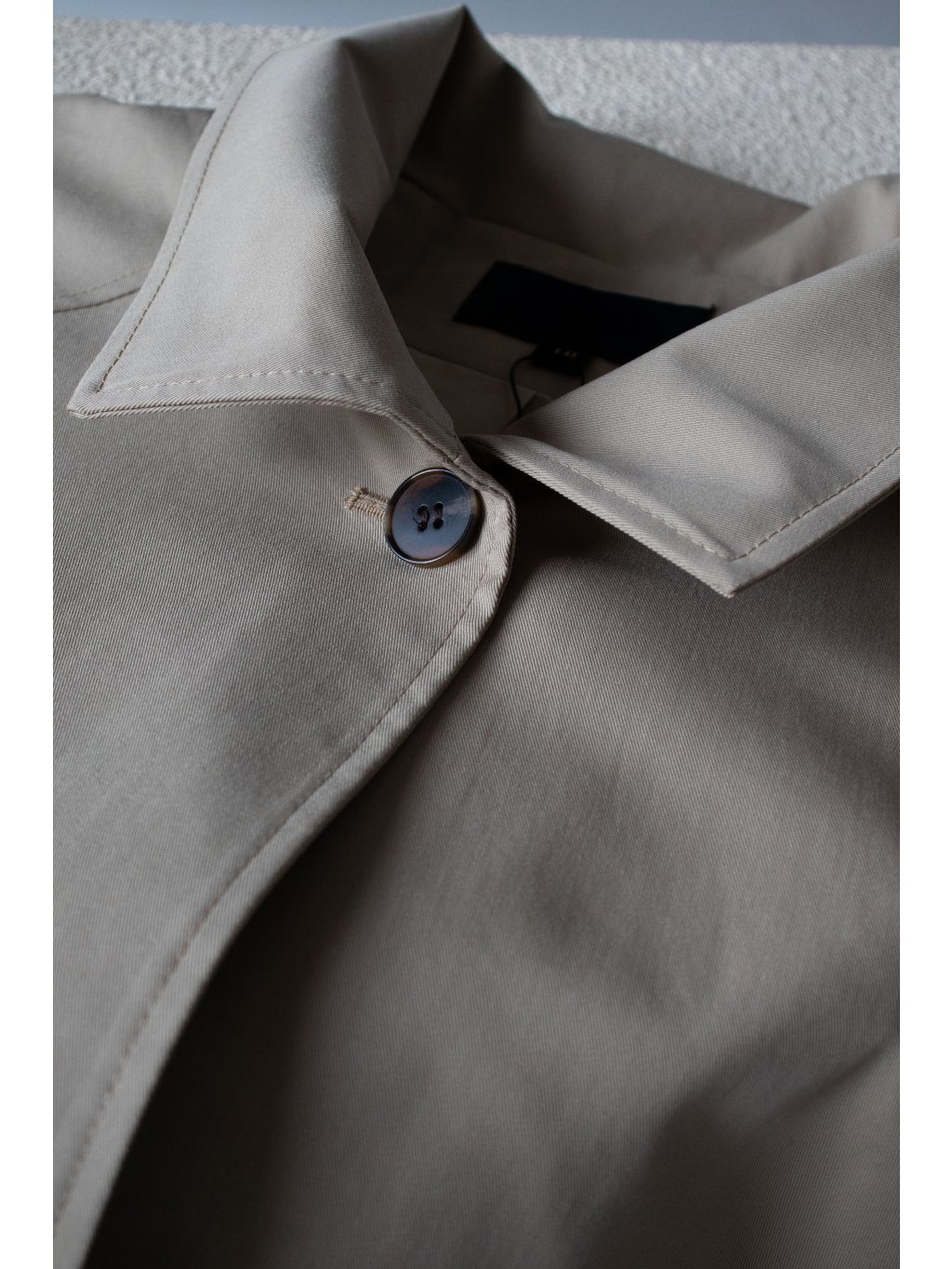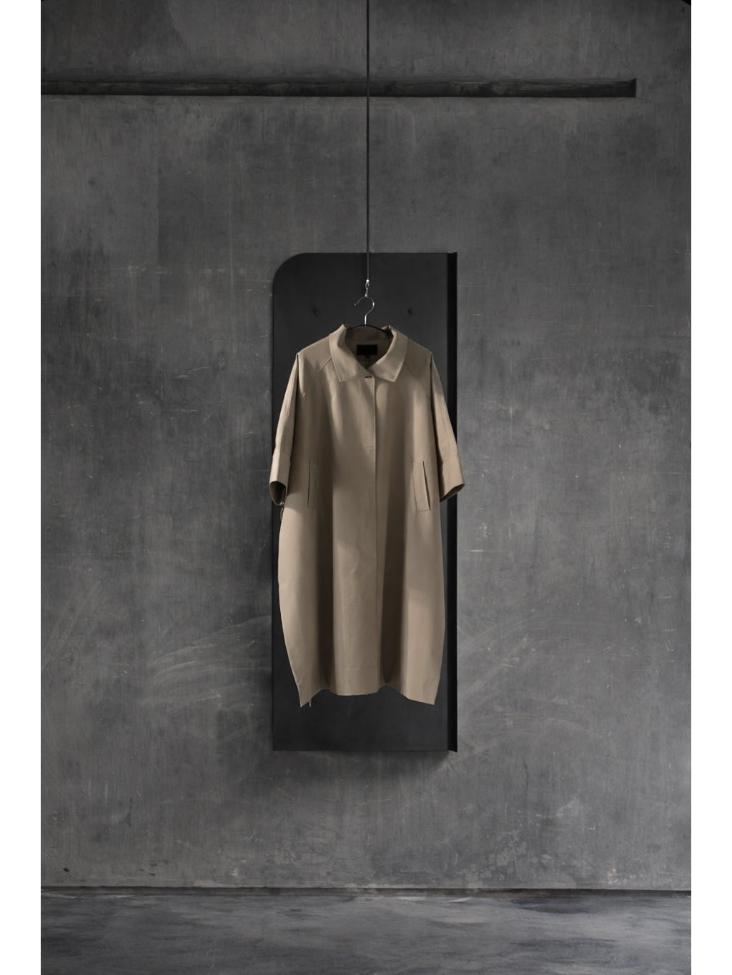 Oversized dlouhý trench coat se 3/4 rukávy, zapínání na knoflík u krku. Na bocích po celé délce rozparek, pod rukávem klopa s knoflíkem. Má podšívku a přední kapsy.