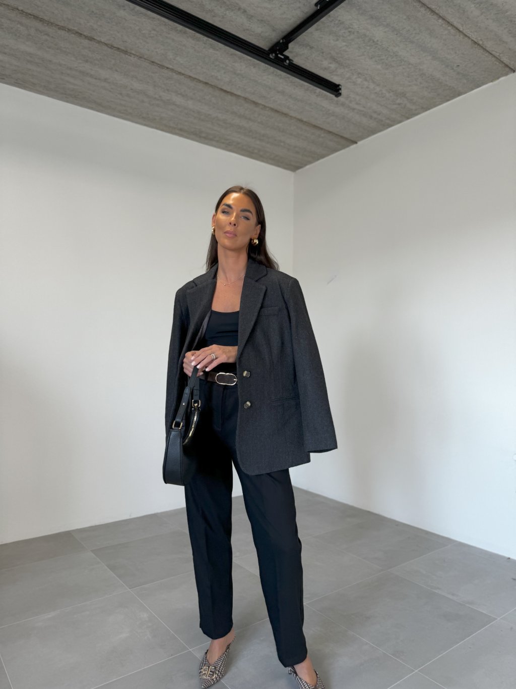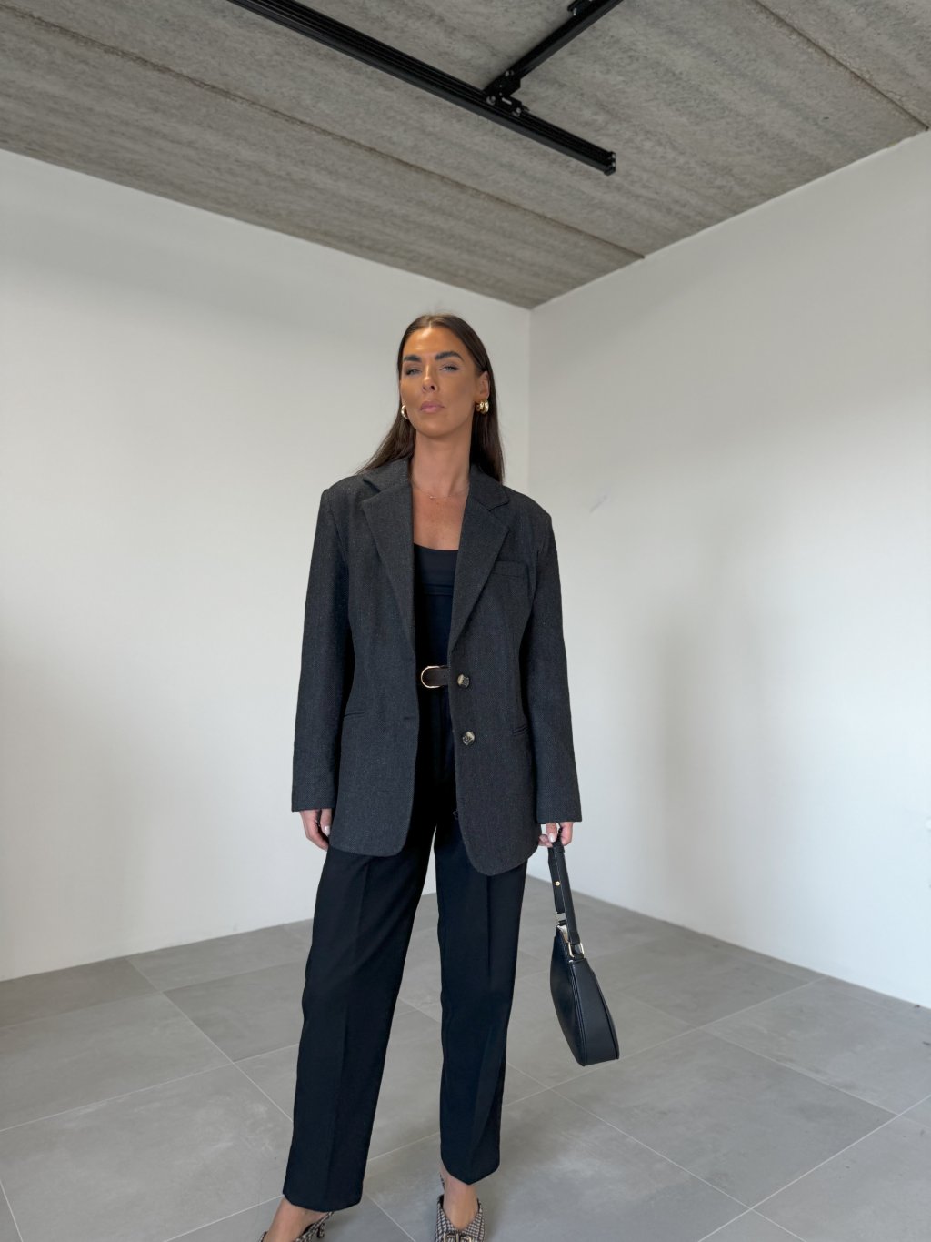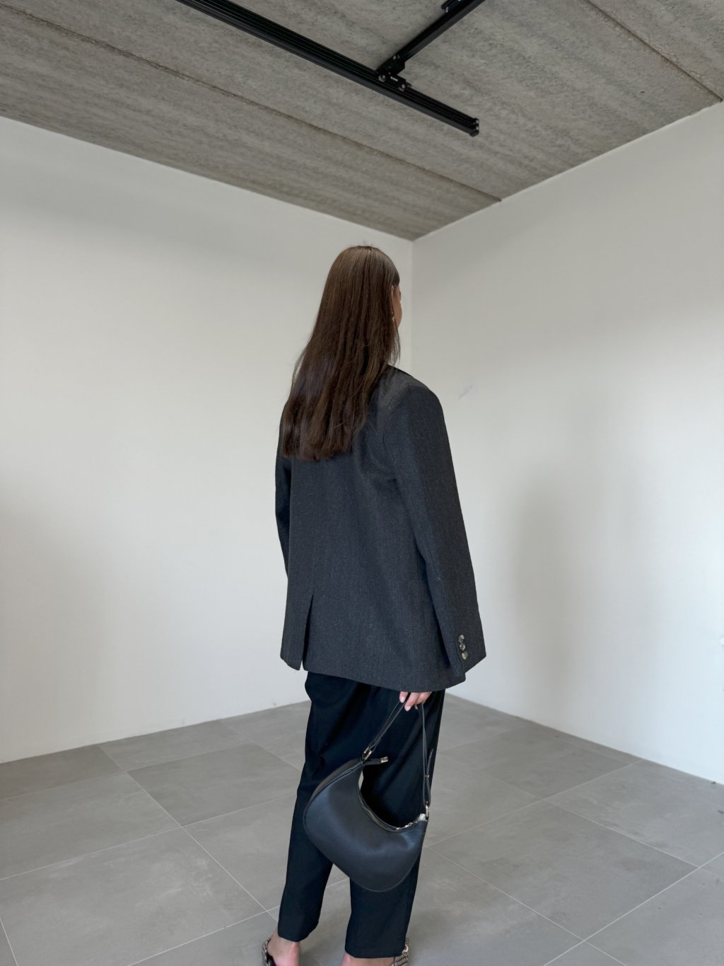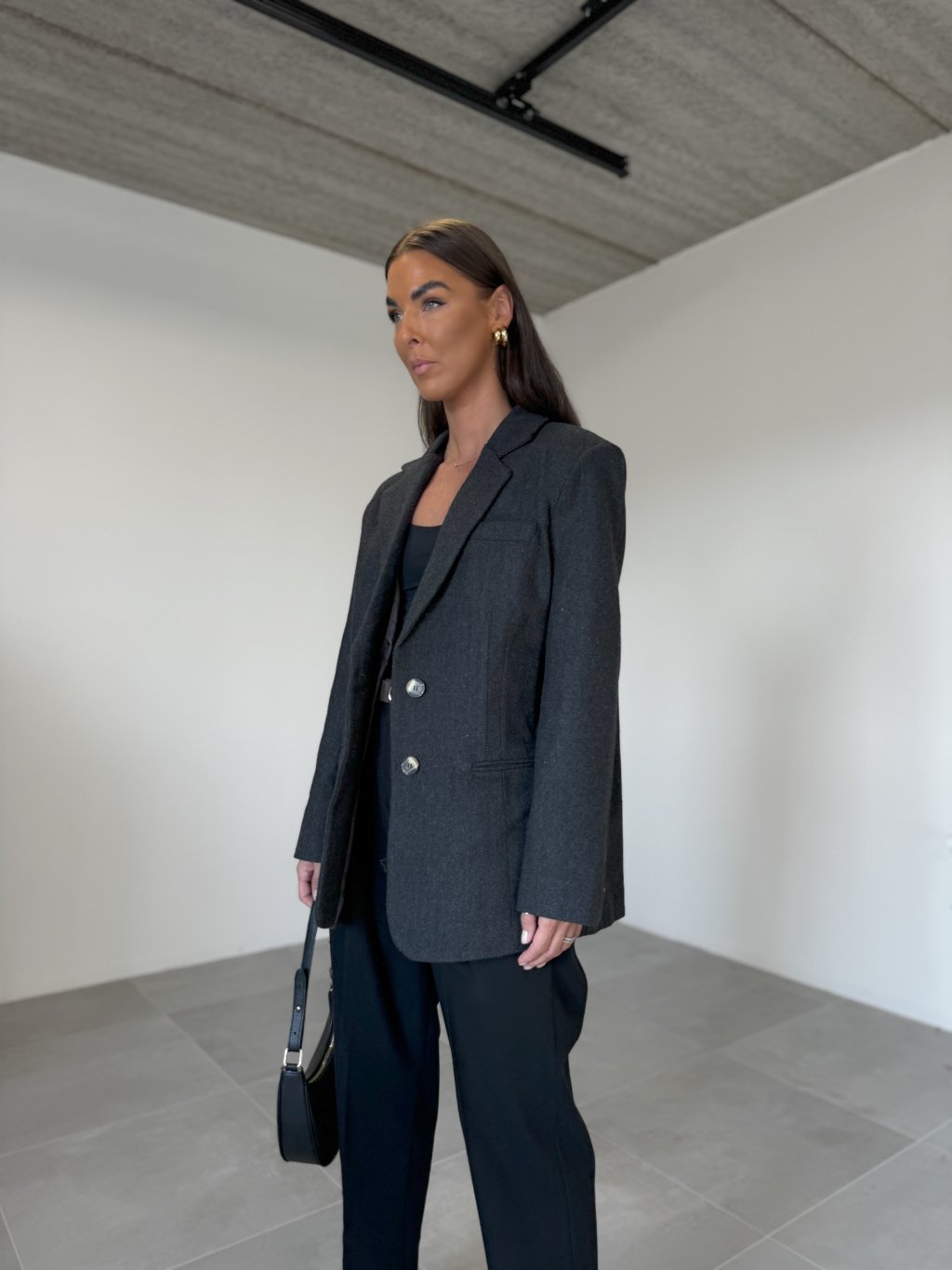 Oversized tvídové sako, pevný, hutný, teplý materiál. Podšívka, volný střih, prodloužená délka.