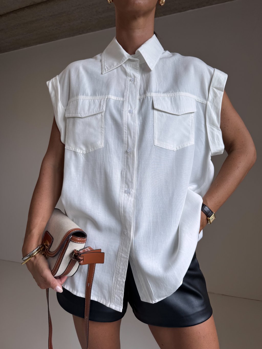 Košile bez rukávů, zapínání na knoflíky, na prsou kapsy s klopami, na zádech záševky.