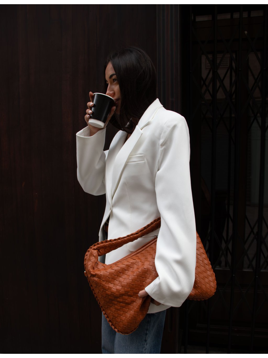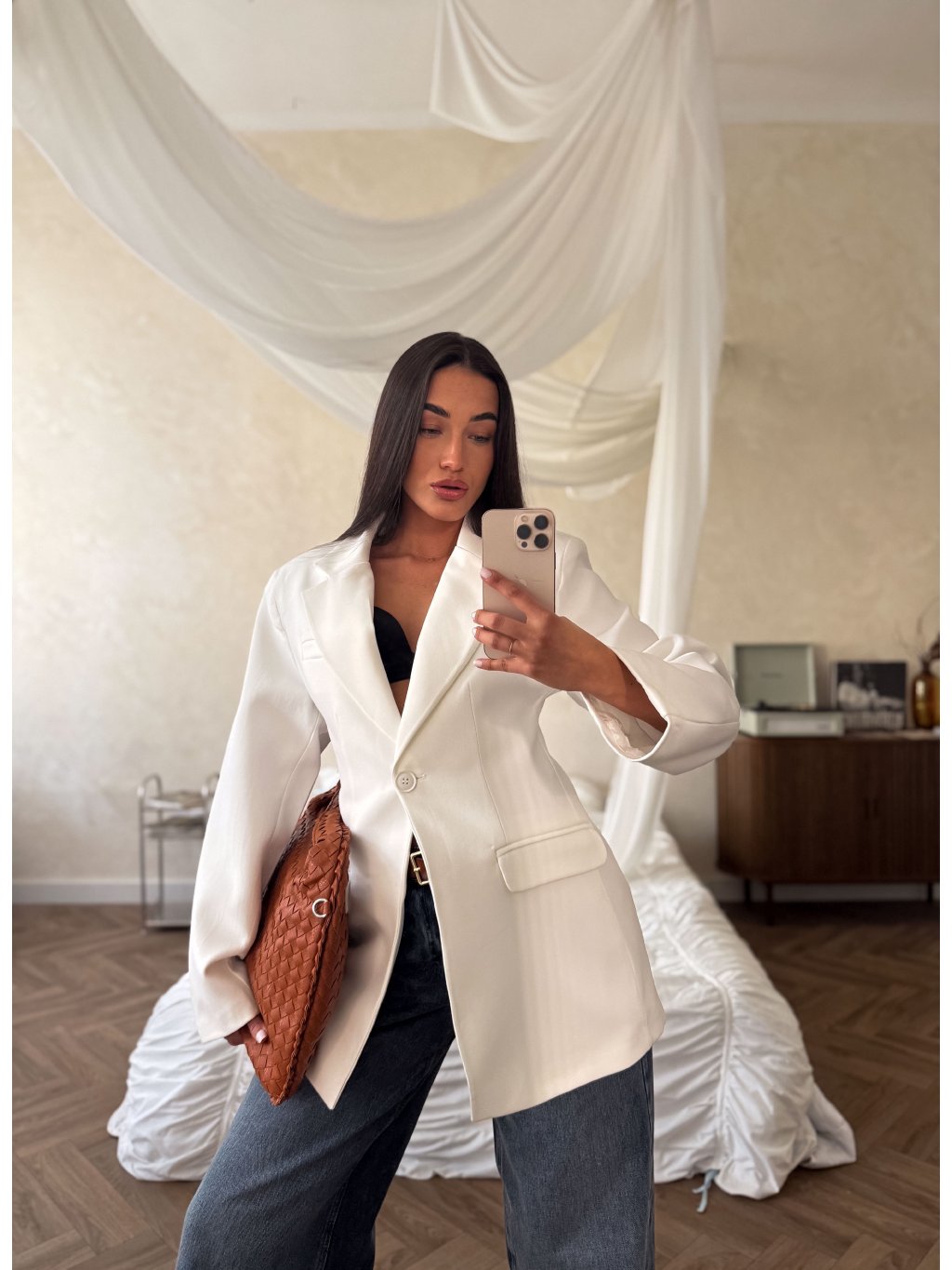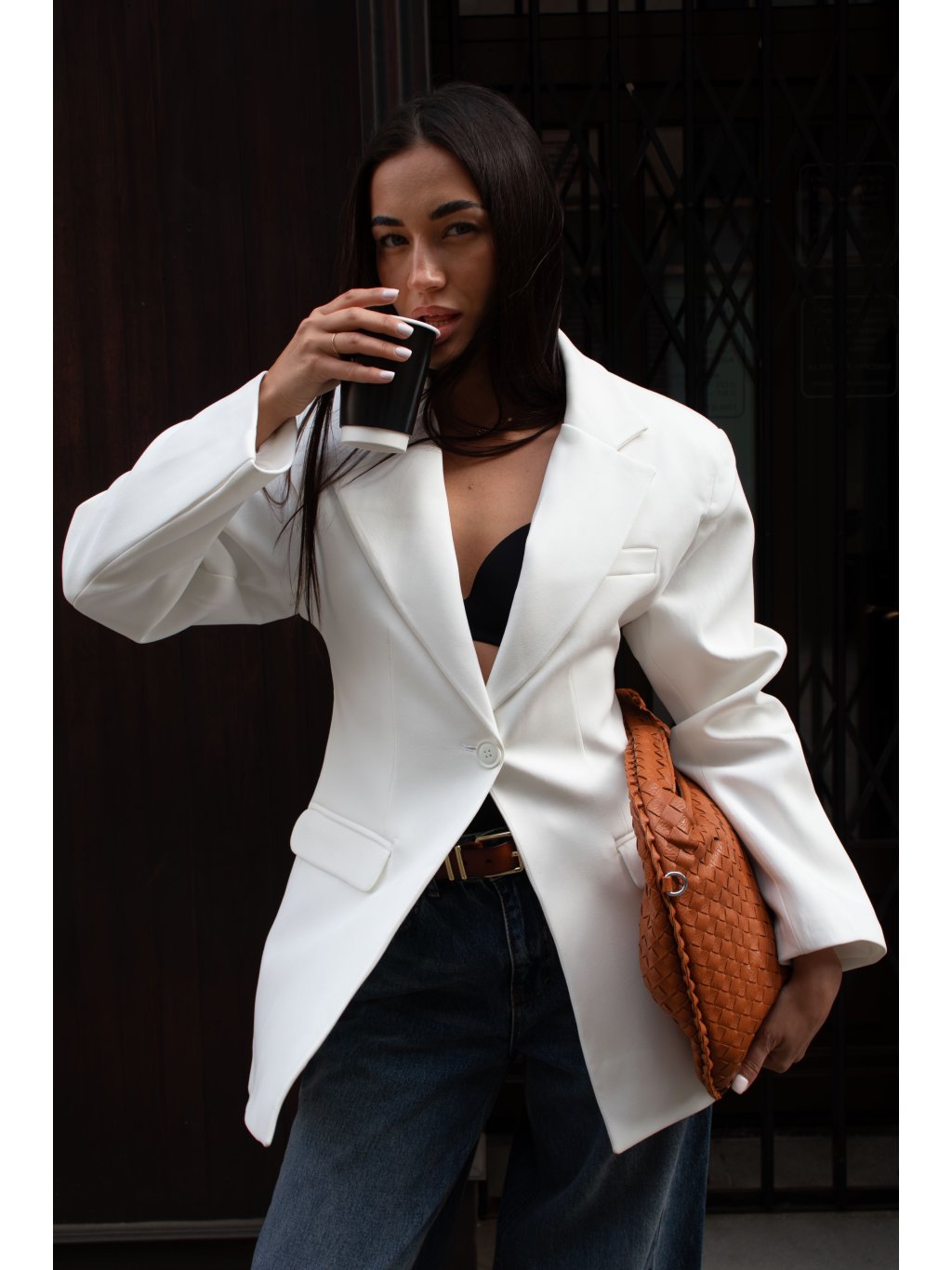 Sako s výraznými ramenními vycpávkami, zúžení v pase/hourglass střih, prodloužená délka, zapínání na jeden bílý knoflík, přední kapsy s klopou, vlevo jedna kapsička na hrudi, podšívka.
