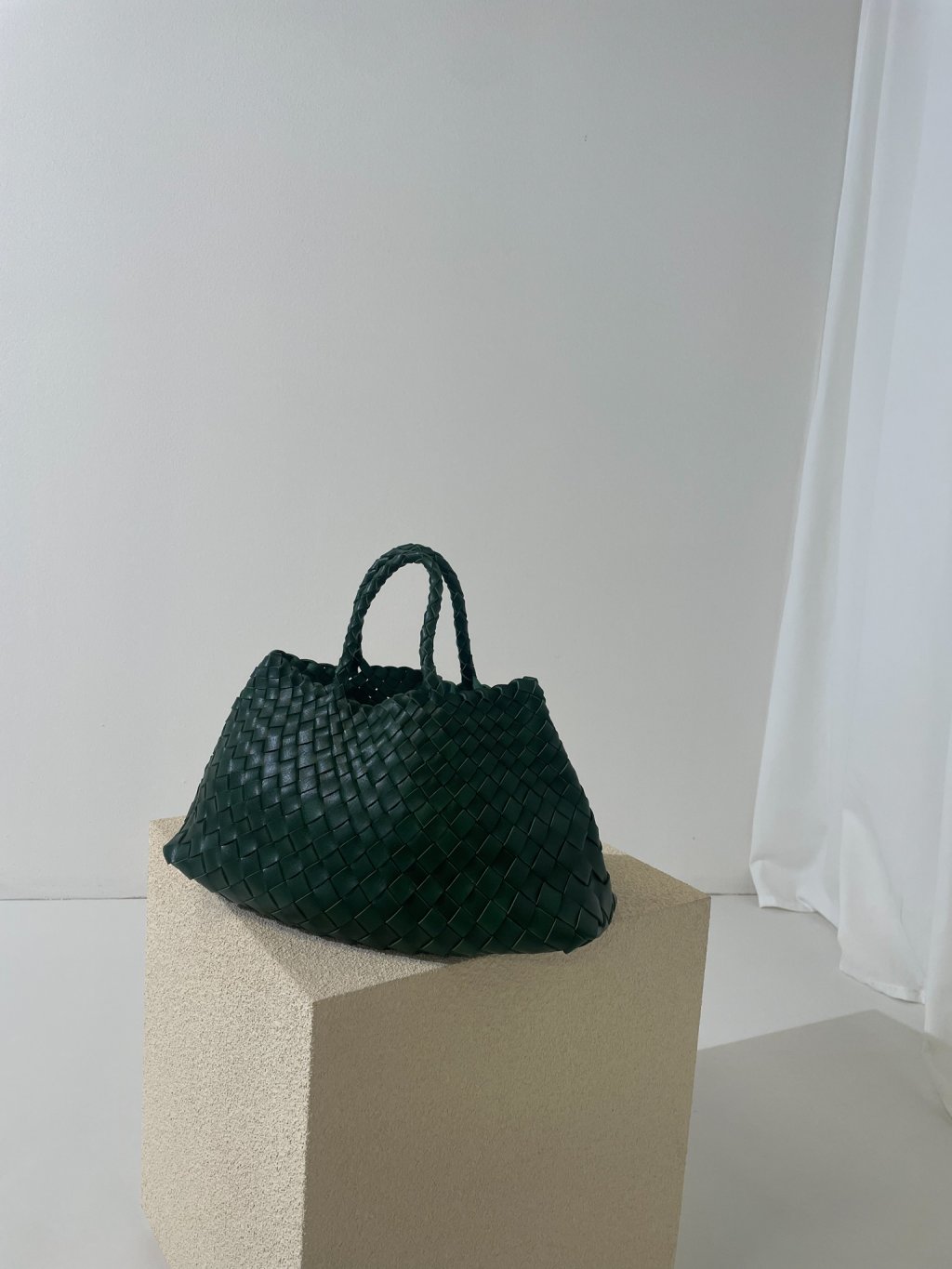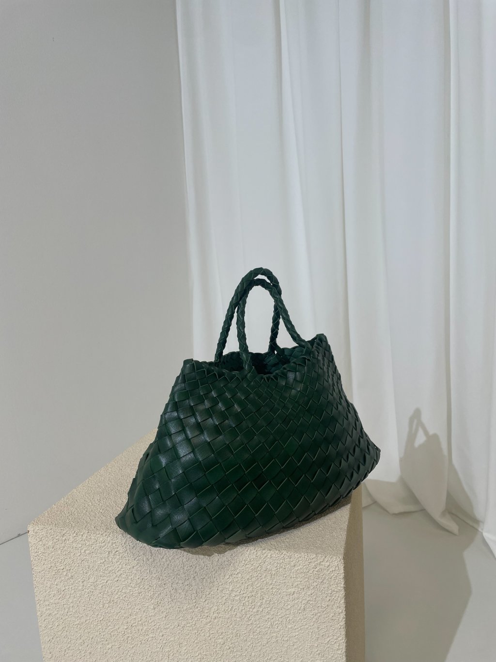 Kožená středně velká proplétaná taška, pevné dno, krátká ucha, uvnitř je textilní vak/pytlík s kapsičkou na zip. Vak má šňůrky na stažení.