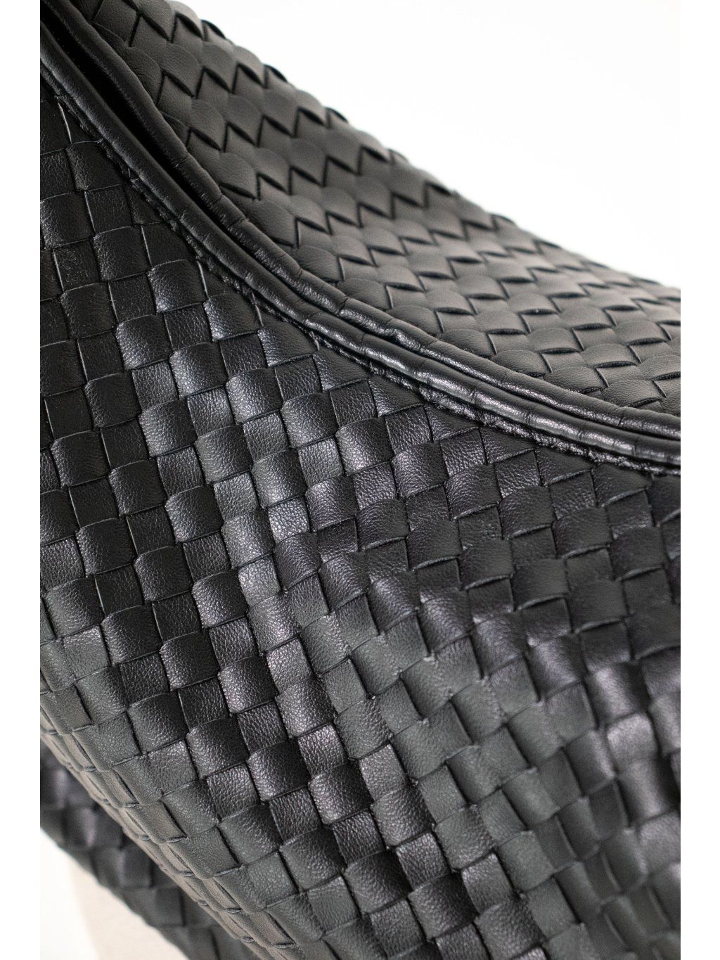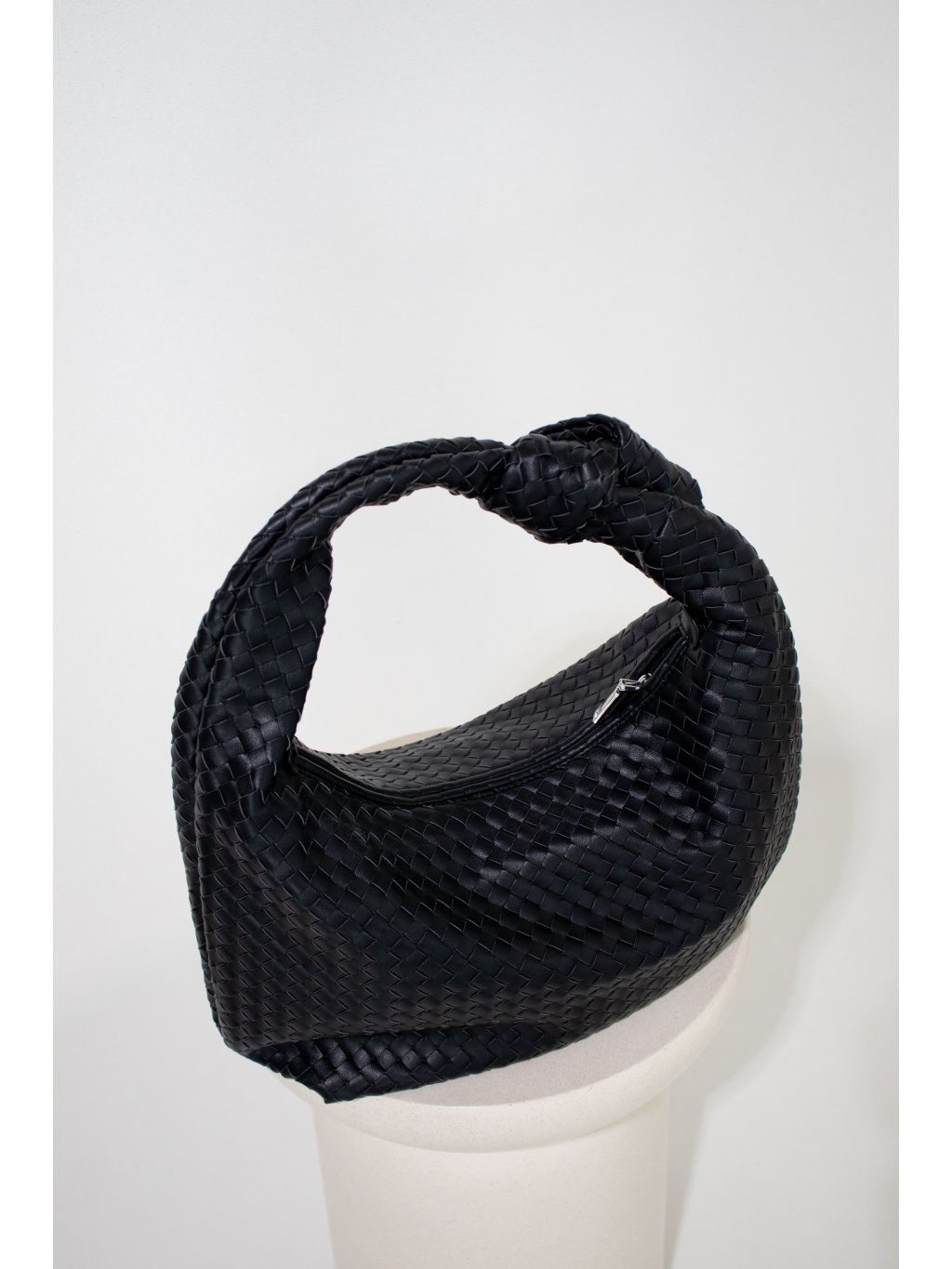 Proplétaná kabelka s detailem uzlu na uchu z eko kůže, tvar " půl měsíce", zapínání na zip v černé barvě, uvnitř kapsička na zip a jedna otevřená kapsička.