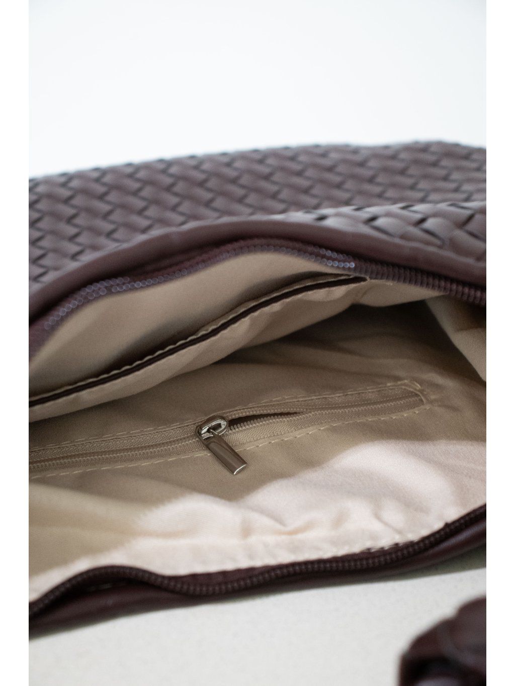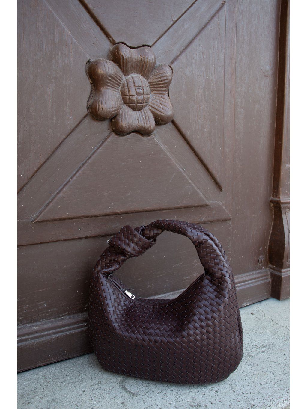 Proplétaná kabelka s detailem uzlu na uchu, tvar " půl měsíce", zapínání na zip v hnědé barvě, uvnitř kapsička na zip a jedna otevřená kapsička.