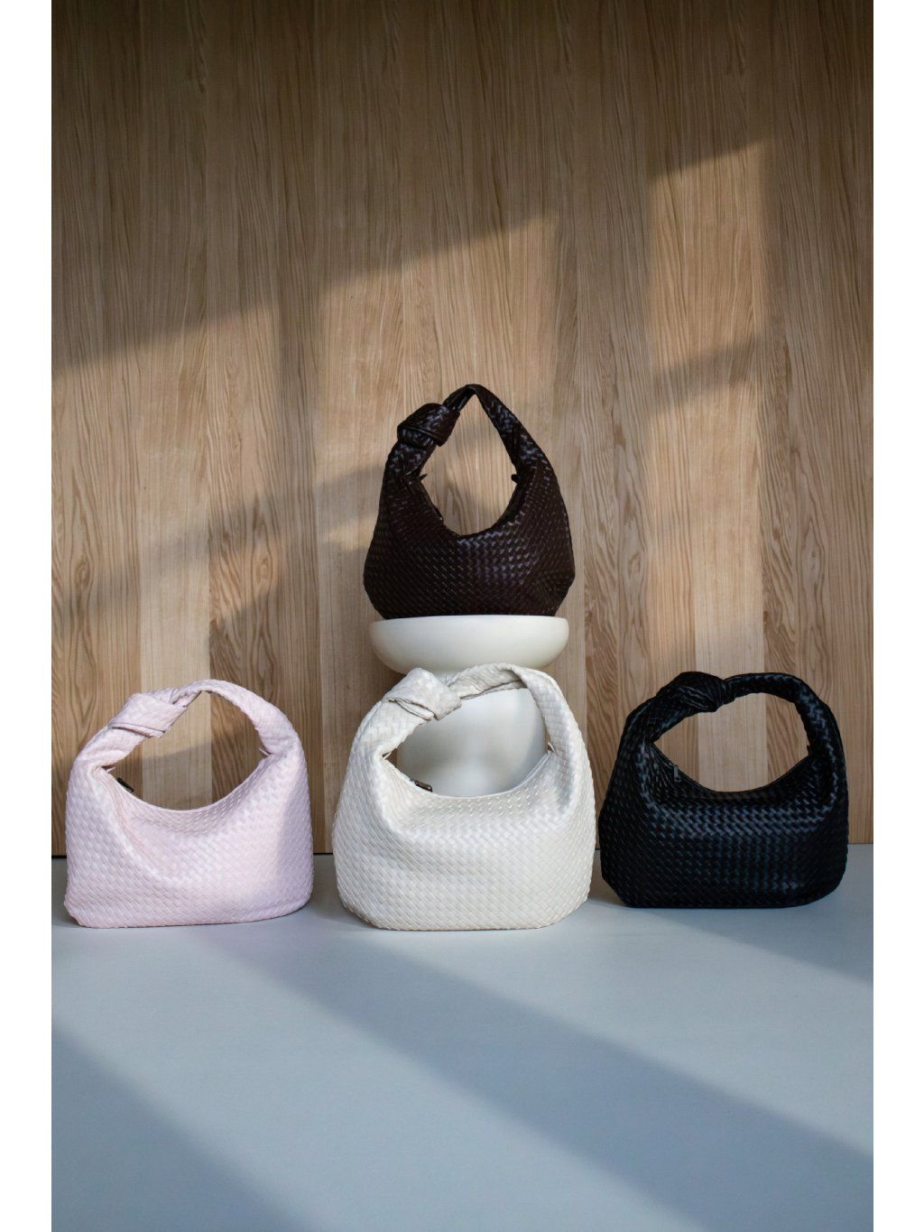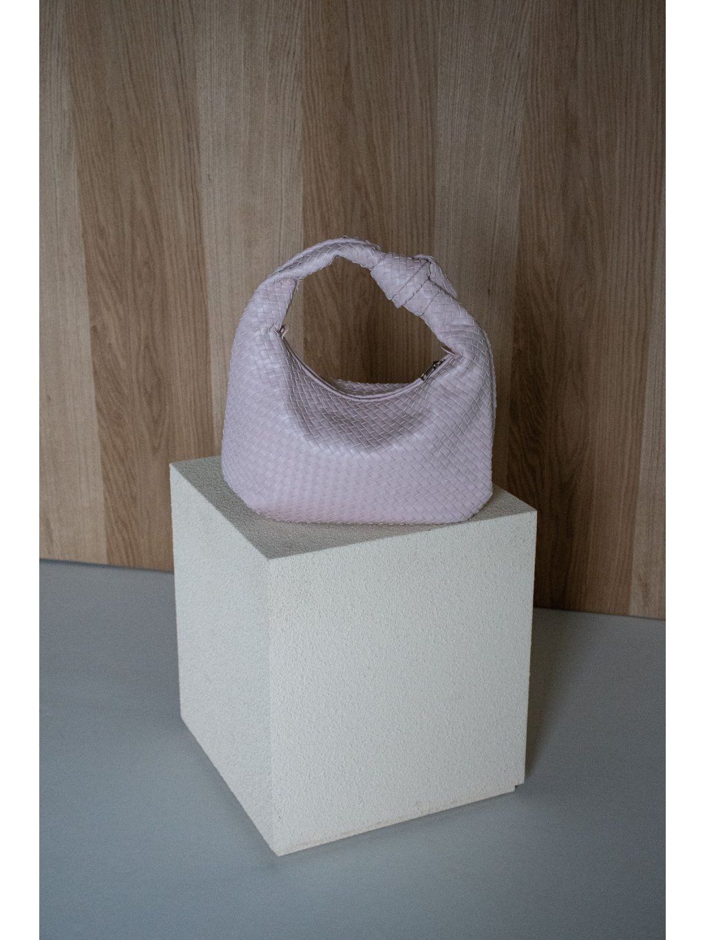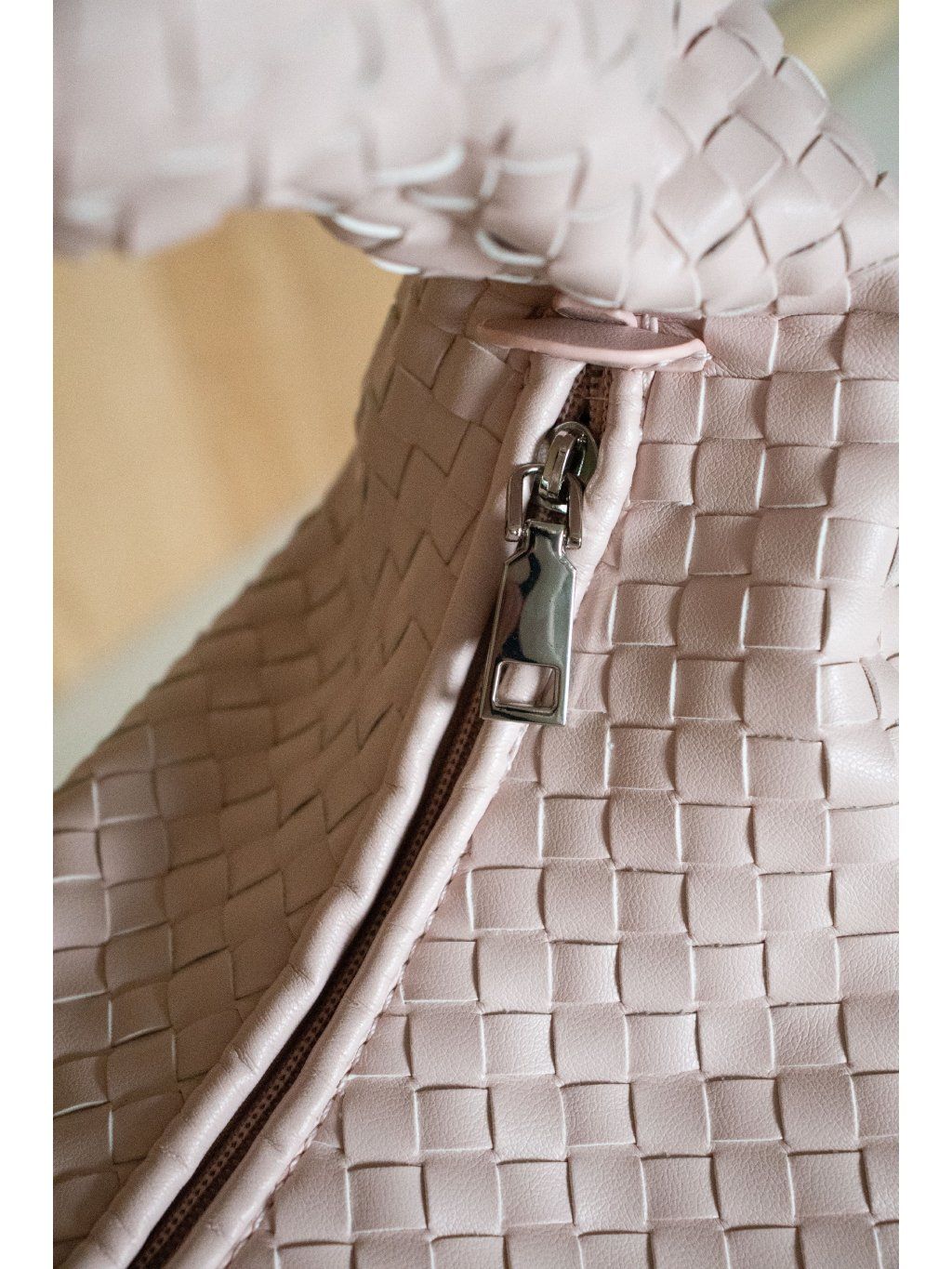 Proplétaná kabelka s detailem uzlu na uchu z eko kůže, tvar " půl měsíce", zapínání na zip v růžové barvě, uvnitř kapsička na zip a jedna otevřená kapsička.