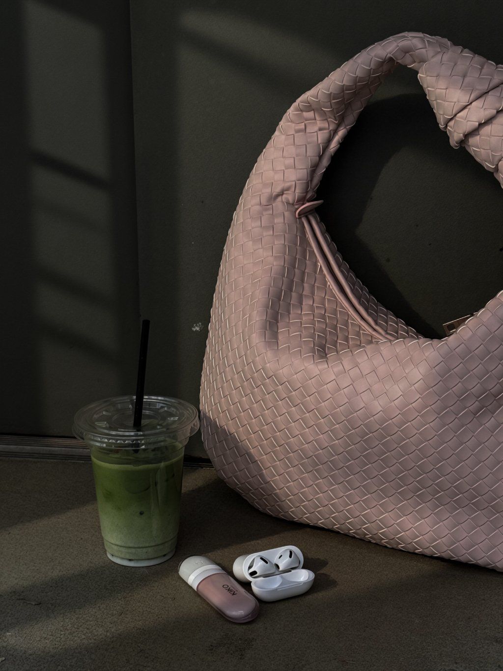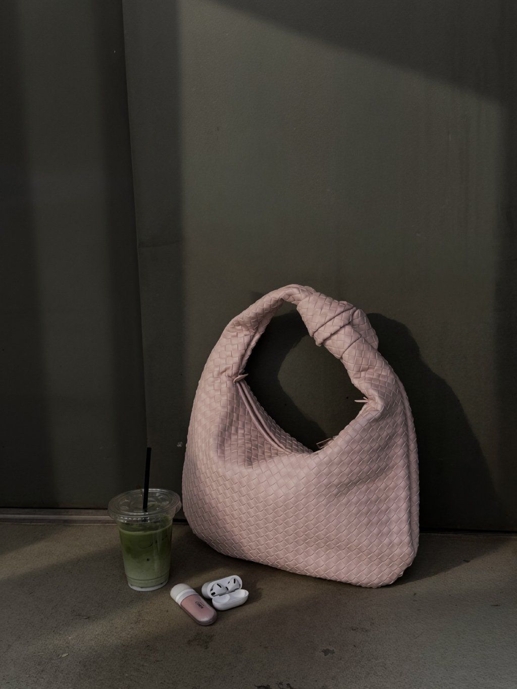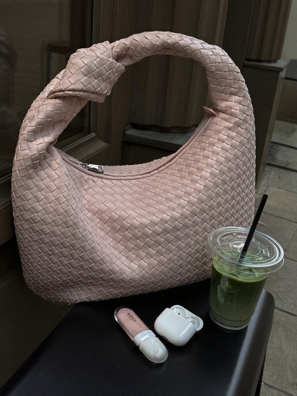 Proplétaná kabelka s detailem uzlu na uchu z eko kůže, tvar " půl měsíce", zapínání na zip v růžové barvě, uvnitř kapsička na zip a jedna otevřená kapsička.