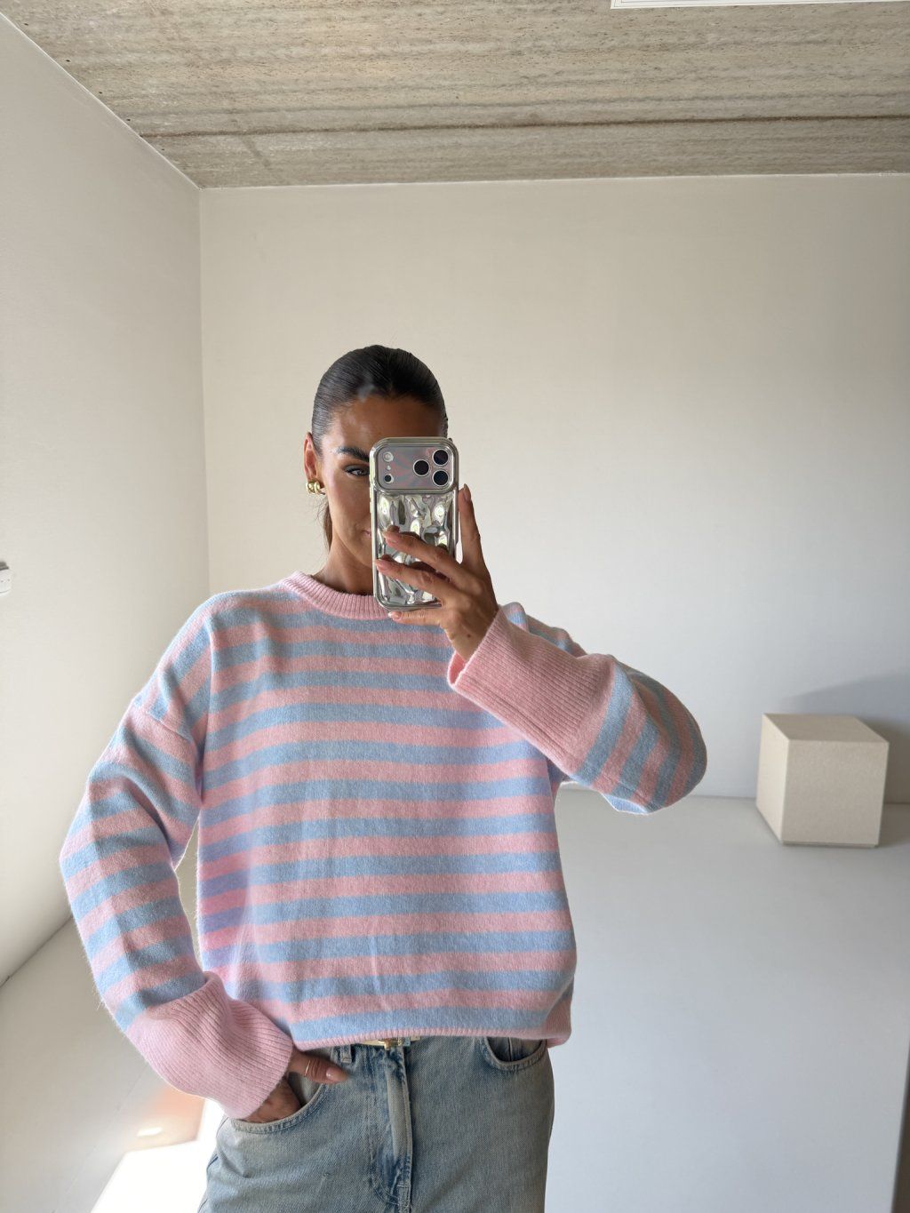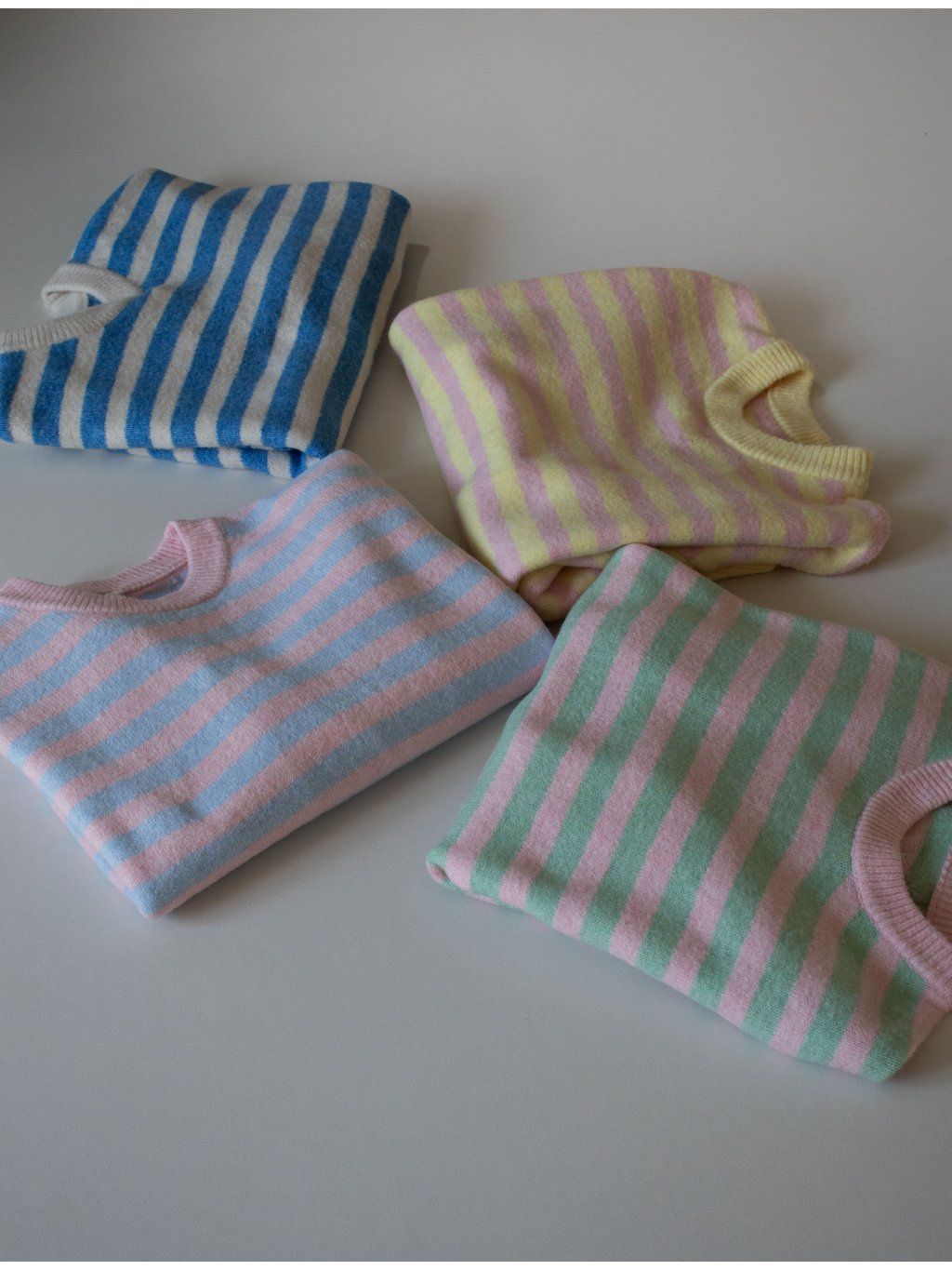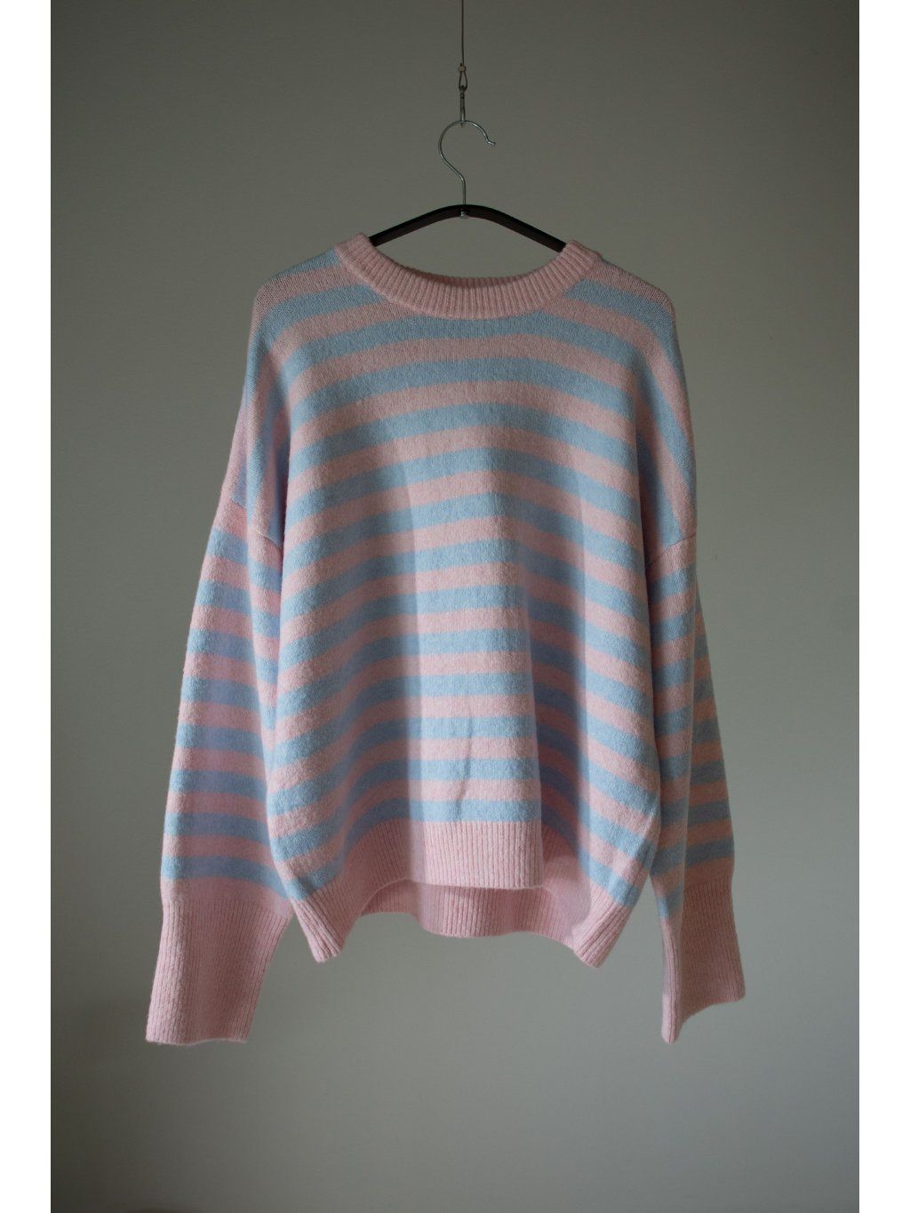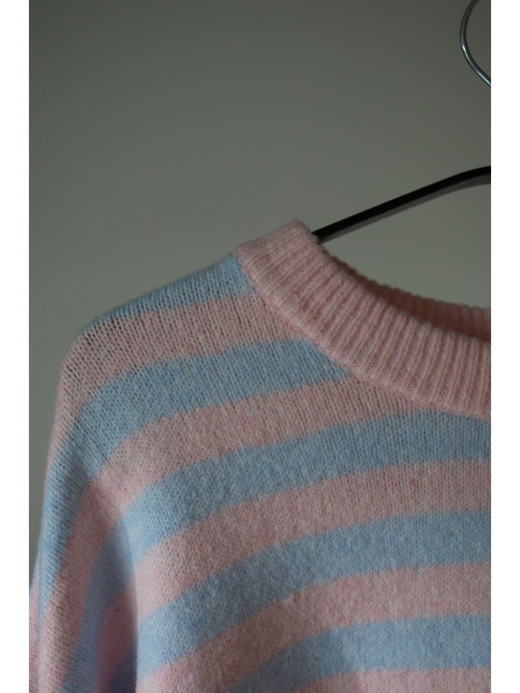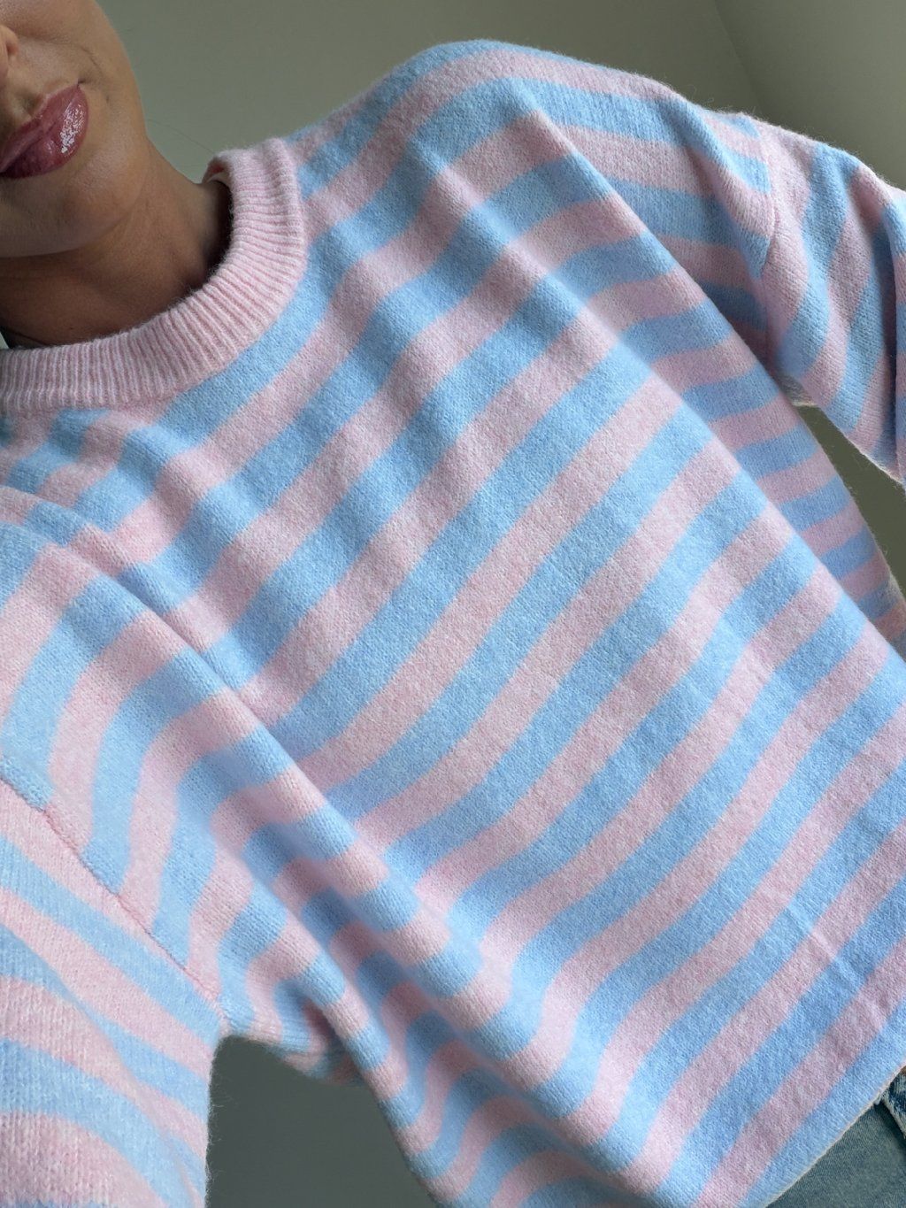 Pruhovaný svetr, dlouhý rukáv s širokými manžetami, mírný kulatý výstřih, délka pod pas. Na spodním lemu, rukávech i u krku je pružný patent.