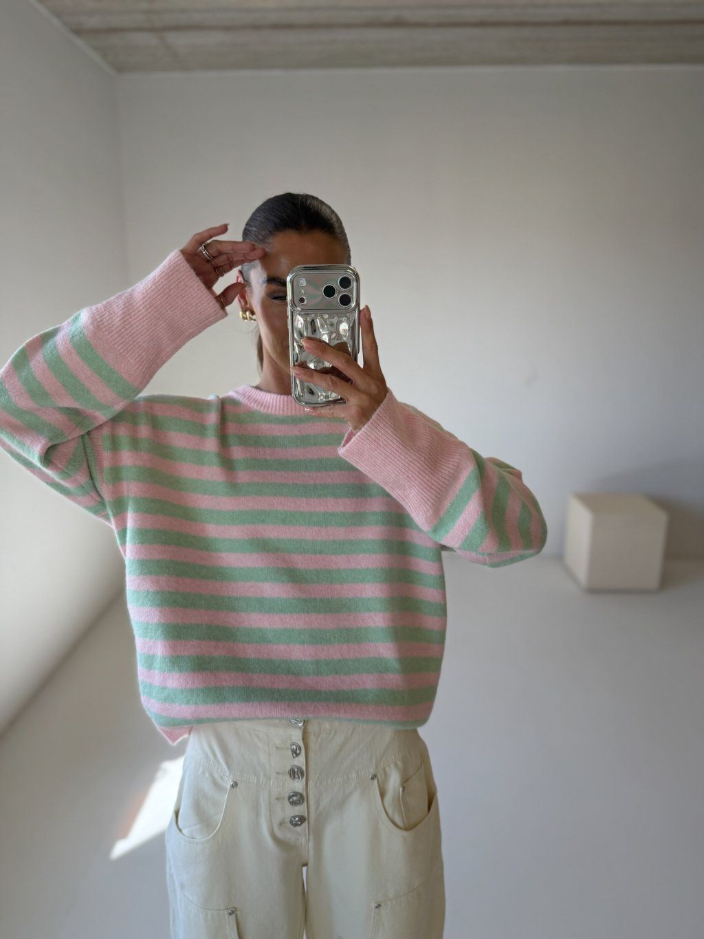 Pruhovaný svetr, dlouhý rukáv s širokými manžetami, mírný kulatý výstřih, délka pod pas. Na spodním lemu, rukávech i u krku je pružný patent.