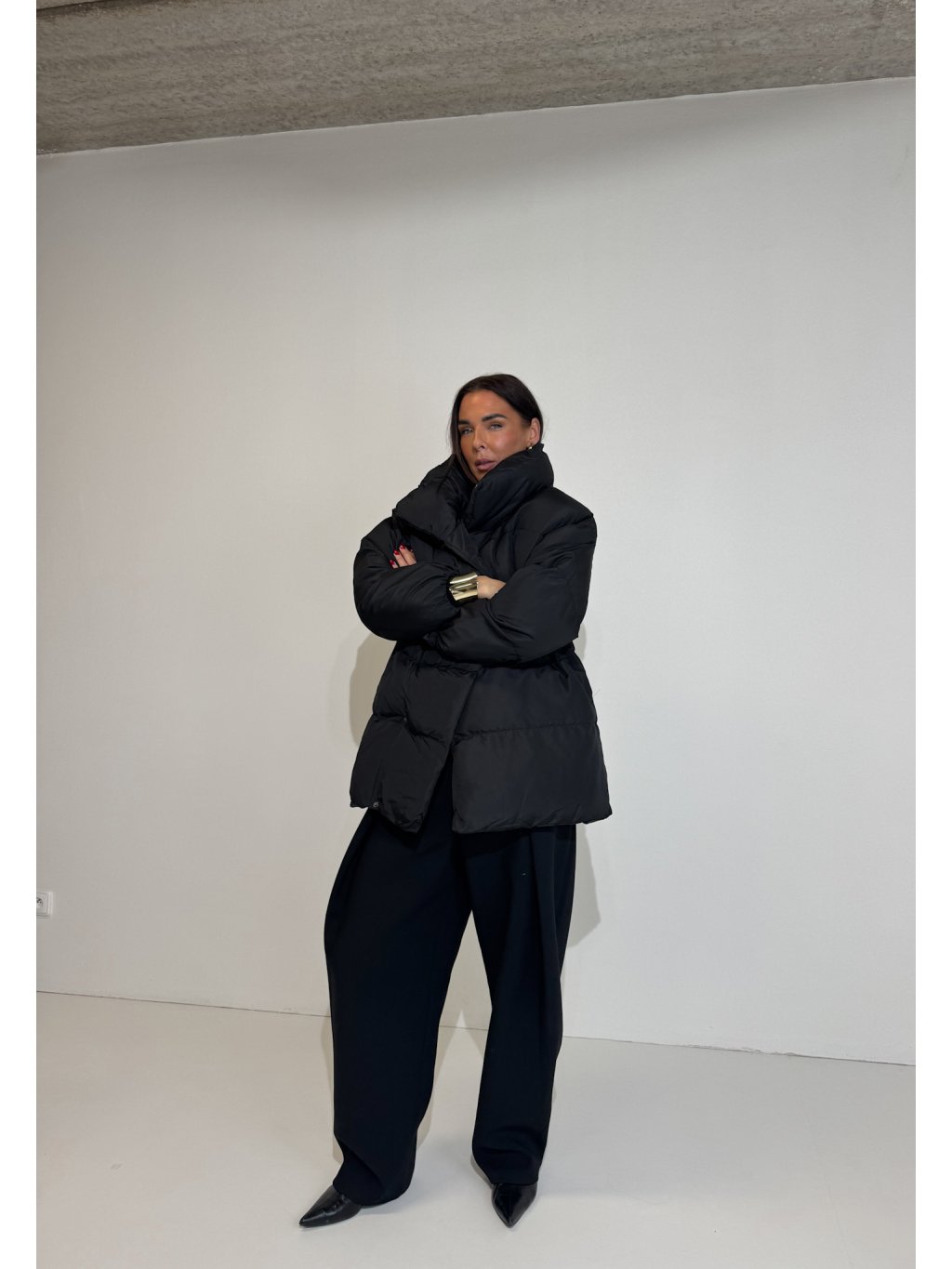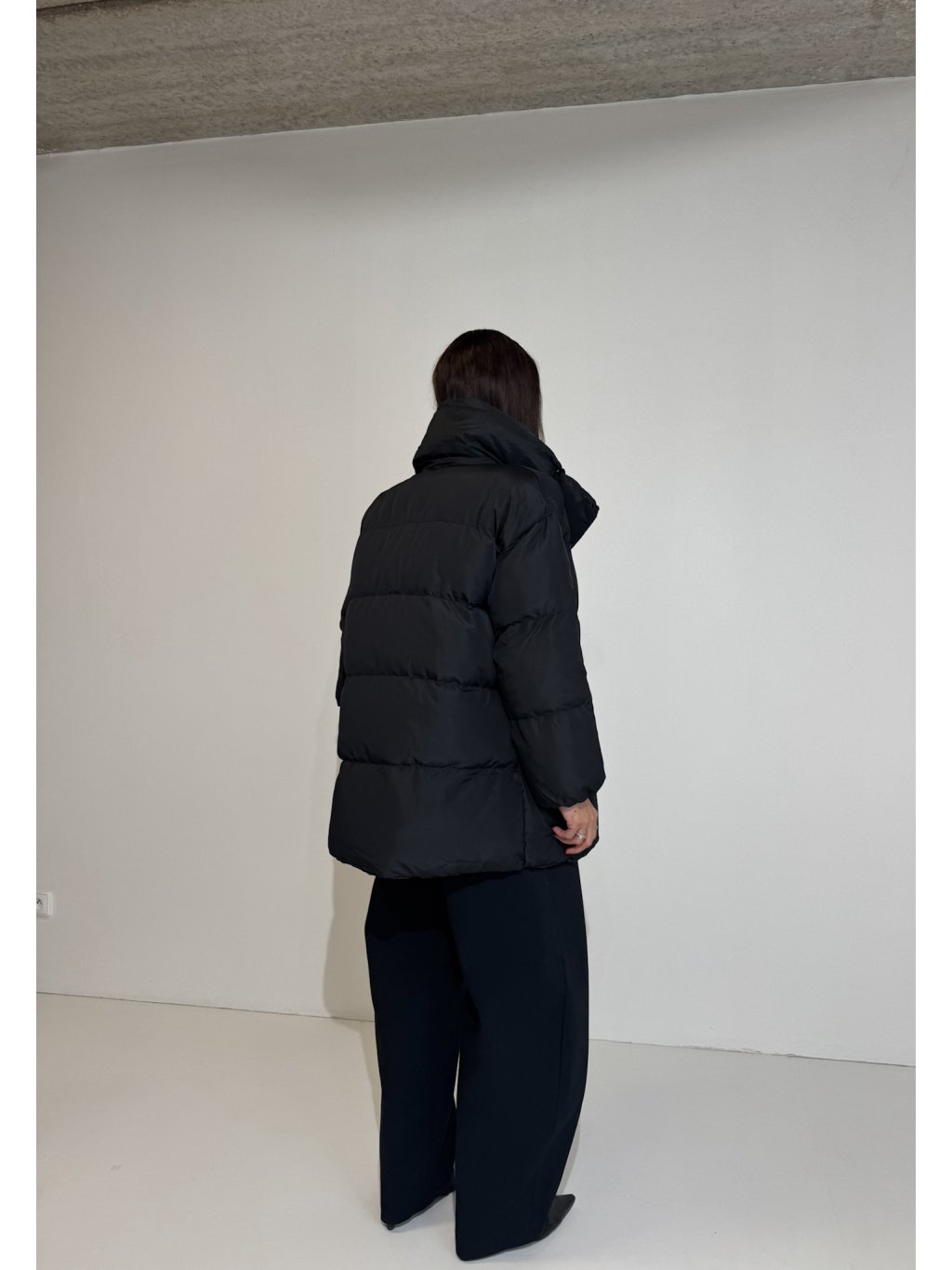 Puff bunda, vysoký límec, zapínání na cvoky, rukávy ukončené gumičkou, podšívka, boční kapsy.